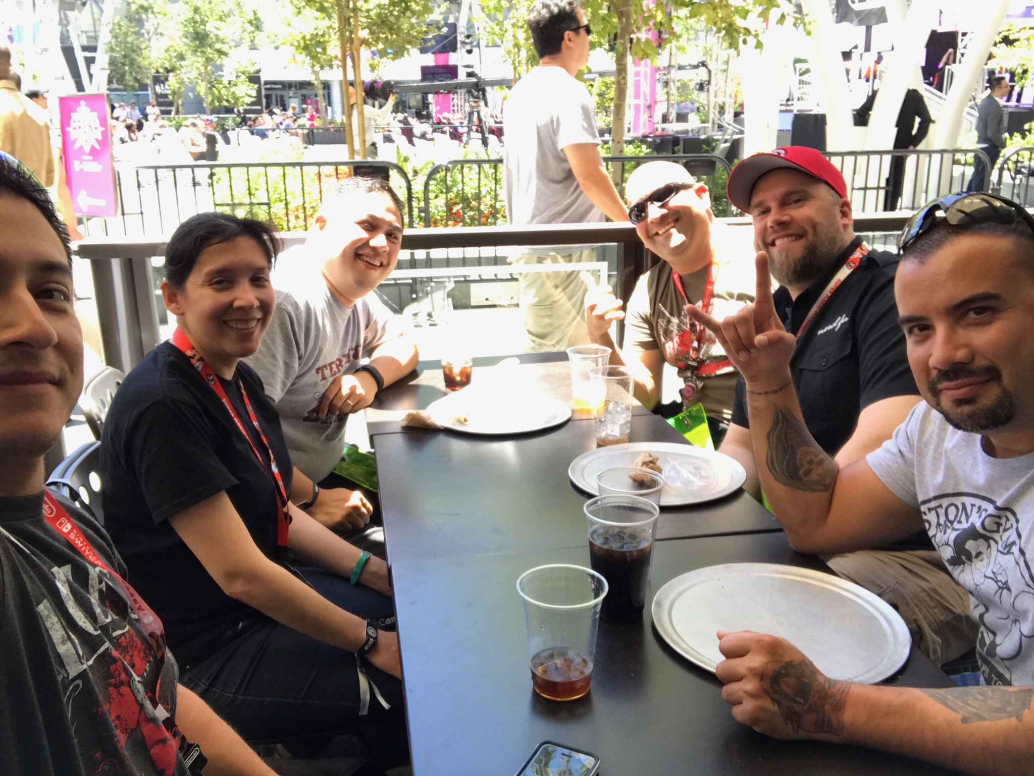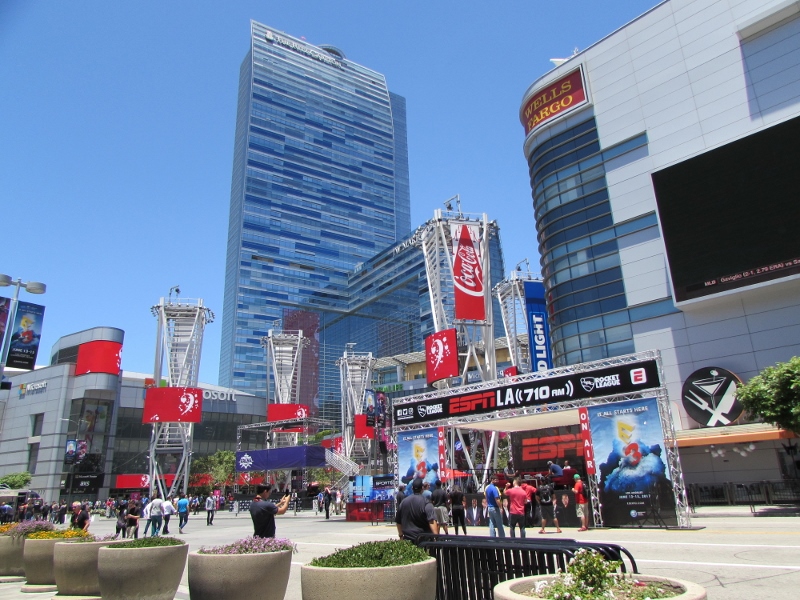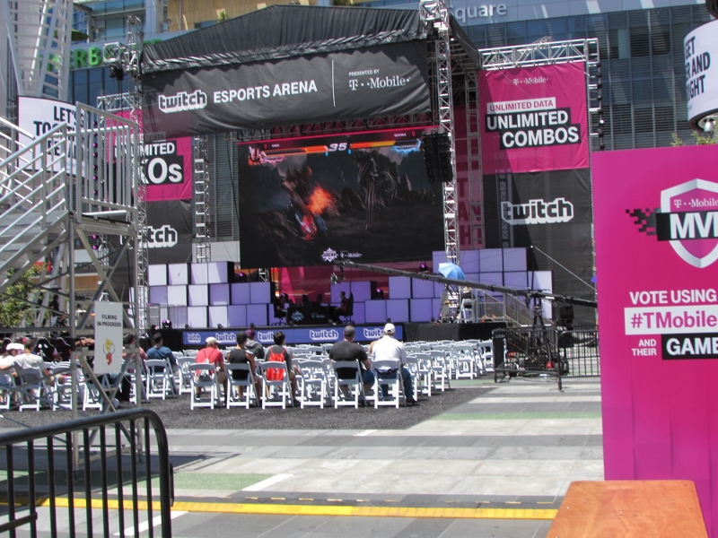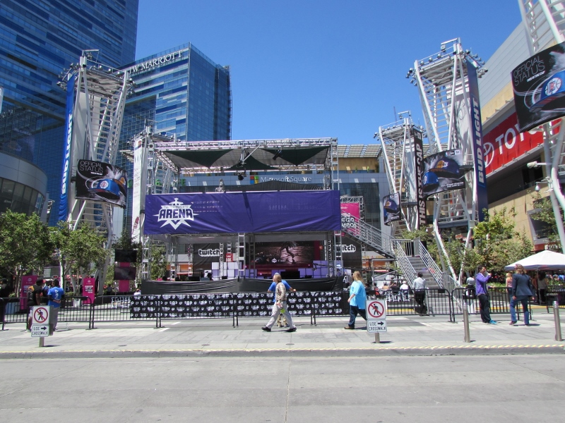 We finally got through the line at this pizza place, which was one of those places where you create your own. I can never finish a whole one of those, so I got a kid’s pizza, which was basically a half pizza! That was the perfect size for me. It was crowded inside the restaurant, but we were able to get a table outside, which was luckily in the shade. Right next to us, the Twitch eSports Arena was going on in the middle of the L.A. Live courtyard. Several chairs were set up, and there were commentators doing some commentary on people playing games. An E3 badge was not required to sit in that area. However, it was mostly empty over there, most likely because all the chairs were out in direct sunlight with no shade.