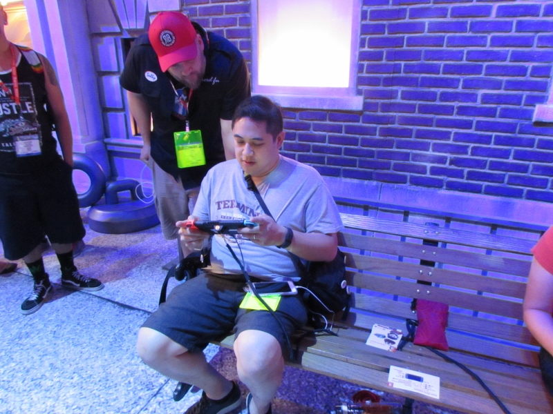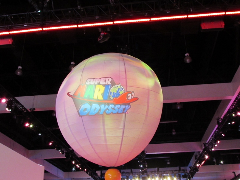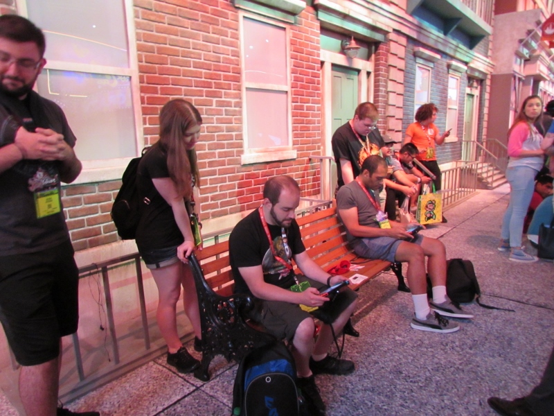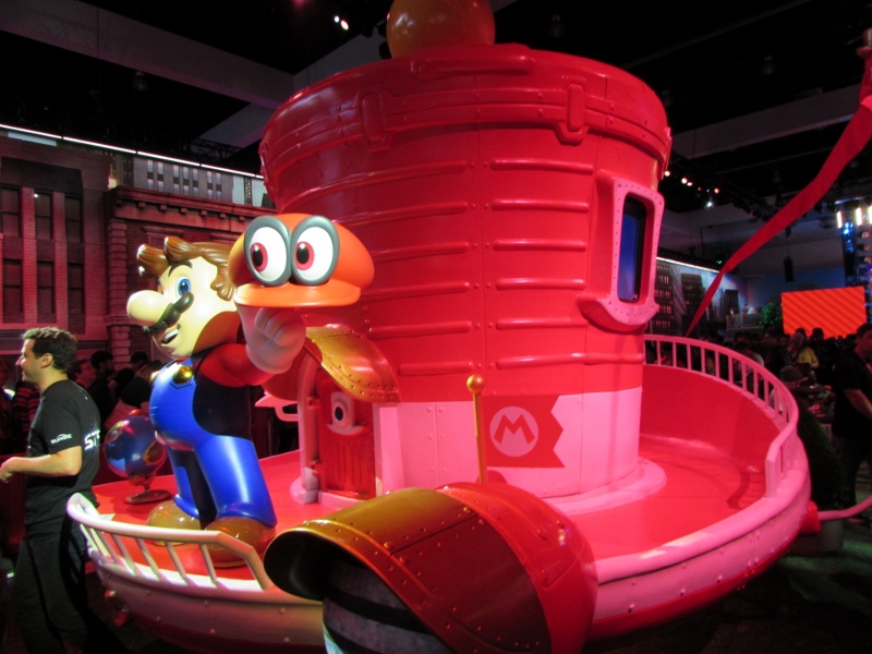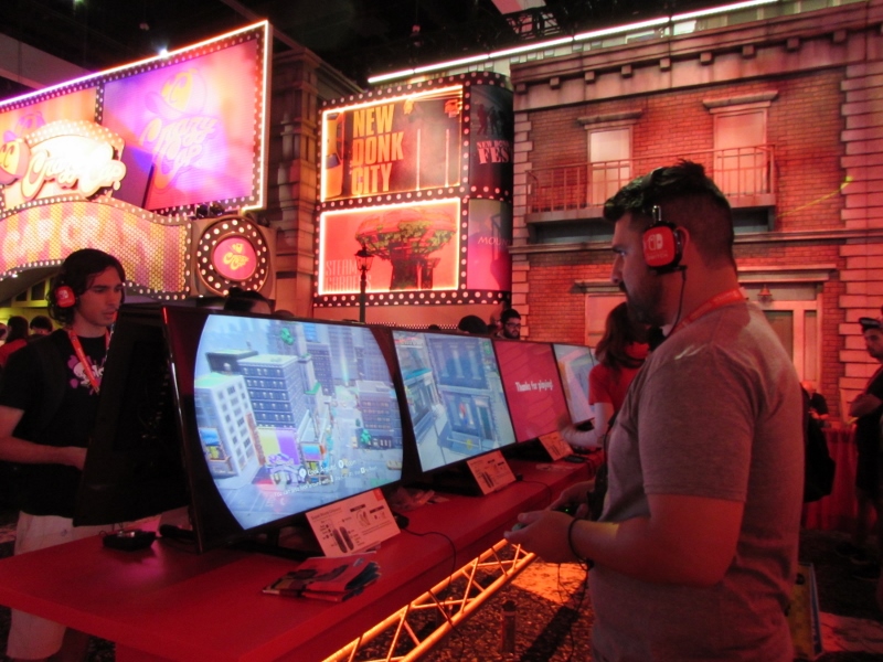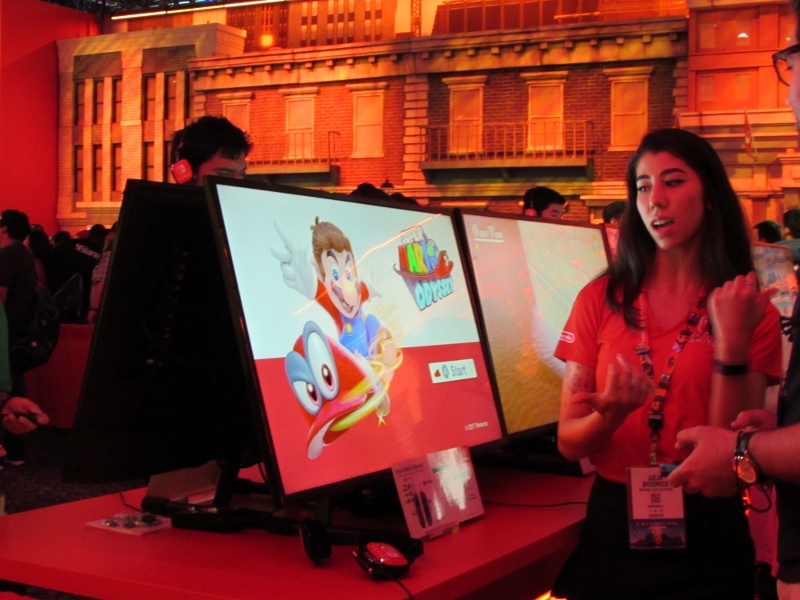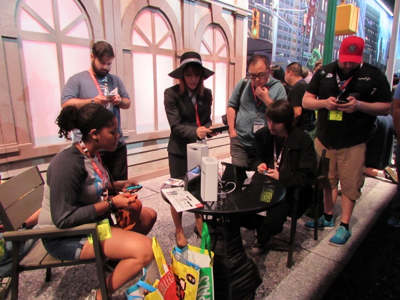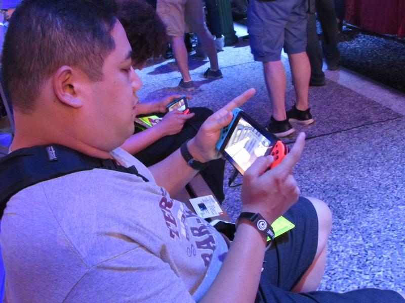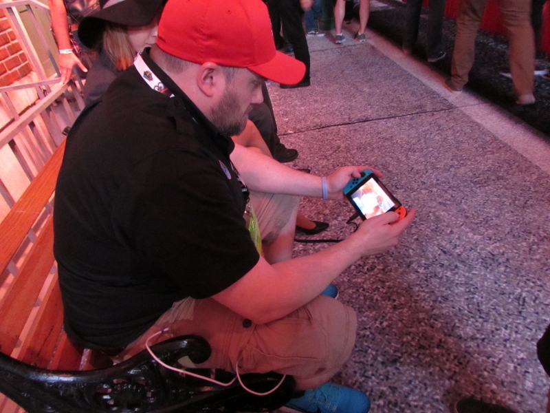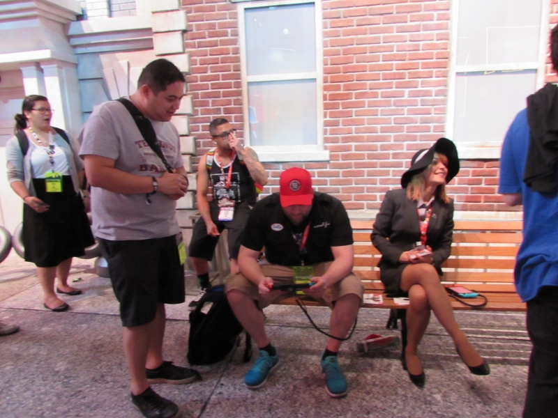 One of the big draws at West Hall was the Nintendo booth — though “booth” is an understatement. It was set up like a city, with the walls looking like the sides of buildings and townhouses. There were also several statuesque displays of Mario and related characters, such as Goombas, Bullet Bill, Chain Chomp, and a tank. The main focus here was on Super Mario Odyssey, the upcoming open world game, which will be released October 27. One option was that you could stand in line to play the game in console mode, on a TV screen. This line wrapped outside the walls of the booth. The other option was more subtle and less obvious — you could wait in line to play it on a handheld portable Switch. At first glance, we didn’t realize that this is what was going on. It just looked like people sitting on a bench playing their own Switch that they brought in. Upon a closer look, you would notice that the Switch devices are tethered to the park bench, and there is a short line of people waiting in line to play Mario Odyssey on each of those Switches! There were only 3 people in line for the Switch at the end, so Corgi and Sully sat down and waited in line, while I walked around West Hall for a bit.