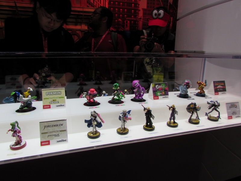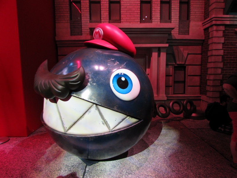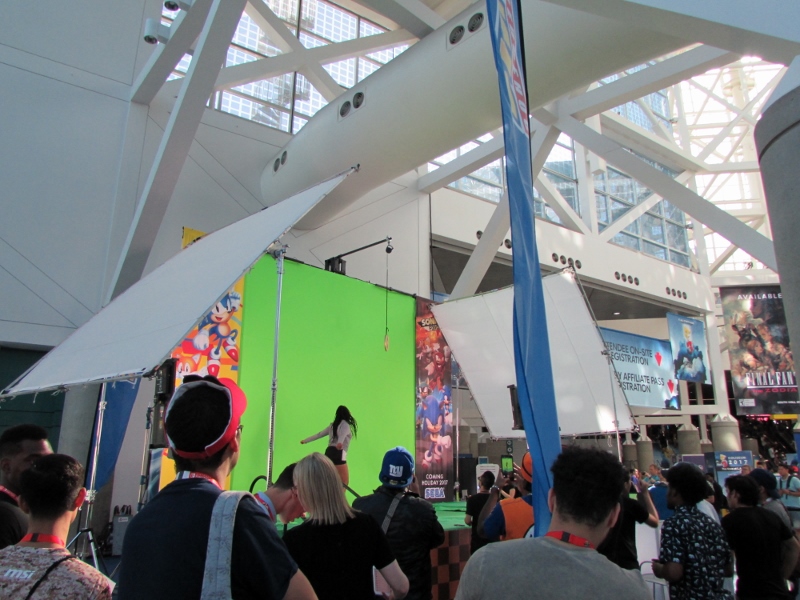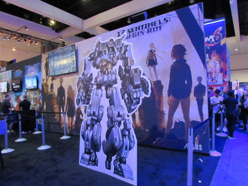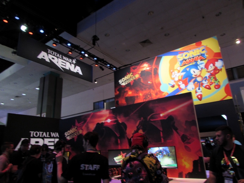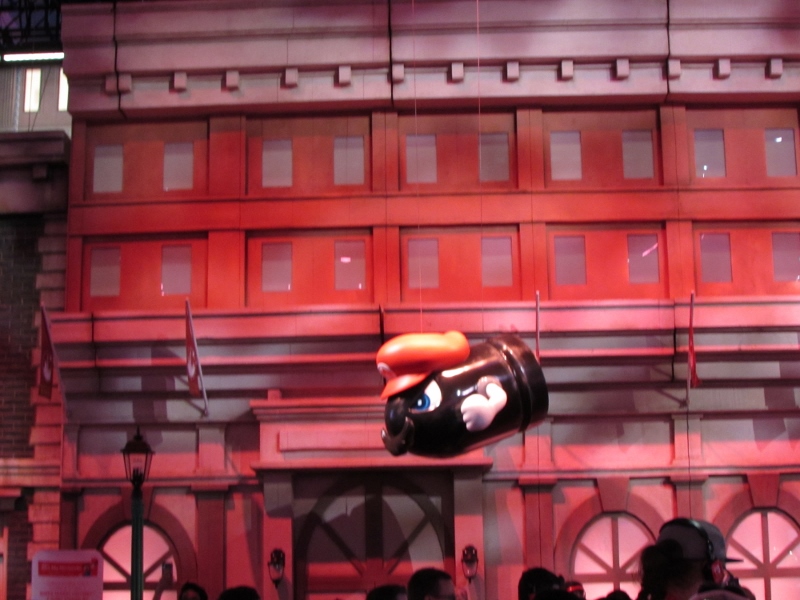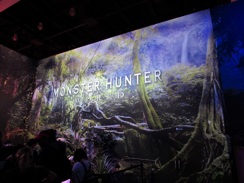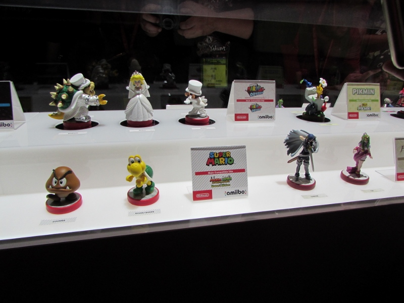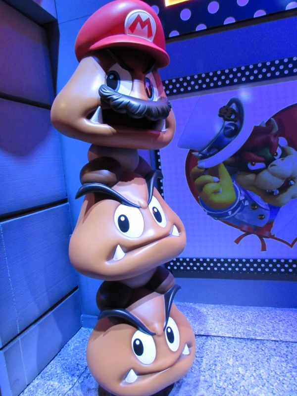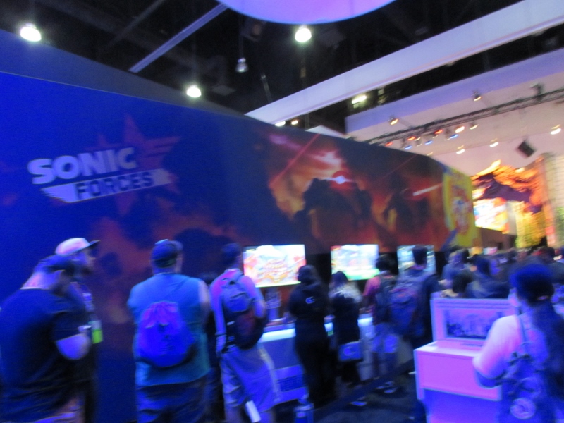 One of the big draws at West Hall was the Nintendo booth — though “booth” is an understatement. It was set up like a city, with the walls looking like the sides of buildings and townhouses. There were also several statuesque displays of Mario and related characters, such as Goombas, Bullet Bill, Chain Chomp, and a tank. The main focus here was on Super Mario Odyssey, the upcoming open world game, which will be released October 27. One option was that you could stand in line to play the game in console mode, on a TV screen. This line wrapped outside the walls of the booth. The other option was more subtle and less obvious — you could wait in line to play it on a handheld portable Switch. At first glance, we didn’t realize that this is what was going on. It just looked like people sitting on a bench playing their own Switch that they brought in. Upon a closer look, you would notice that the Switch devices are tethered to the park bench, and there is a short line of people waiting in line to play Mario Odyssey on each of those Switches! There were only 3 people in line for the Switch at the end, so Corgi and Sully sat down and waited in line, while I walked around West Hall for a bit.