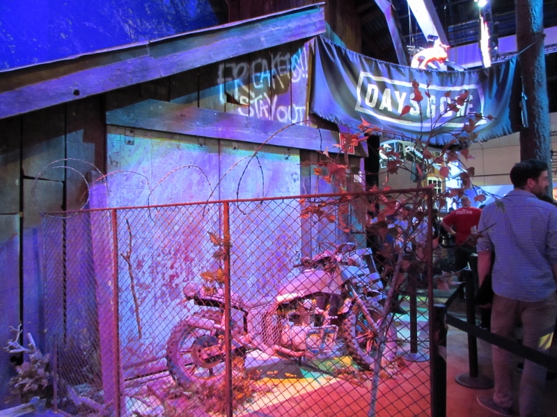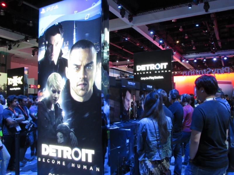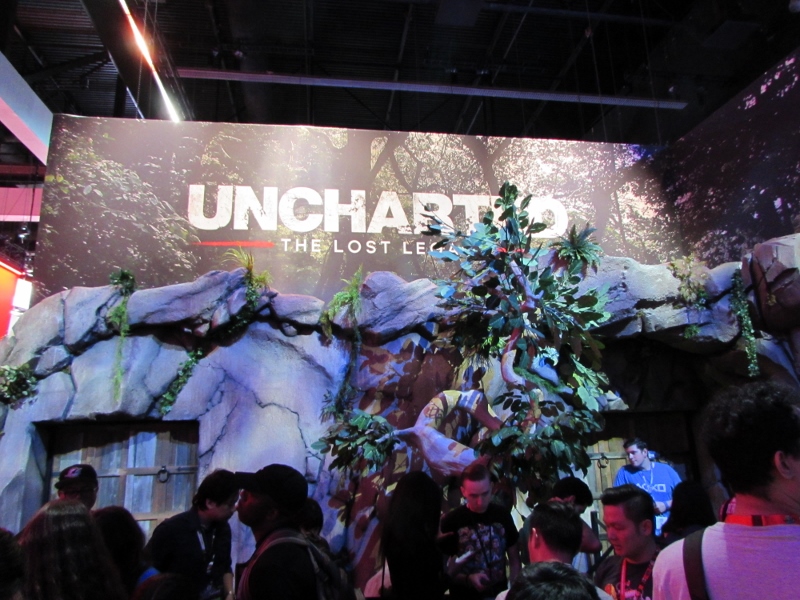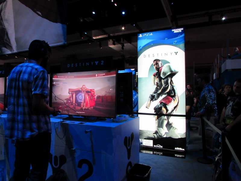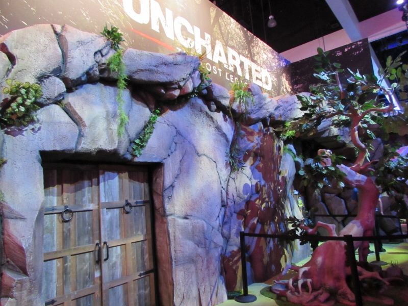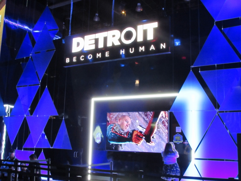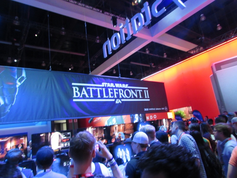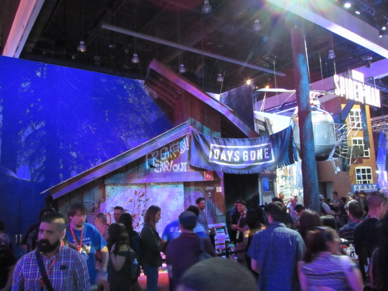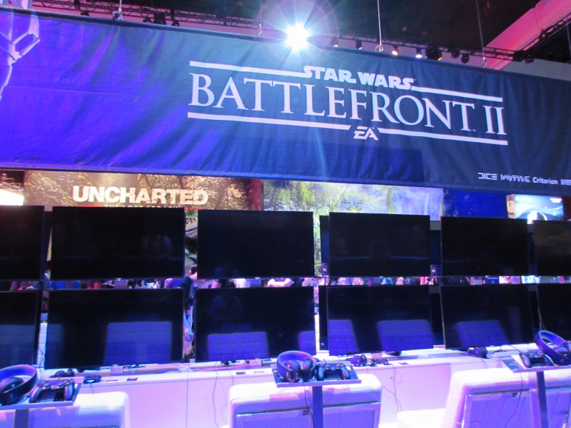 We then went over to the PlayStation booth (again, “booth” is a vast understatement), which was the other big draw in West Hall. The lines weren’t quite as crazy over here though, since PlayStation had their app system to take care of that. So the only people in line would have been people waiting for their time slot. It was just about time for a Star Wars Battlefront II time slot to start, but the QR code wasn’t loading for the people who had that time slot for some reason, so the demo area was empty. Not sure how long that problem lasted. Other demos were set up, such as Destiny 2, Call of Duty: WW2, and the various other ones for which you had to somehow impossibly book a time through the app. Corgi took some video of Destiny 2 gameplay, which you can watch here. There were elaborate displays set up for various games, including Spider-Man, Days Gone, and Uncharted, for which there were theater experiences. And just like the demos, you also were supposed to reserve a time through the app. But when we tried to do that, there was just a spinning circle for any of the times we tried to look at. Probably because these were also already booked well in advance. Oh well.