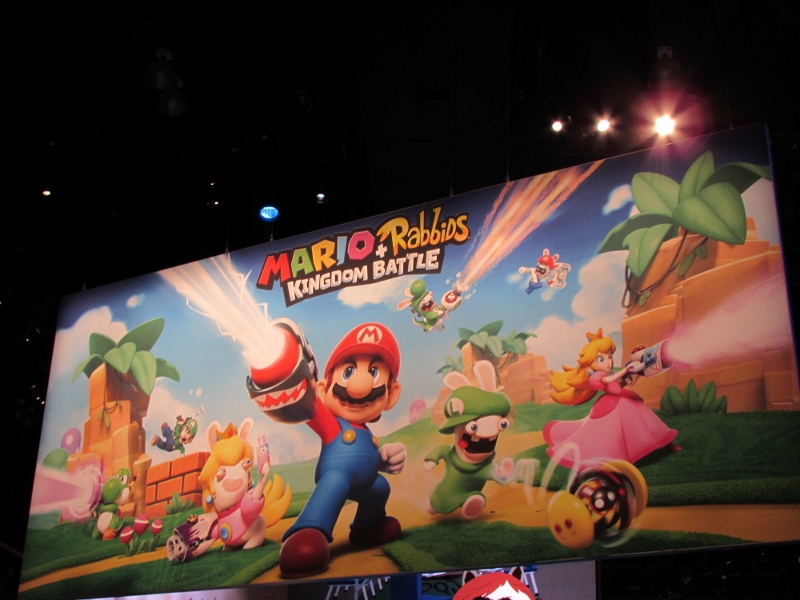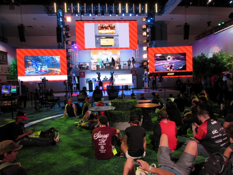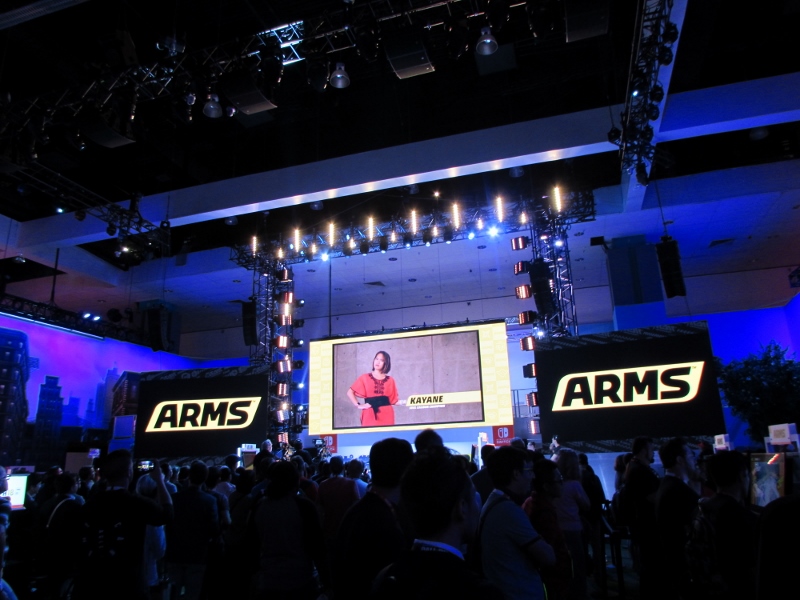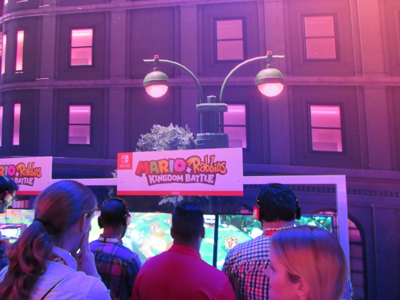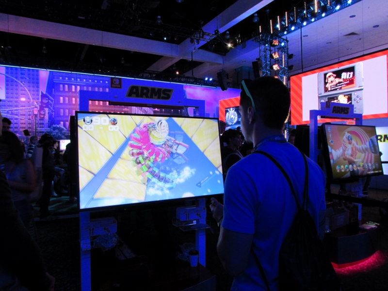 After that, we wandered around the Nintendo booth some more, looking around at what else they had going on. They had demos for Mario + Rabbids Kingdom Battle, Arms, FIFA, Splatoon 2, and Pokemon, all of which had lines. A tournament for Arms was just starting, for which there were commentators on hand.