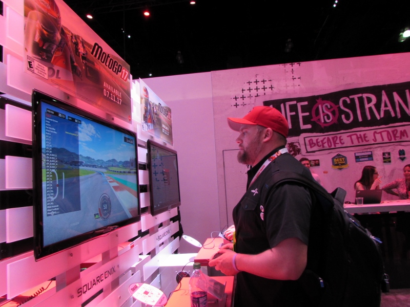 We then heard from the other guys, who had gone back over to the South Hall, so we headed over there to meet back up with them. I hadn’t been over to the Square Enix or Capcom booths at South Hall yet, so that was cool with me. Before looking for Cheezmo, No Dice, and Uncle Jesse, we stopped by Squire Enix first, which had a trailer going for Final Fantasy. Then we found a demo set up that had three open spots, so Corgi, Sully, and I stepped up to play. It was a motorcycle racing game. None of us were particularly fond of it. We quickly moved on.