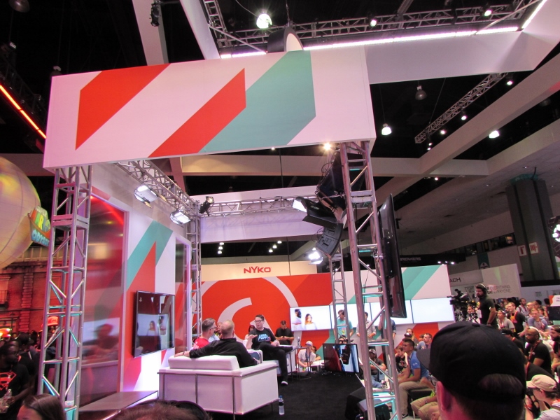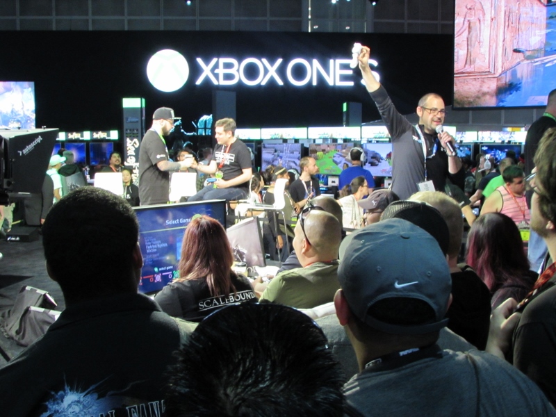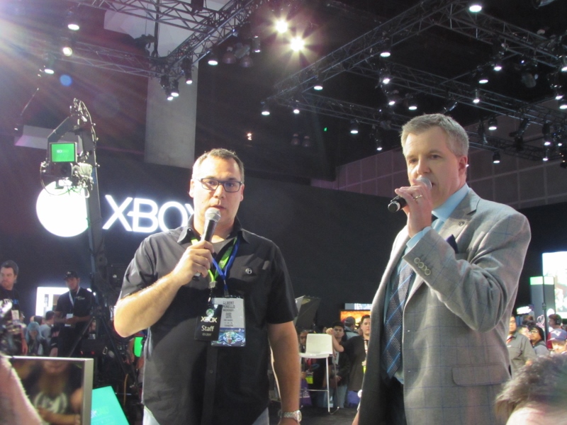 The guys had relocated to the Xbox booth, so we headed over there. Right as we got there, a presentation started up on the Xbox stage, featuring “Major Nelson” (Larry Hryb, Director of Programming for XBox Live) and Albert Penello (Leads Marketing for Xbox Consoles). An Xbox game developer named Bill Stillwell also joined in. They quickly launched into taking questions from the crowd, and every time someone asked a question, they were rewarded with a prize. One of the questions was whether there would be any games exclusive to the new console, but the answer was no, because that would go against everything they stand for.