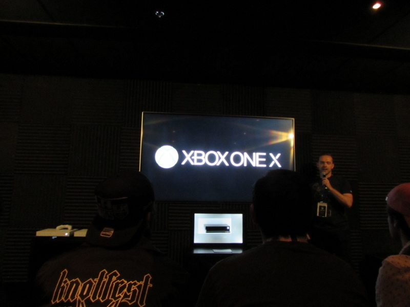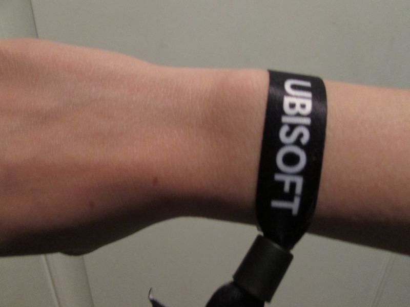 Inside the Xbox Theater were three rows of seats, and at the front of the room was the new Xbox One X hooked up to a large TV screen. No photos were allowed once the presentation started. Several different people then spoke to us. The first person talked about the new and improved Xbox One X, and showed us the difference between HD and 4K, which is what the new Xbox One X supports. They also demonstrated the Dolby Atmos surround sound system in the room. Next up, a couple of Minecraft game developers talked to us about the improvements they’ve been able to make in the game, thanks to 4K, and showed us the differences. Additionally, a Gears of War developer took us through a little bit of the improved game, and a Forza 7 (car racing) game developer showed us a little of that game as well. As we exited the theater, we spotted the rest of our crew in line for the theater, so we knew we had some time to kill while they did that. I walked up and started playing F1, a car racing game, since there was no wait. Somehow I “broke the game” — my car got stuck, and no matter what I did, I couldn’t get it unstuck, nor could Corgi. A staff member had to come over and reset the track! Oops. Then Corgi and I wandered over to Ubisoft while we waited on the others.