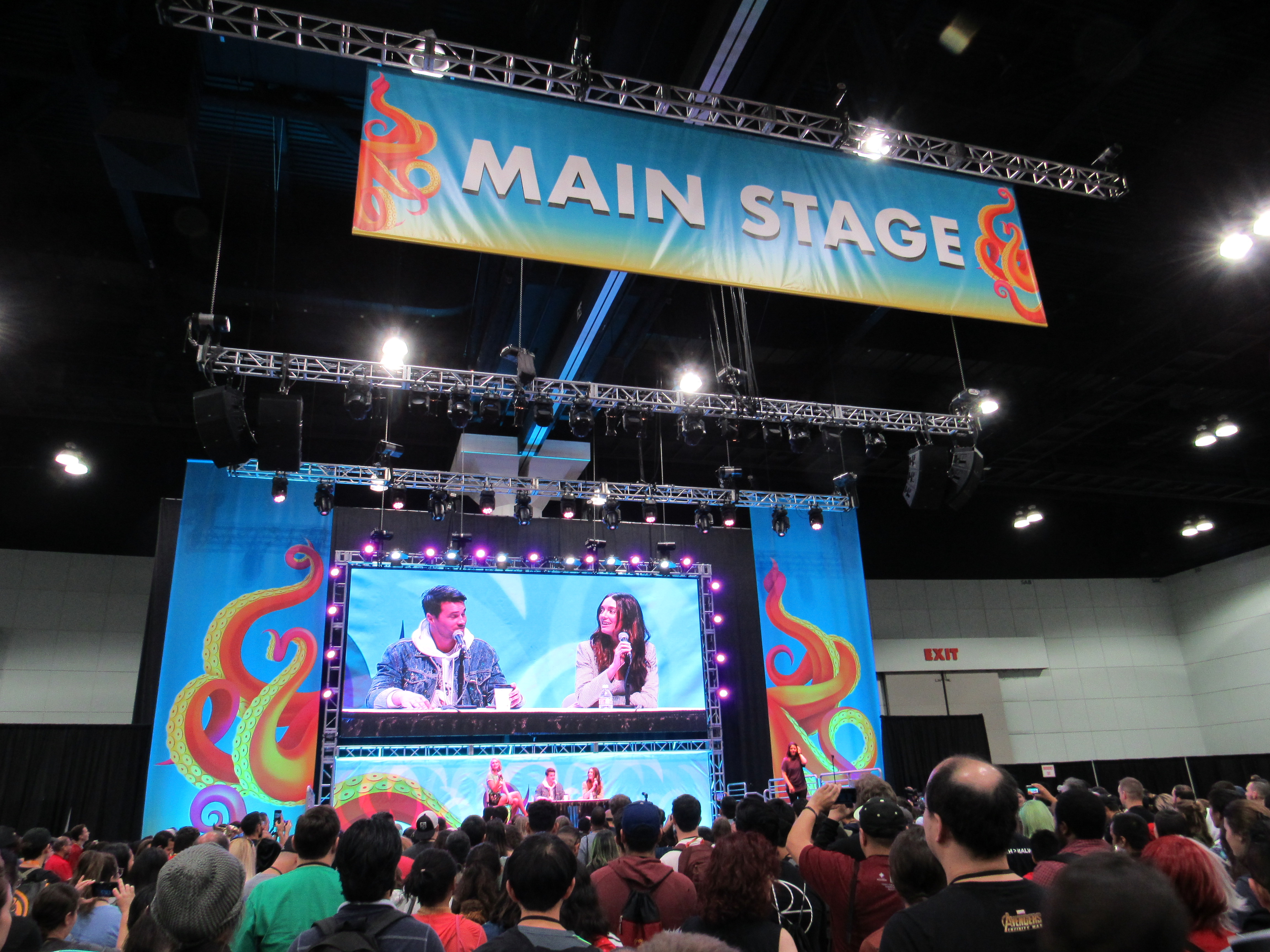 The panels we attended were all on the Main Stage. If you’re not familiar with LA Comic Con, it is unique in the sense that the Main Stage is located on the show floor, so anyone is able to walk up and stand in the crowd in front of the stage. While this may allow for more people to have access to these panels, at the same time, there is no seating, except for ADA and VIP. The ADA section, which is on the floor, close to the stage, was usually full, though it didn’t seem like there was any staff policing the area to make sure that only ADA attendees sat there. The VIP section is located a little further away from the stage, on a raised platform. I only ever saw a handful of people sitting there.