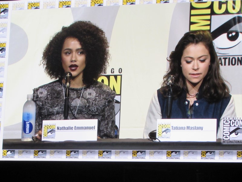 Another question was what was the role the panelists took that scared them to take it. Nielsen’s answer was her character in Boss because her character was unhappy and terrifying, while in her real life she was very happy. Emmanuel talked about being in Maze Runner: The Scorch Trials and how, being a British actress, that was scary for her as her first American film, because it was intimidating doing her American accent in front of Americans. Lawless said that all of her roles have scared her, but that Lucretia (Spartacus) was the scariest role she’s ever had. Maslany said that the fear is what makes her excited about a part — if she’s not afraid, then she’s not interested. Baccarin’s said that her biggest fear is having to be emotional.