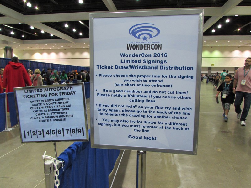 So if you’ve never done a ticketed signing for a CCI (Comic-Con International) event, here’s how it works. There are several chutes, each dedicated to a particular signing, and you find the one you want, and get in that line. When you get to the front, there’s a volunteer standing there with a bag full of tickets. Some of them are “winning” tickets, with a particular symbol on them, and the others are blank. If you pull a winning ticket, you go forward, present your ticket, and are given a wristband. If it’s a losing ticket, you can go to the back of the line and try again.
