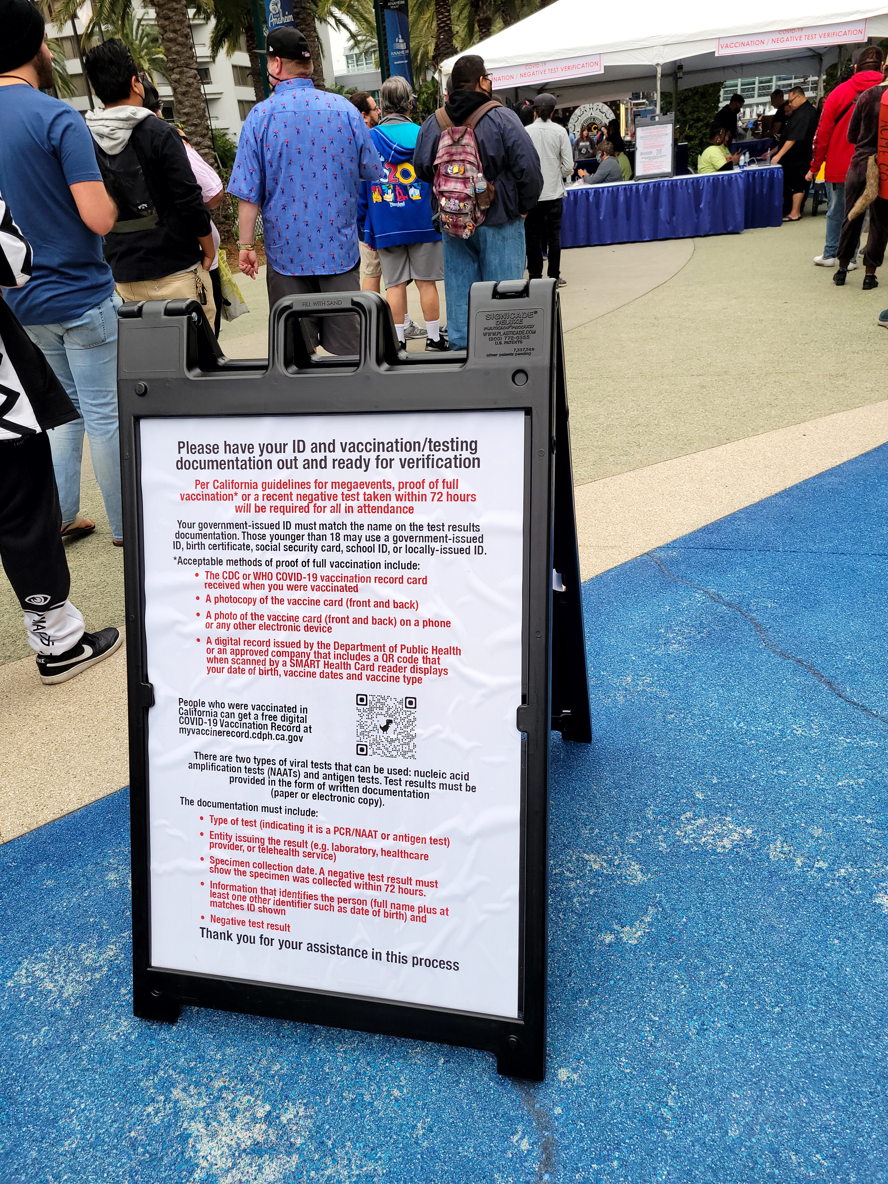 Upon arrival, there were three verification checkpoints around the perimeter of the Anaheim Convention Center where attendees would present their ID, along with their proof of vaccination or negative COVID test. Once this information was verified, attendees received a pink wristband. The whole process went very quickly. There were maybe 15 people in front of me when I got in line, and I’d say that the entire duration from getting in line to getting my wristband was about 5 minutes. I arrived slightly before 10am on Saturday, so it may have been a bit busier later.