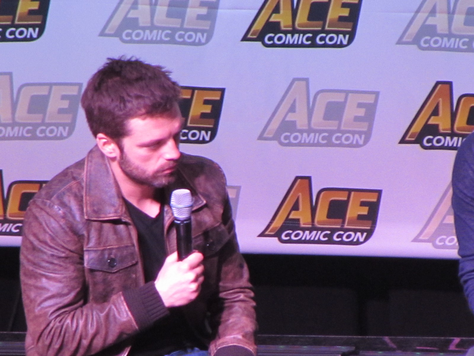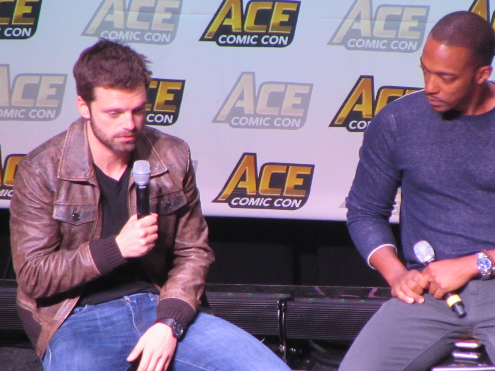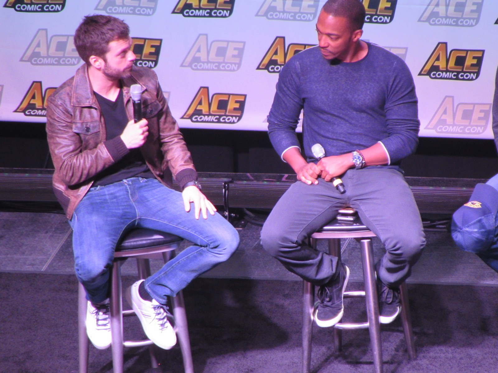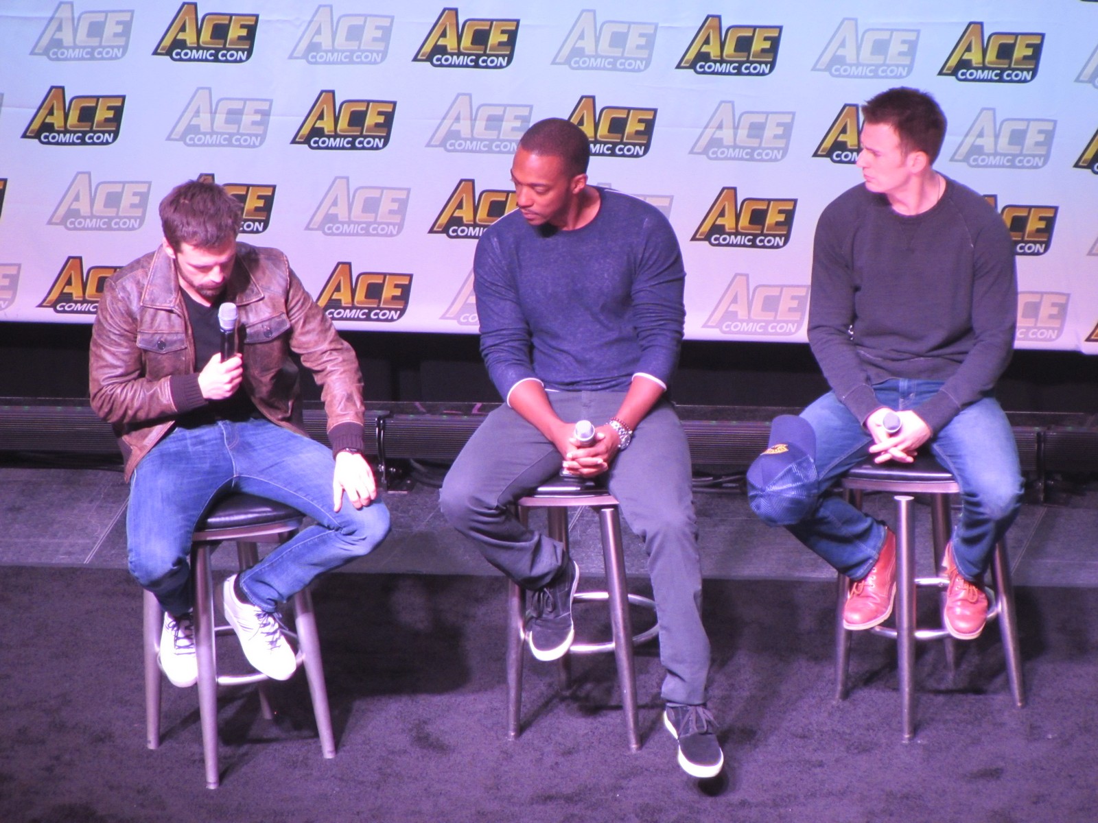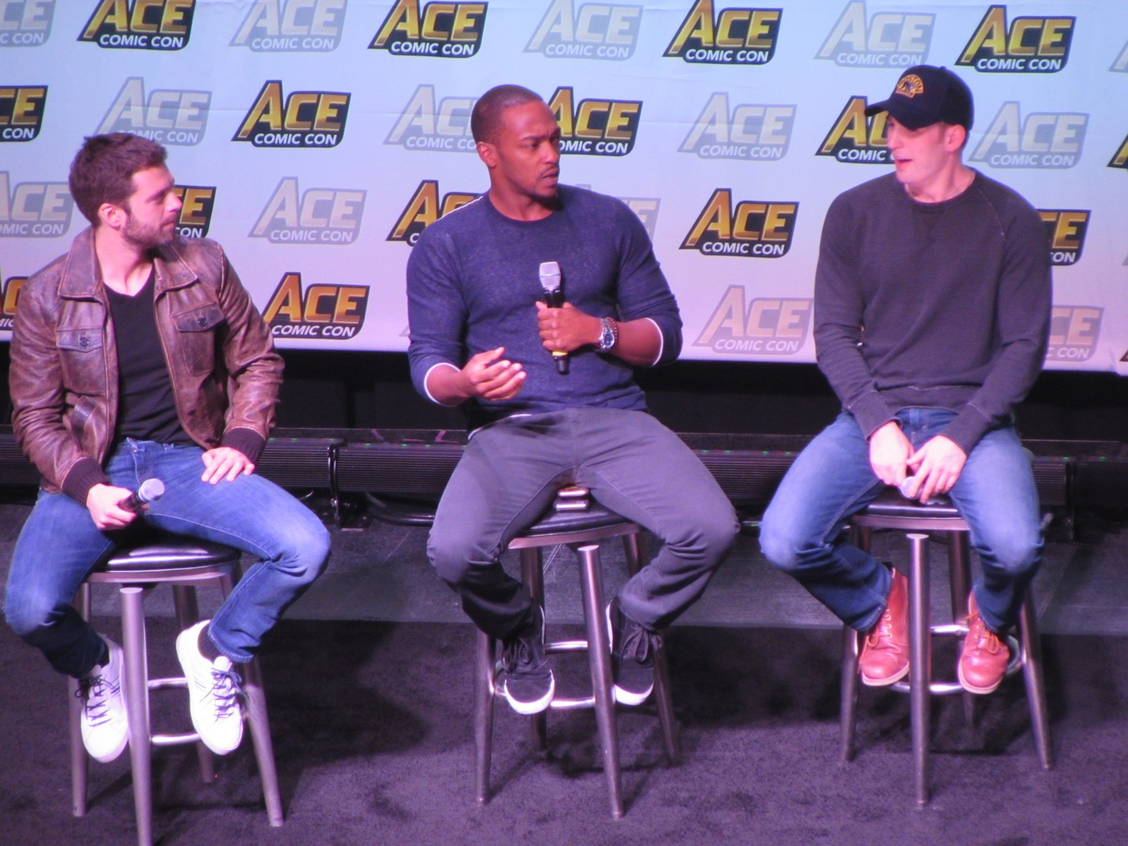 The Captain America panel kicked off the first day of Ace Comic Con Arizona, which took place at the Gila River Arena in Glendale January 13-15, 2018. (Click here if you missed our article about getting there and getting in.) The panel, which started at 12:30pm on Saturday, January 13, featured Sebastian Stan (Bucky Barnes/Winter Soldier), Anthony Mackie (Sam Wilson/Falcon), and Chris Evans (Steve Rogers/Captain America).