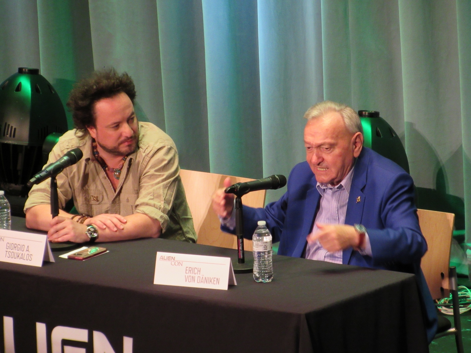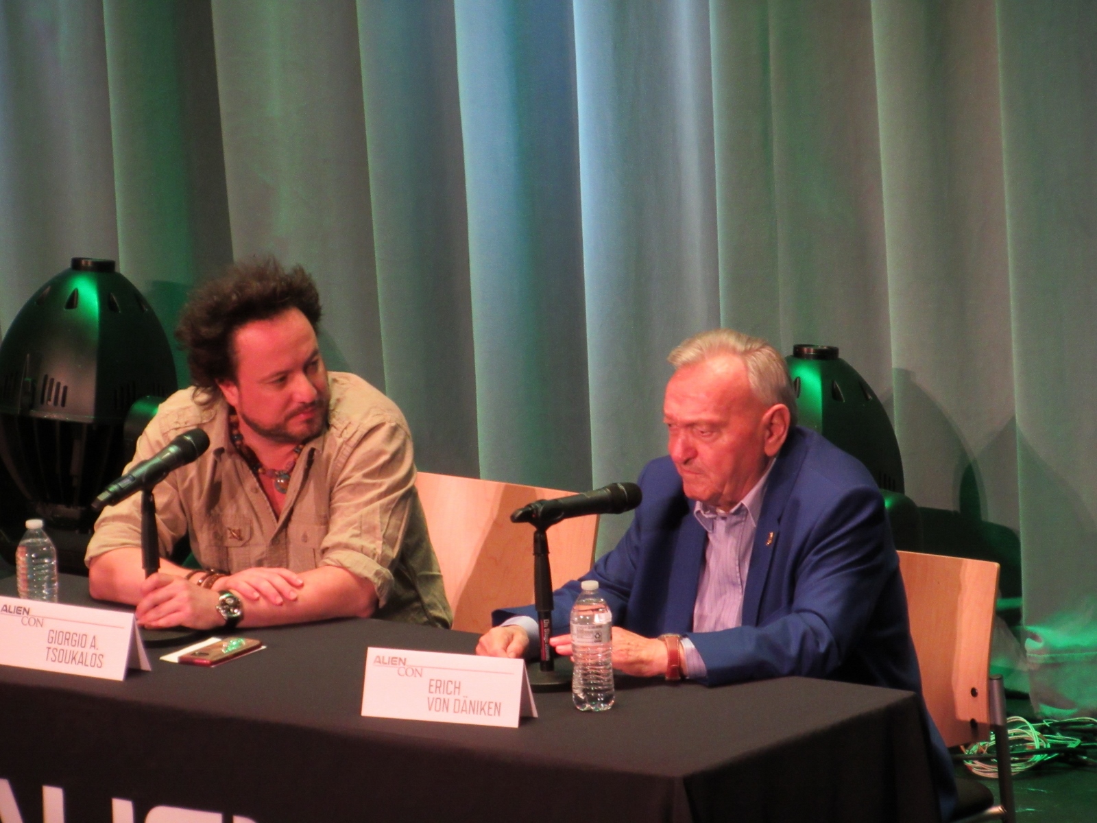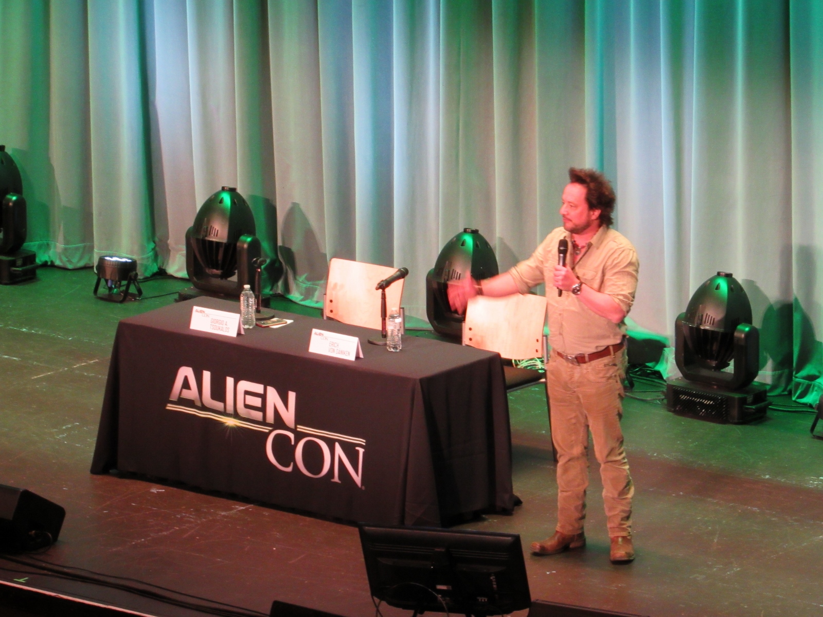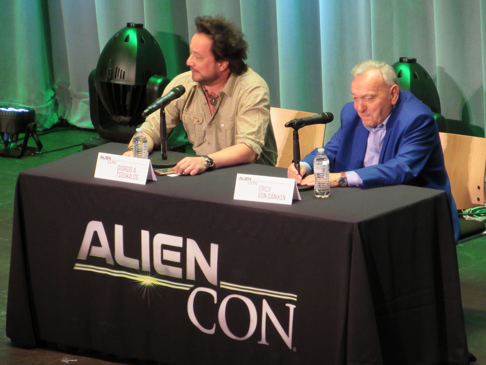 The panel was titled Ancient Astronaut Theory with Erich von Däniken and Giorgio A. Tsoukalos, and it was packed. Robert Clotworthy, narrator of Ancient Aliens, came out on stage first and did an intro before Giorgio A. Tsoukalos came out on stage and did his own introduction, then Erich von Däniken came on stage.