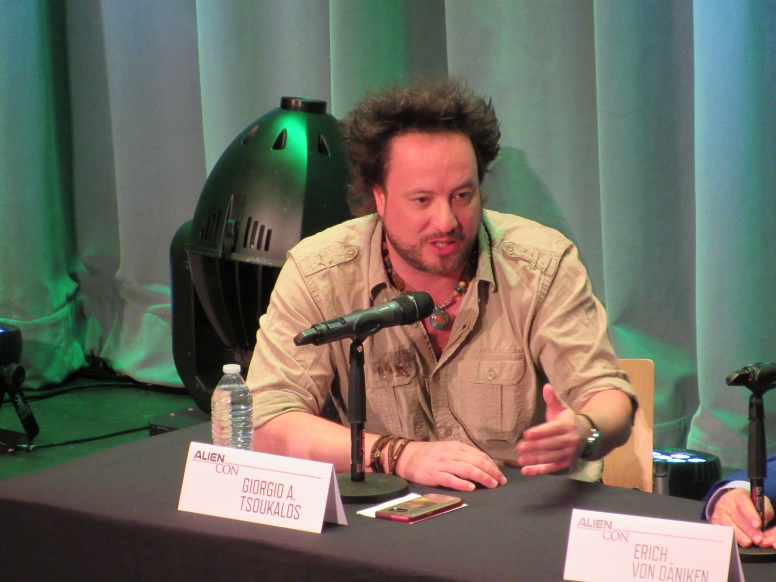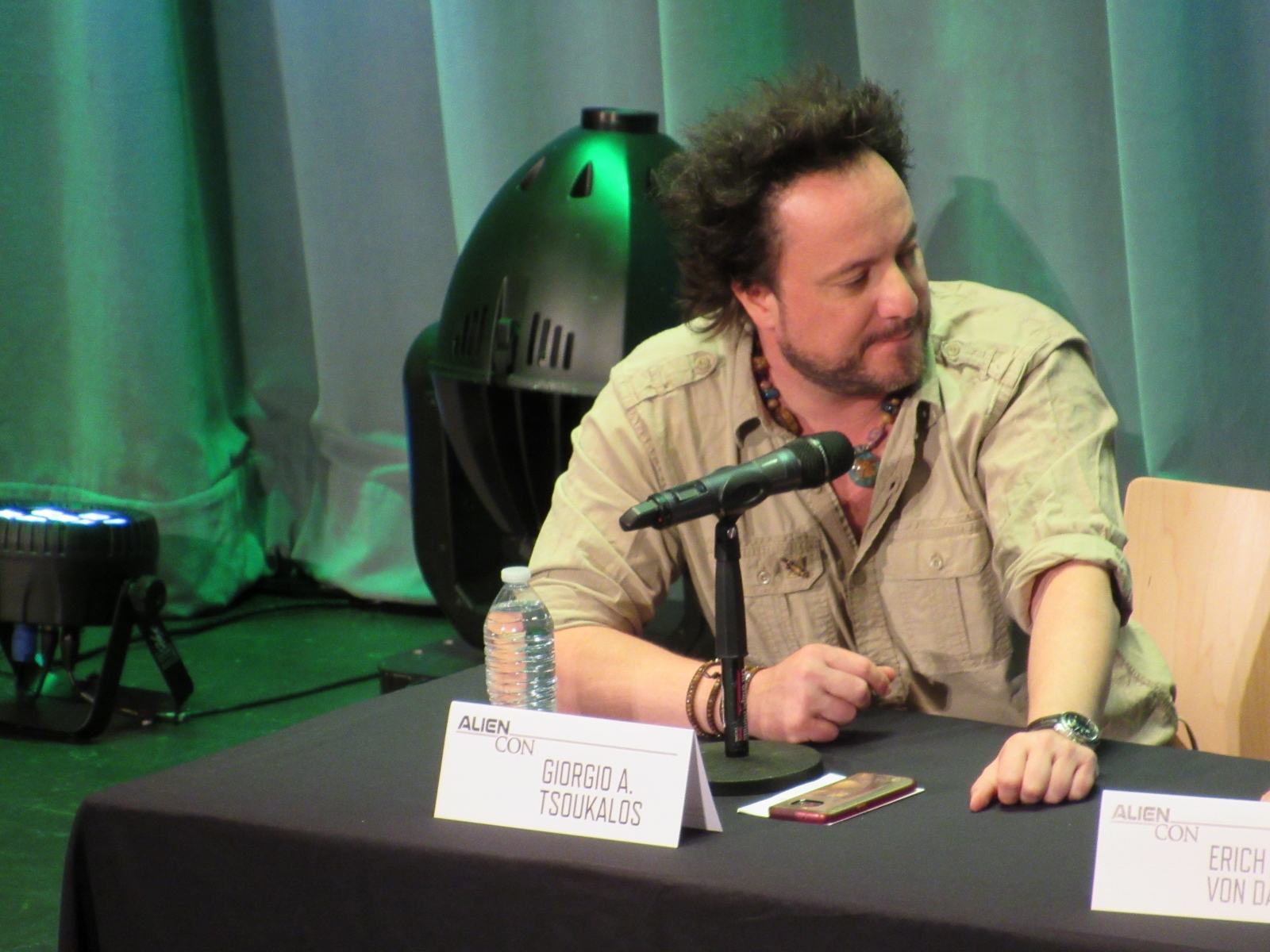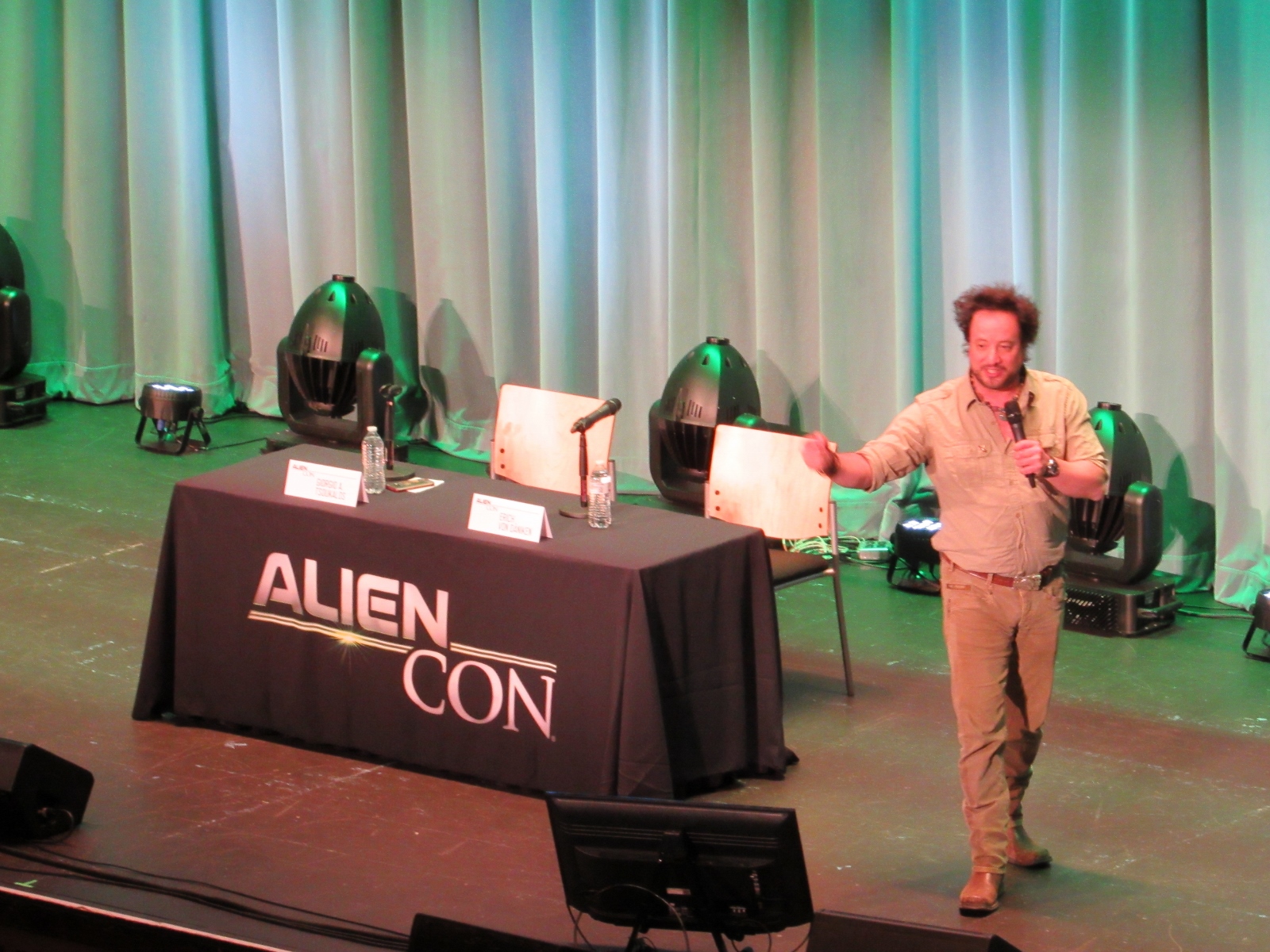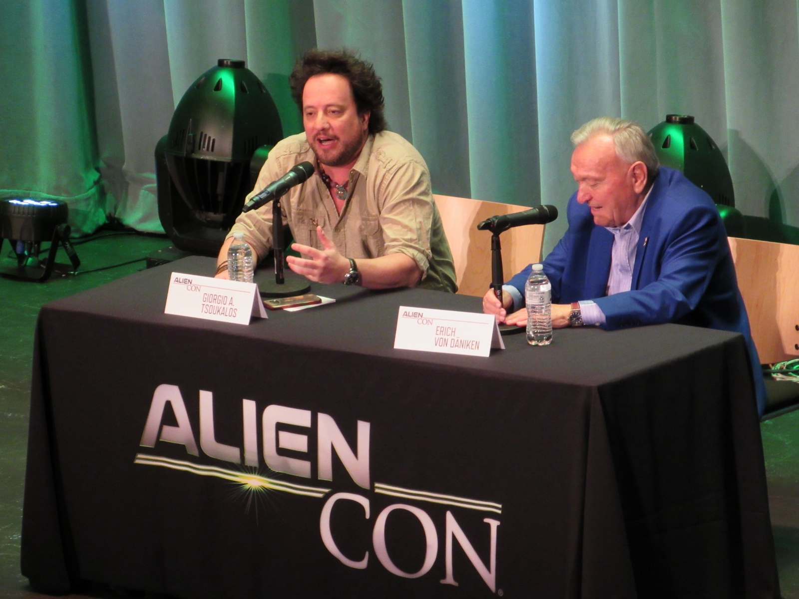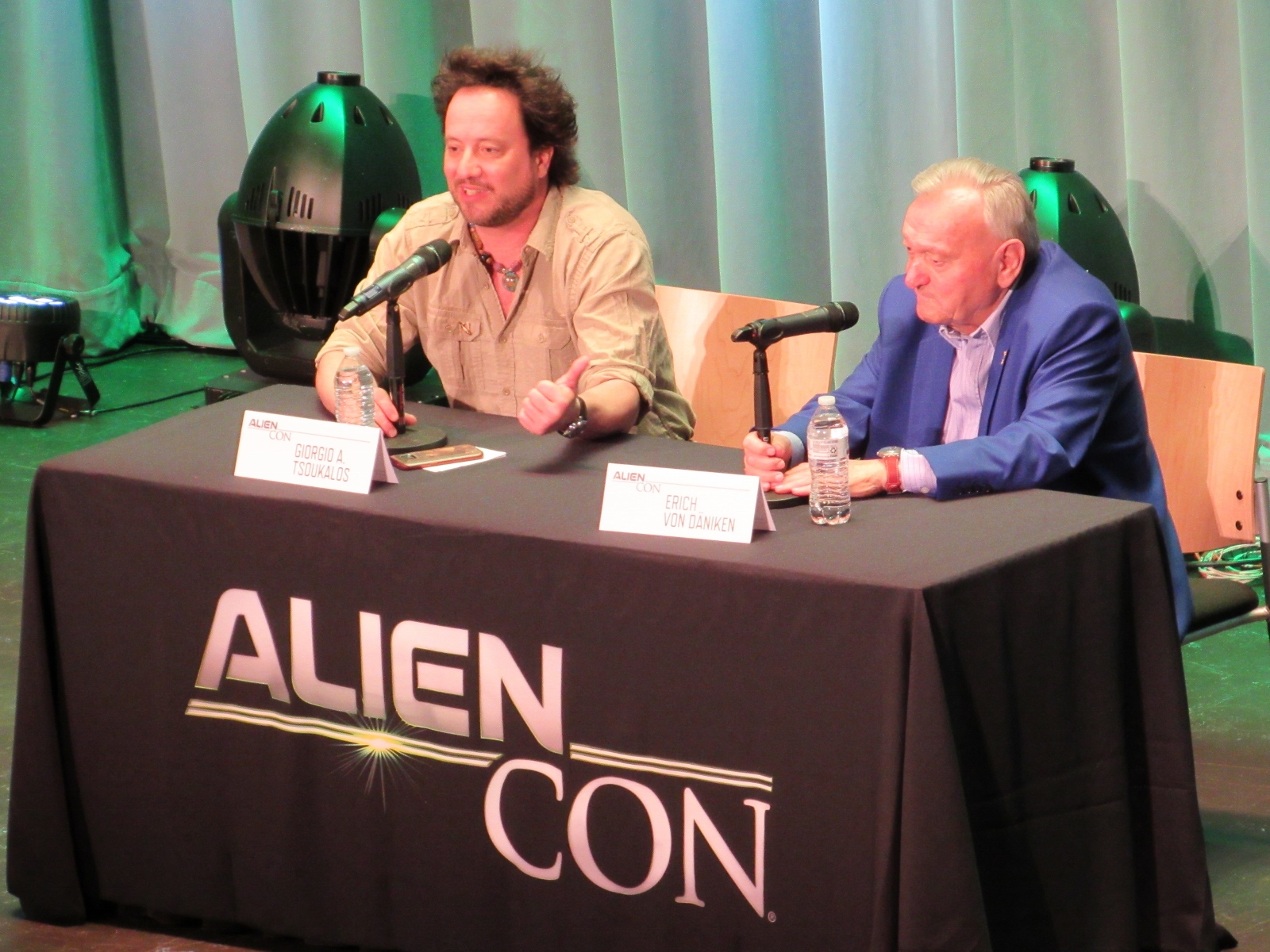 The panel was titled Ancient Astronaut Theory with Erich von Däniken and Giorgio A. Tsoukalos, and it was packed. Robert Clotworthy, narrator of Ancient Aliens, came out on stage first and did an intro before Giorgio A. Tsoukalos came out on stage and did his own introduction, then Erich von Däniken came on stage.