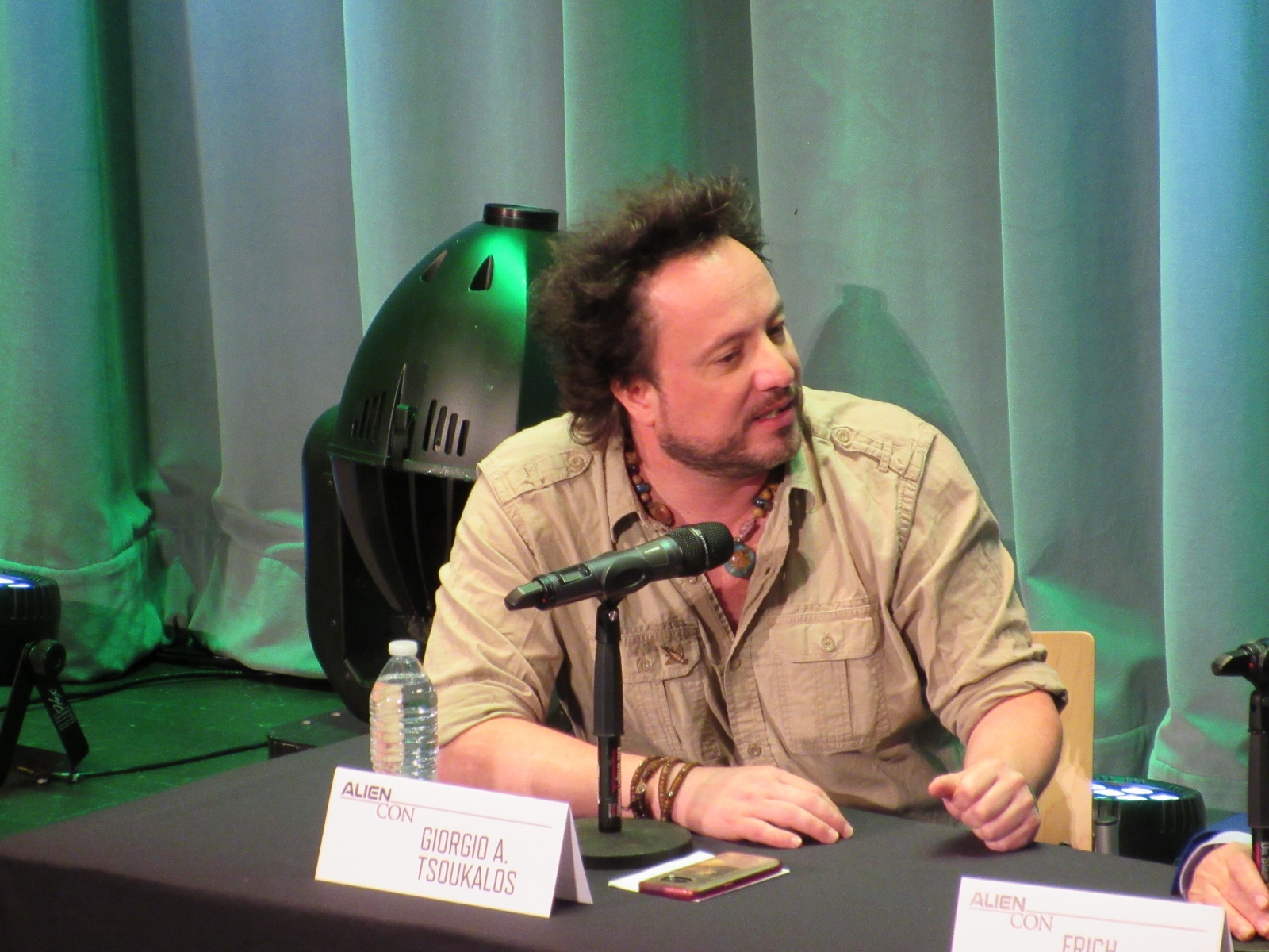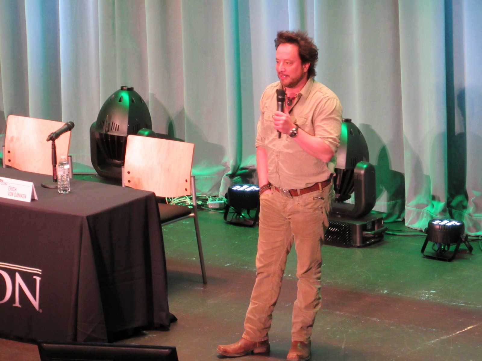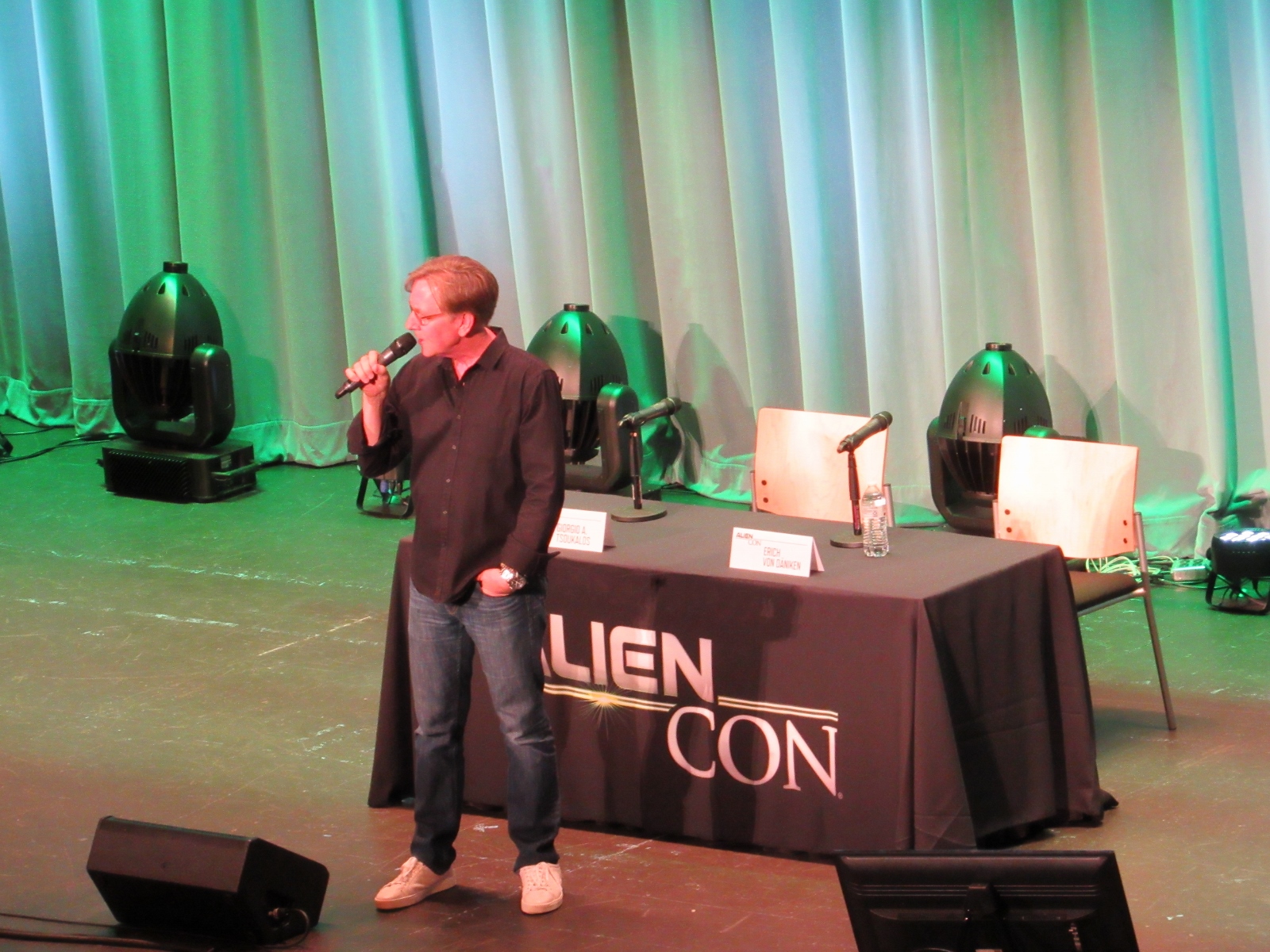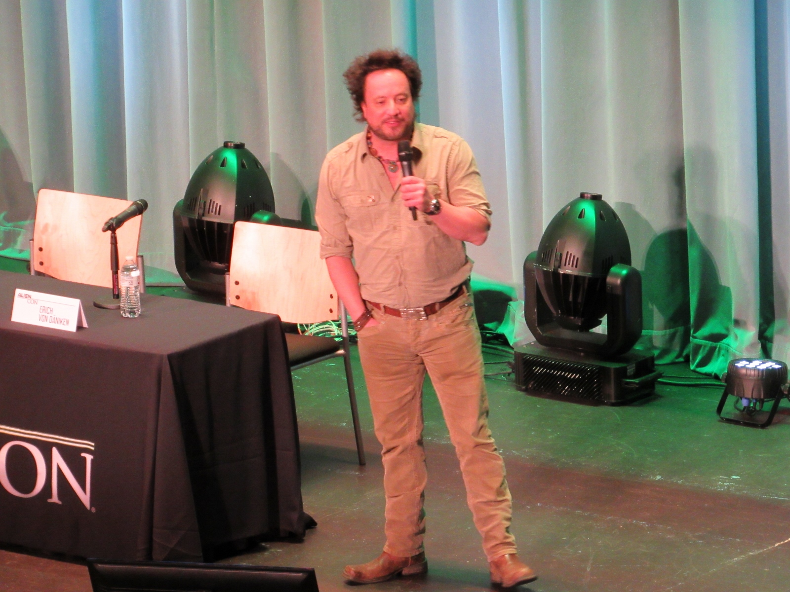 The panel was titled Ancient Astronaut Theory with Erich von Däniken and Giorgio A. Tsoukalos, and it was packed. Robert Clotworthy, narrator of Ancient Aliens, came out on stage first and did an intro before Giorgio A. Tsoukalos came out on stage and did his own introduction, then Erich von Däniken came on stage.