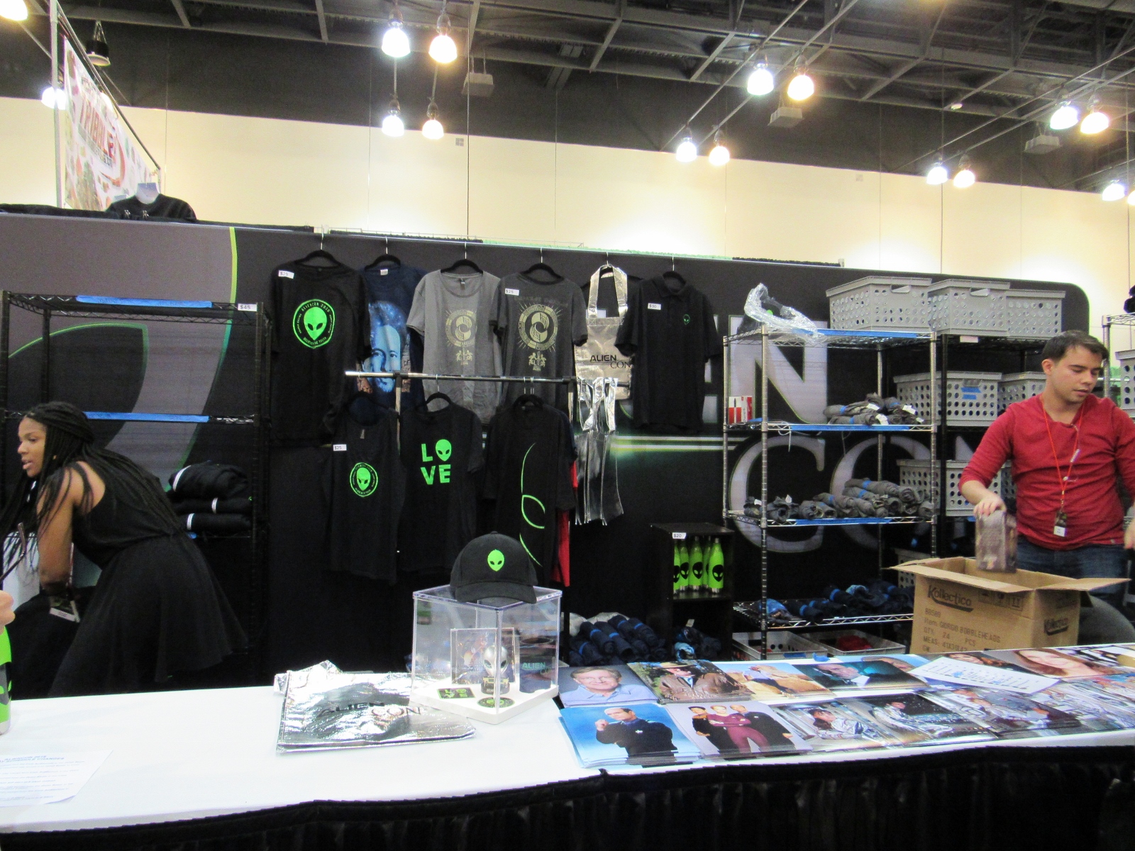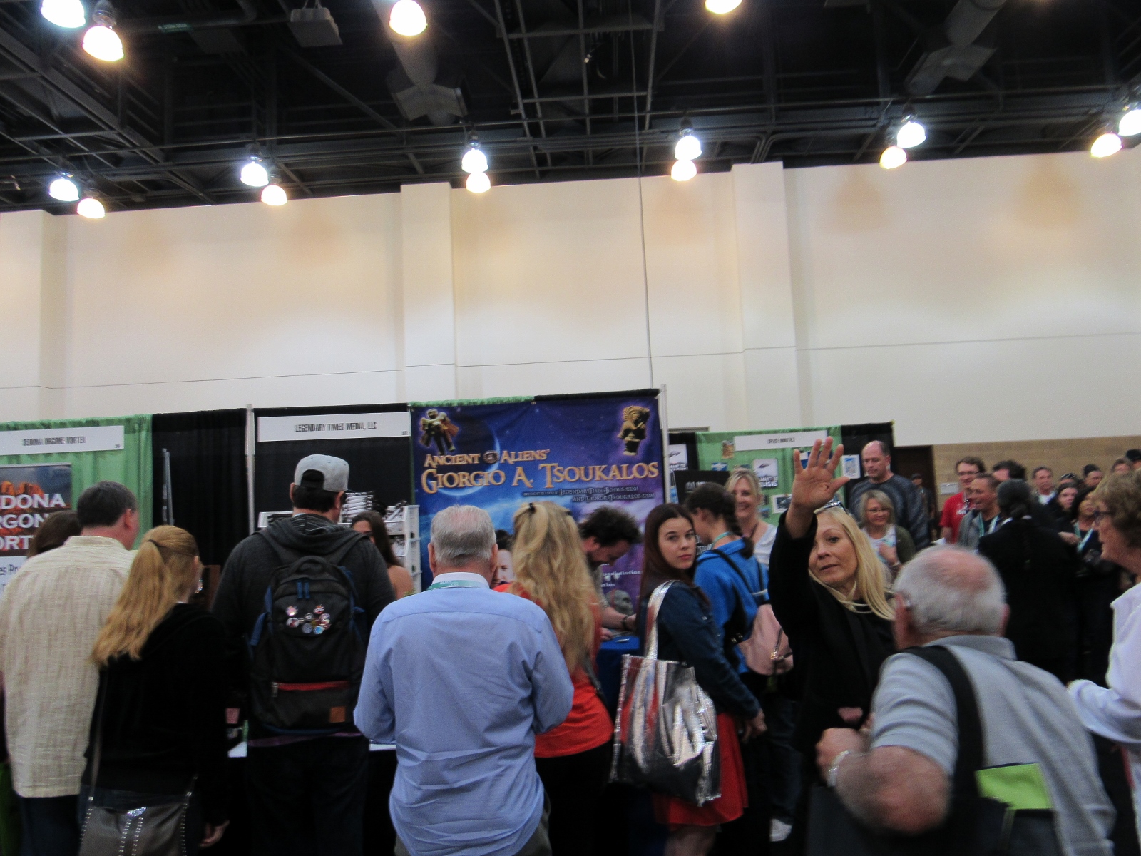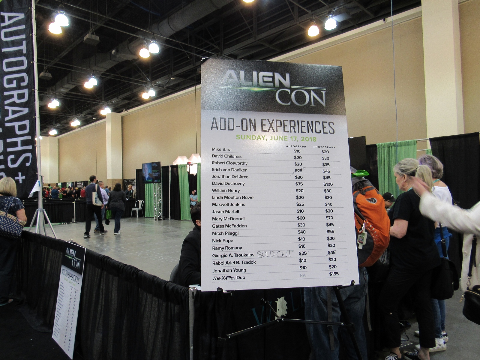 After the Ancient Astronaut Theory panel, we headed over to the Exhibit Hall to take a look at the show floor, which AlienCon called its “Marketplace.” It was a lot smaller than we expected, especially with a good portion of it being taken up by the autographs/photo ops area. The vendor booths consisted mainly of alien art and advertising for other alien/conspiracy theory/supernatural type events. AlienCon had its own merch area as well. Tsoukalos also had his own booth, and he had very quickly made his way over to it following the panel and was signing autographs. As you can see in the photo below, it appears that Tsoukalos was the biggest draw at AlienCon, considering that his autographs and photo ops were the only sell outs.