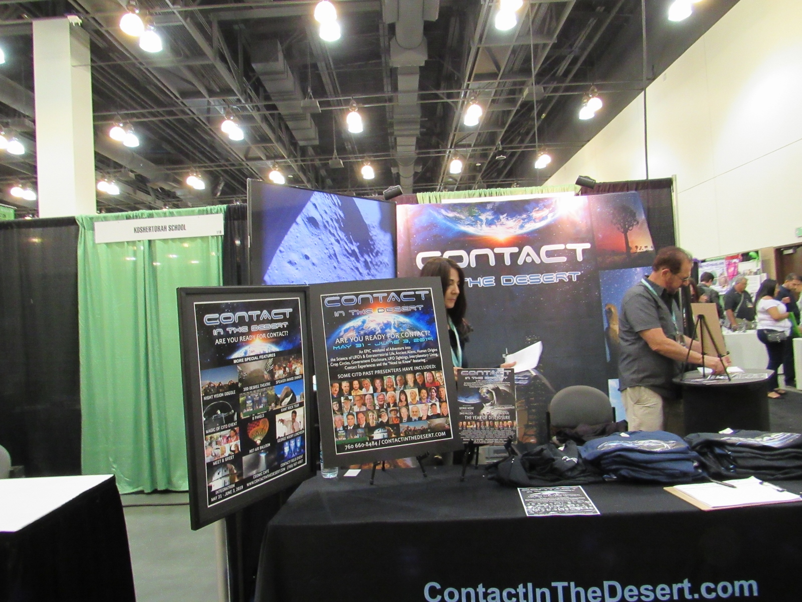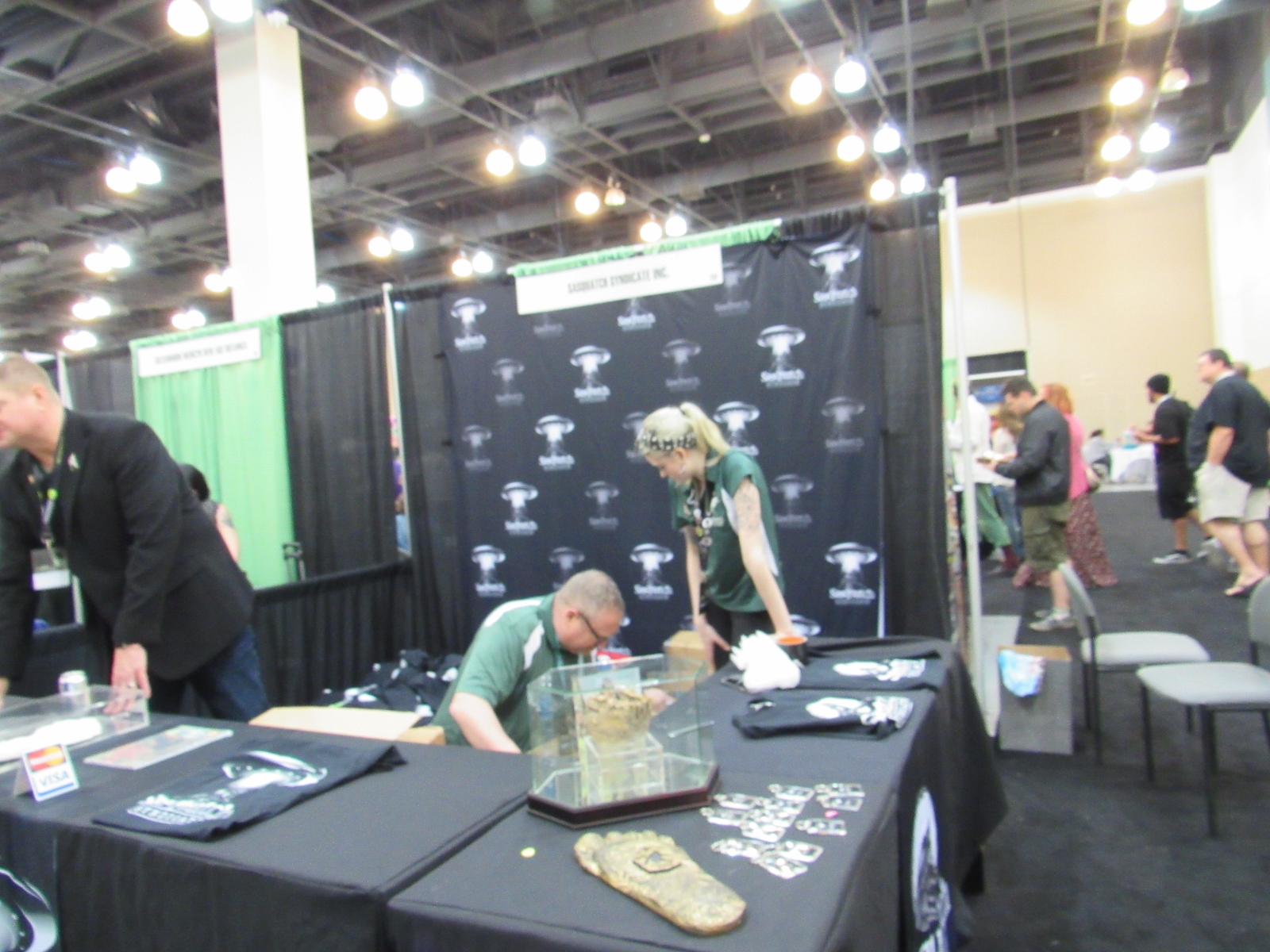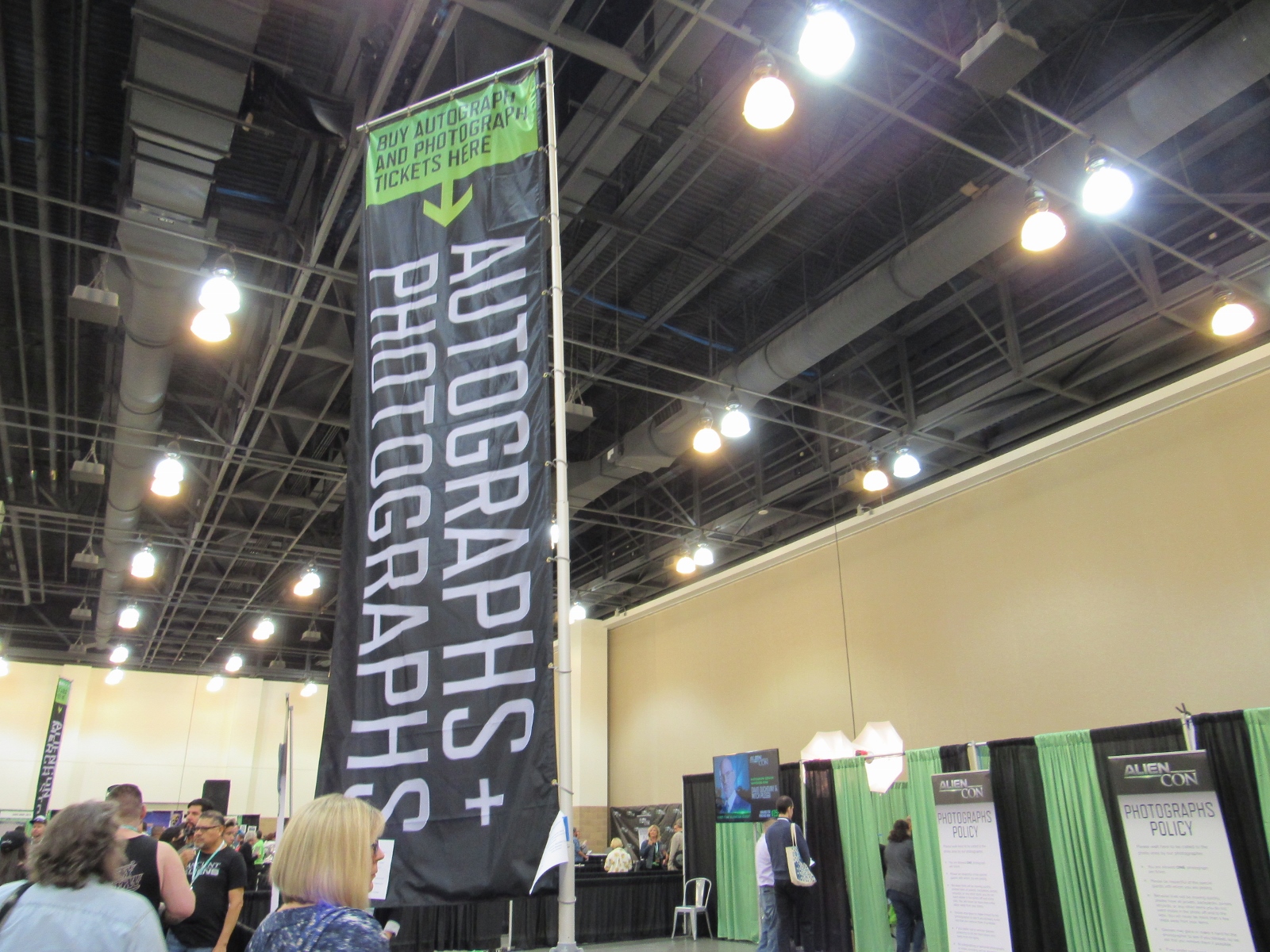 After the Ancient Astronaut Theory panel, we headed over to the Exhibit Hall to take a look at the show floor, which AlienCon called its “Marketplace.” It was a lot smaller than we expected, especially with a good portion of it being taken up by the autographs/photo ops area. The vendor booths consisted mainly of alien art and advertising for other alien/conspiracy theory/supernatural type events. AlienCon had its own merch area as well. Tsoukalos also had his own booth, and he had very quickly made his way over to it following the panel and was signing autographs. As you can see in the photo below, it appears that Tsoukalos was the biggest draw at AlienCon, considering that his autographs and photo ops were the only sell outs.