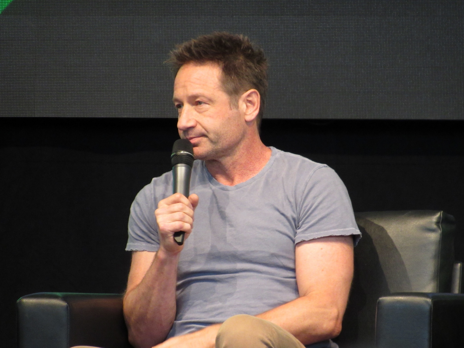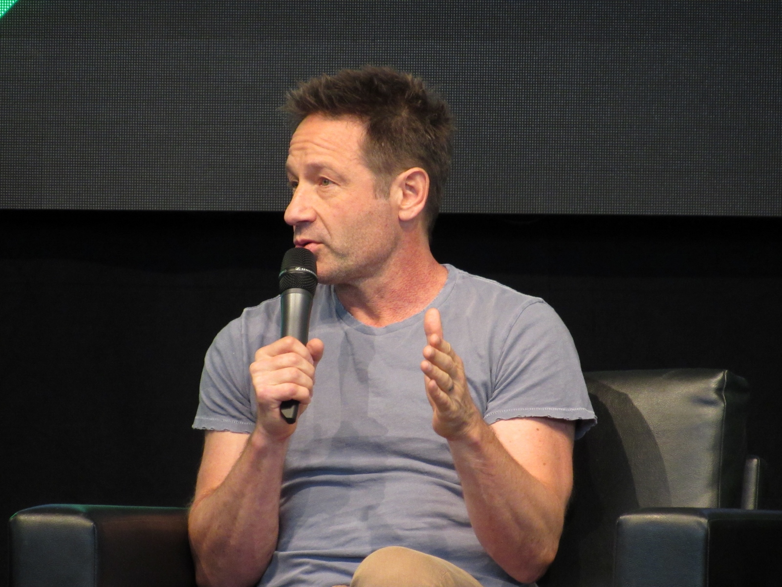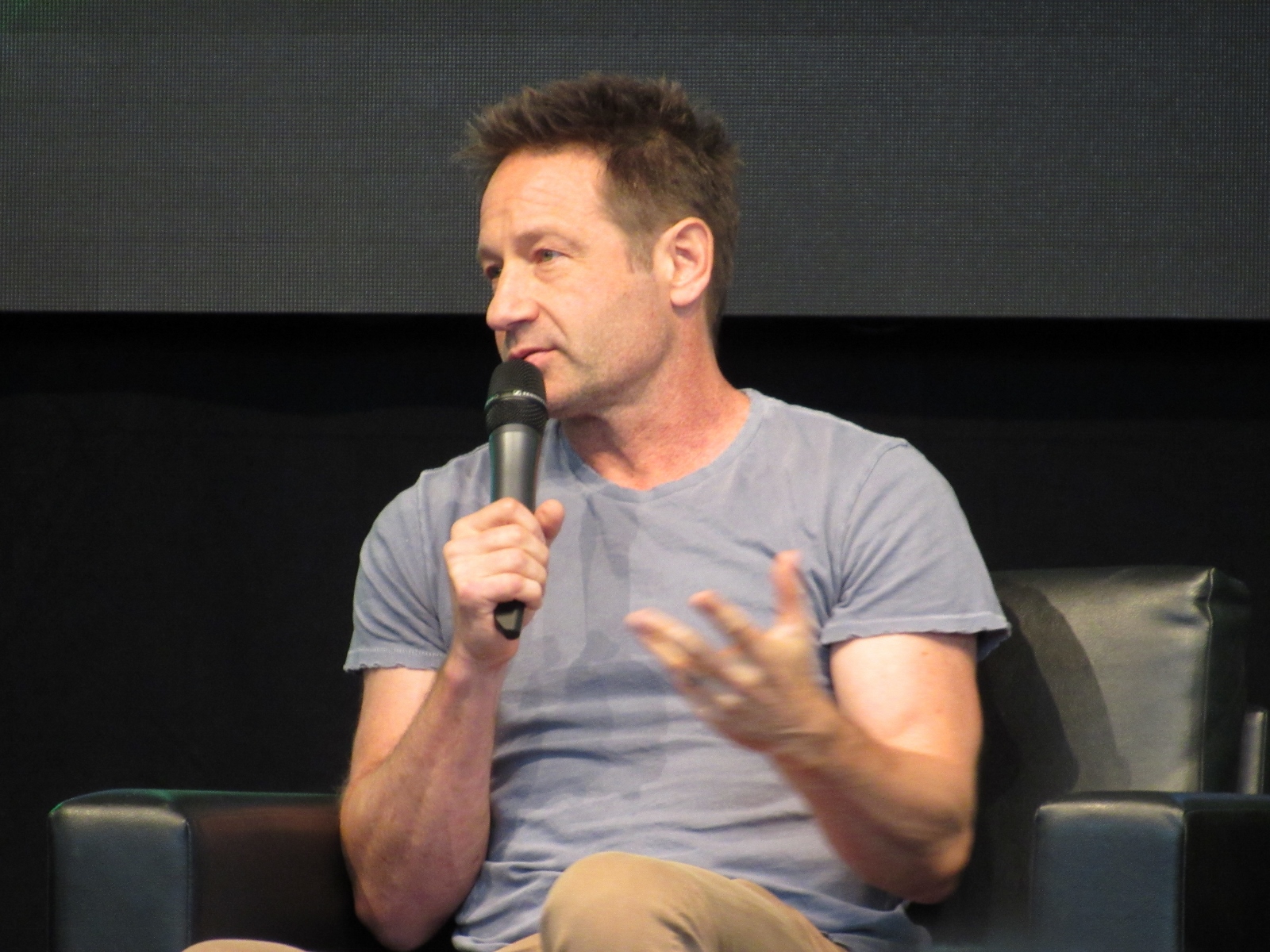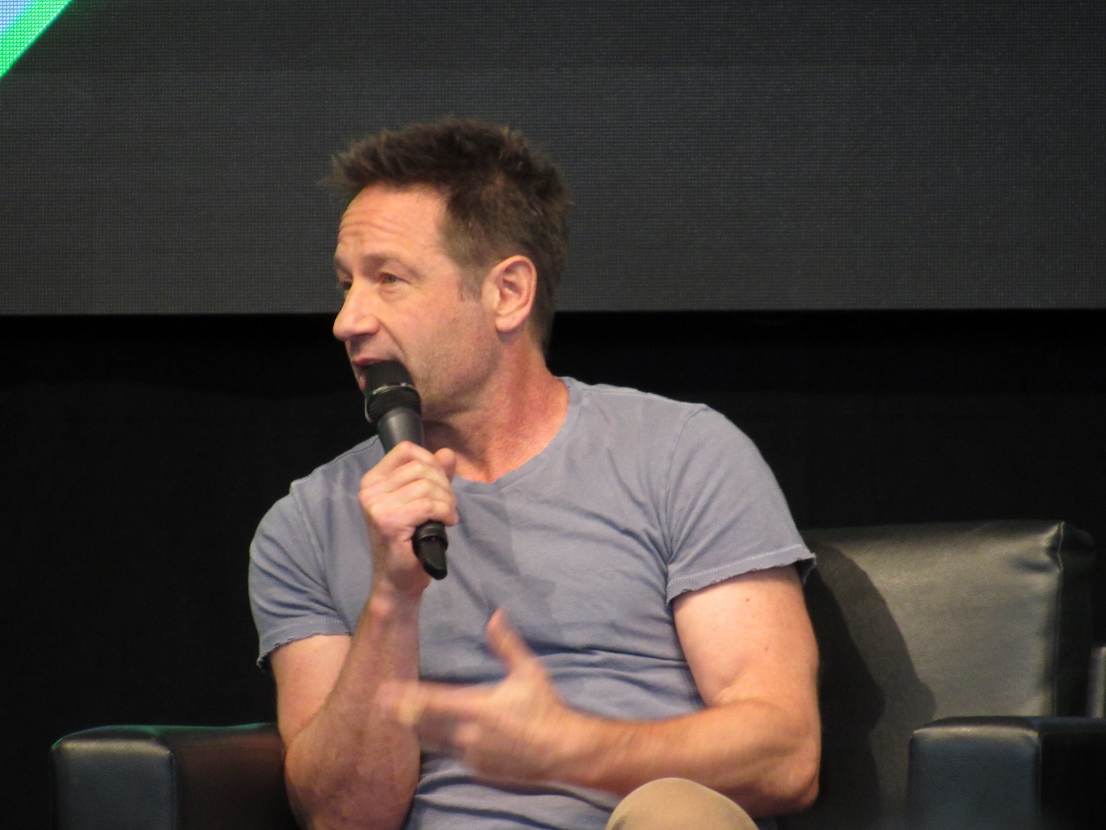 One audience question was about the influence of technology on the show over the years. Duchovny spoke about cell phones, and how they started becoming more commonplace by the third or fourth season, which was “lifesaving” for him and Anderson, as it allowed the two of them to be in two different places, which he said is essential for investigative type shows.