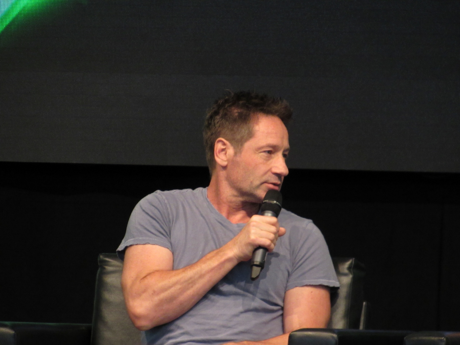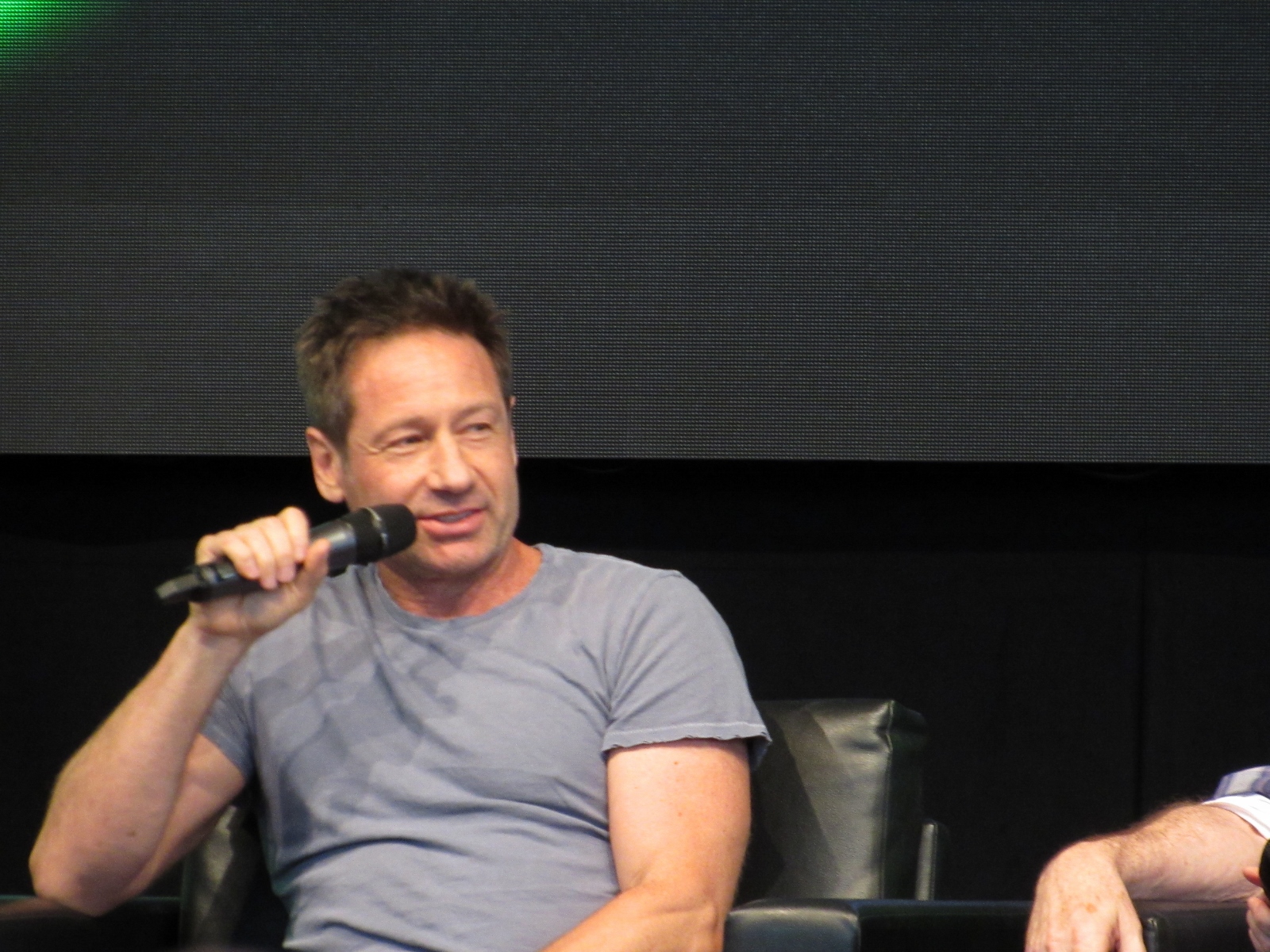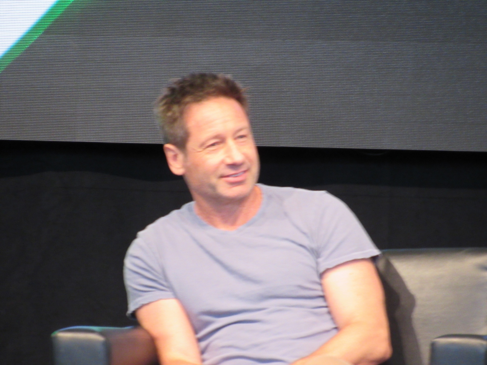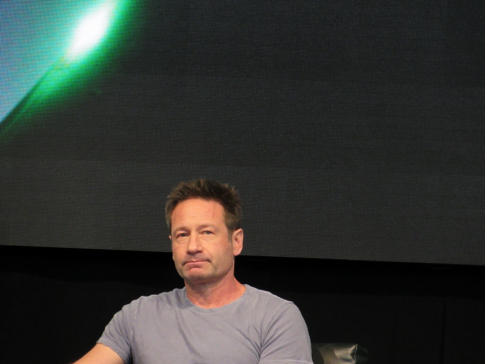 The moderator brought up Season 11 Episode 7, Followers, which has very little dialogue, and asked if it was a challenge for Duchovny. However, he answered, “It gave me more free time,” because he didn’t have to spend time memorizing a script. Pileggi seemed jealous. Duchovny had been skeptical at first, but said that it came off as one of the better episodes this season. As for whether Duchovny actually ate the blobfish in the sushi restaurant, he said that it was fake. The moderator then enlightened him about the what a star the blobfish had become, as Gillian had tweeted out pictures of it.