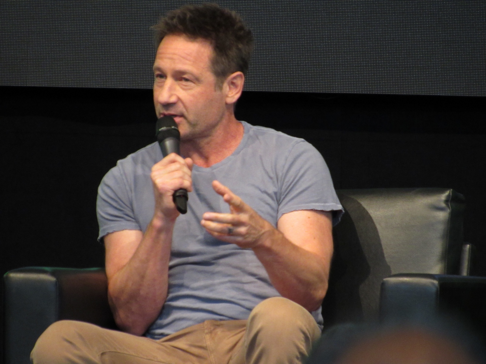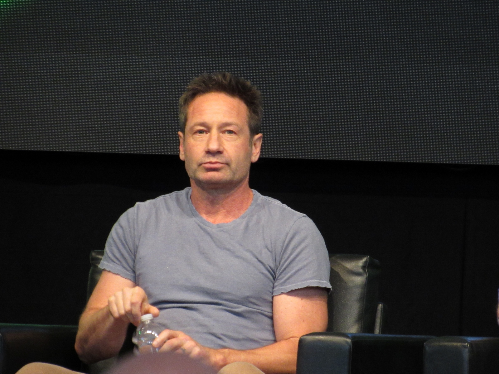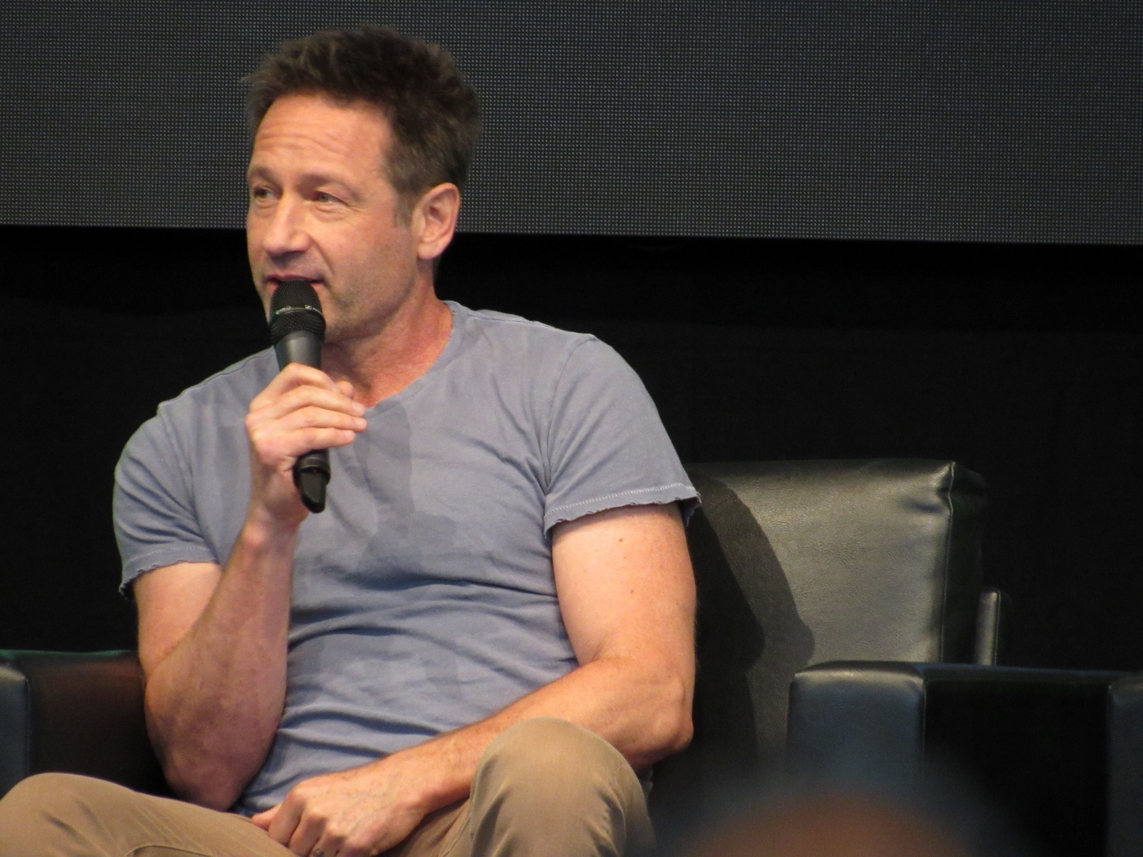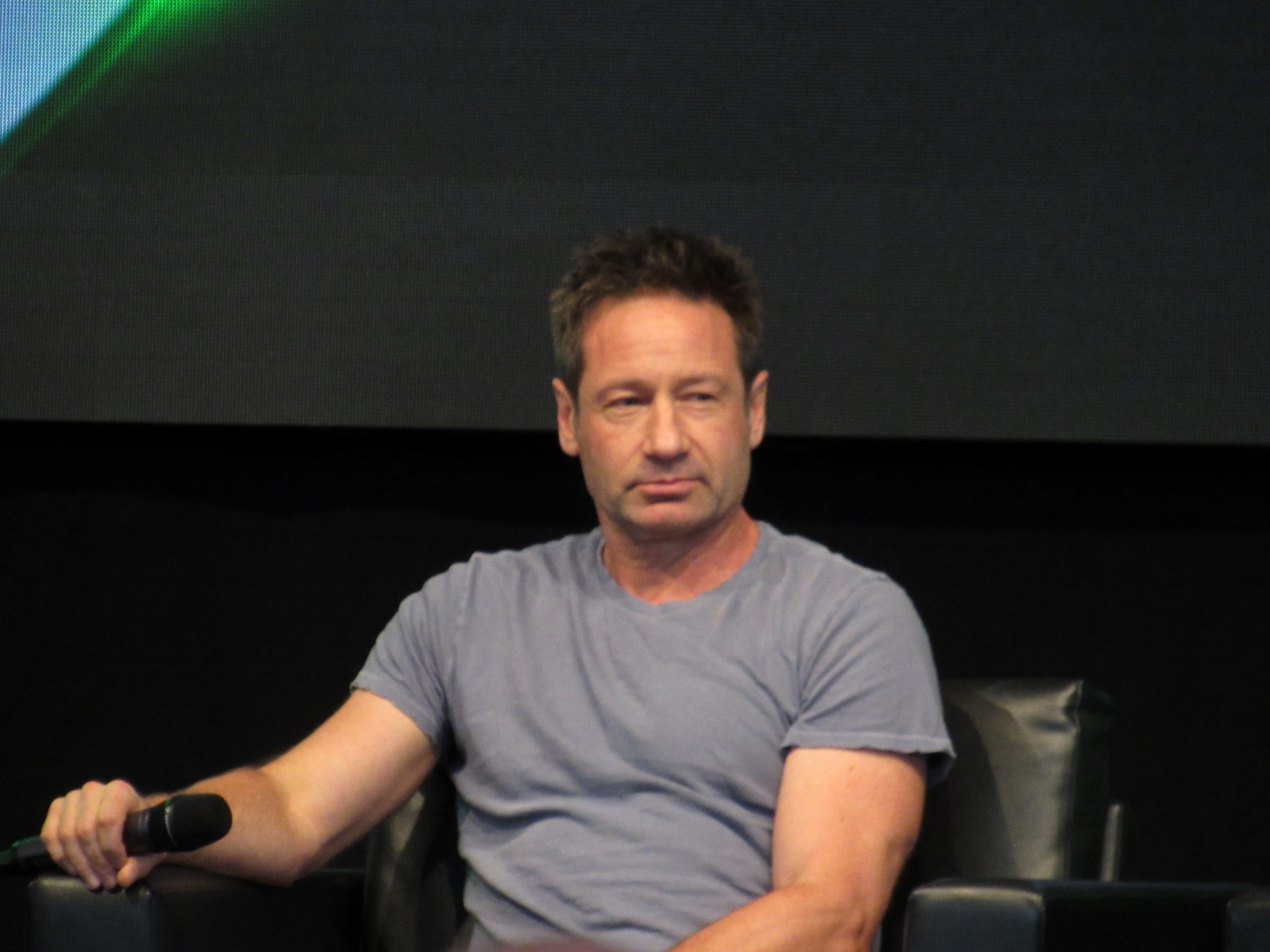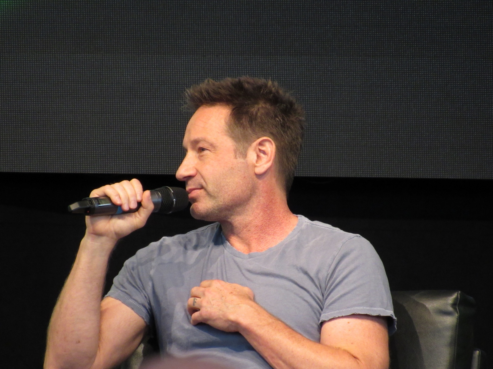 The moderator brought up Season 11 Episode 7, Followers, which has very little dialogue, and asked if it was a challenge for Duchovny. However, he answered, “It gave me more free time,” because he didn’t have to spend time memorizing a script. Pileggi seemed jealous. Duchovny had been skeptical at first, but said that it came off as one of the better episodes this season. As for whether Duchovny actually ate the blobfish in the sushi restaurant, he said that it was fake. The moderator then enlightened him about the what a star the blobfish had become, as Gillian had tweeted out pictures of it.