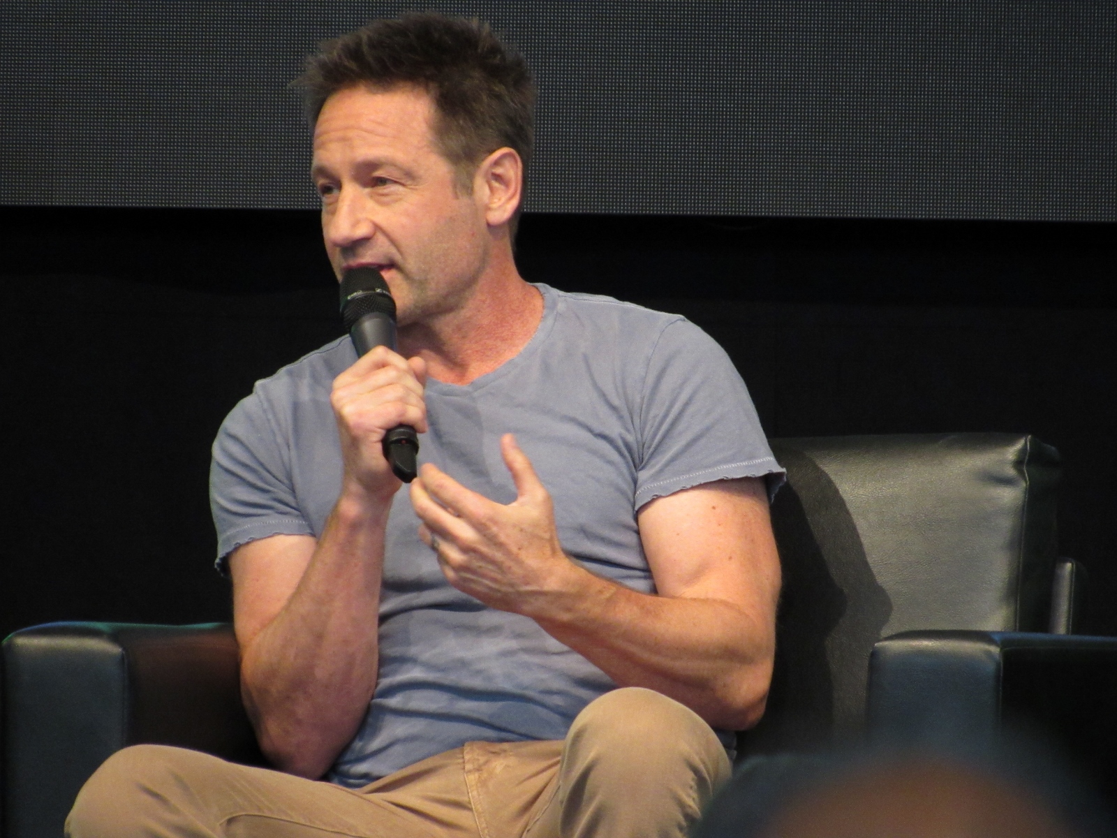 A self-admitted Mulder/Scully shipper, the moderator pointed out that there had not been a Mulder/Scully kiss this entire season. She mentioned that the way the previews for the penultimate episode, Nothing Lasts Forever, were cut, fans thought that was the episode where it would happen. There was a scene in the church where Scully whispers something into Mulder’s ear, and Duchovny revealed what Gillian Anderson actually whispered into his ear: nothing. She just flapped her gums, which he said reminded him of Mr. Ed! Pileggi joked that what she had said was, “Wilburrr!” The moderator tried to push for an answer about the kiss, asking if there had been a kiss originally written into the script that had been cut, but Duchovny said not to his knowledge.