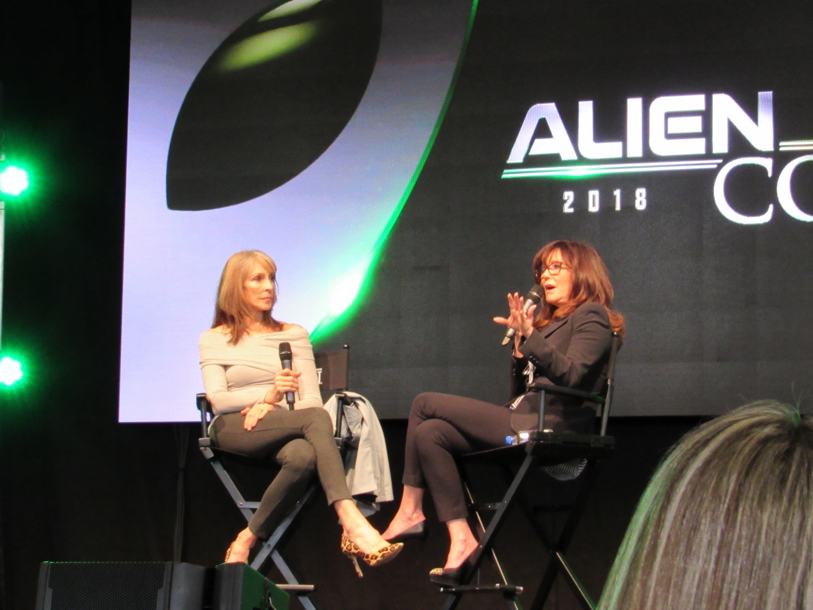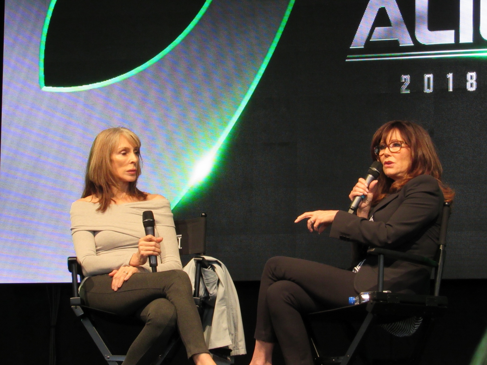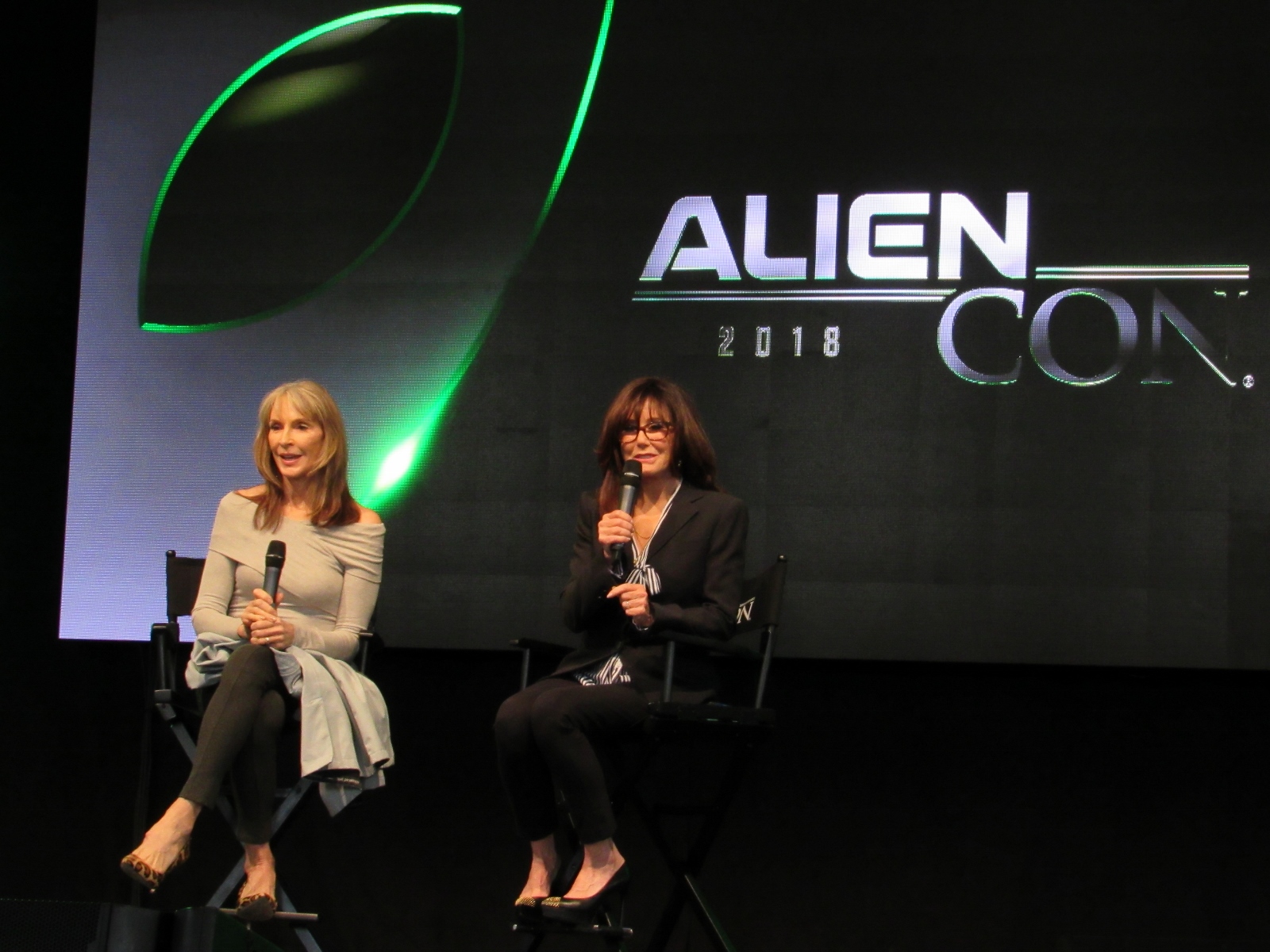 Next up in the same room was a live recording of the Lady Bam Podcast with Mary McDonnell. Sci-fi geeks like myself would best know her as the First Lady, Marilyn Whitmore, in Independence Day and more recently as President Laura Roslin in Battlestar Galactica. This is a new podcast that Mary McDonnell started where she invites guests onto the show, whom she interviews. The guest for this particular podcast was Gates McFadden, who played Dr. Beverly Crusher on Star Trek: The Next Generation. I grew up watching these two women, so it was a delight to see the two of them on stage together.