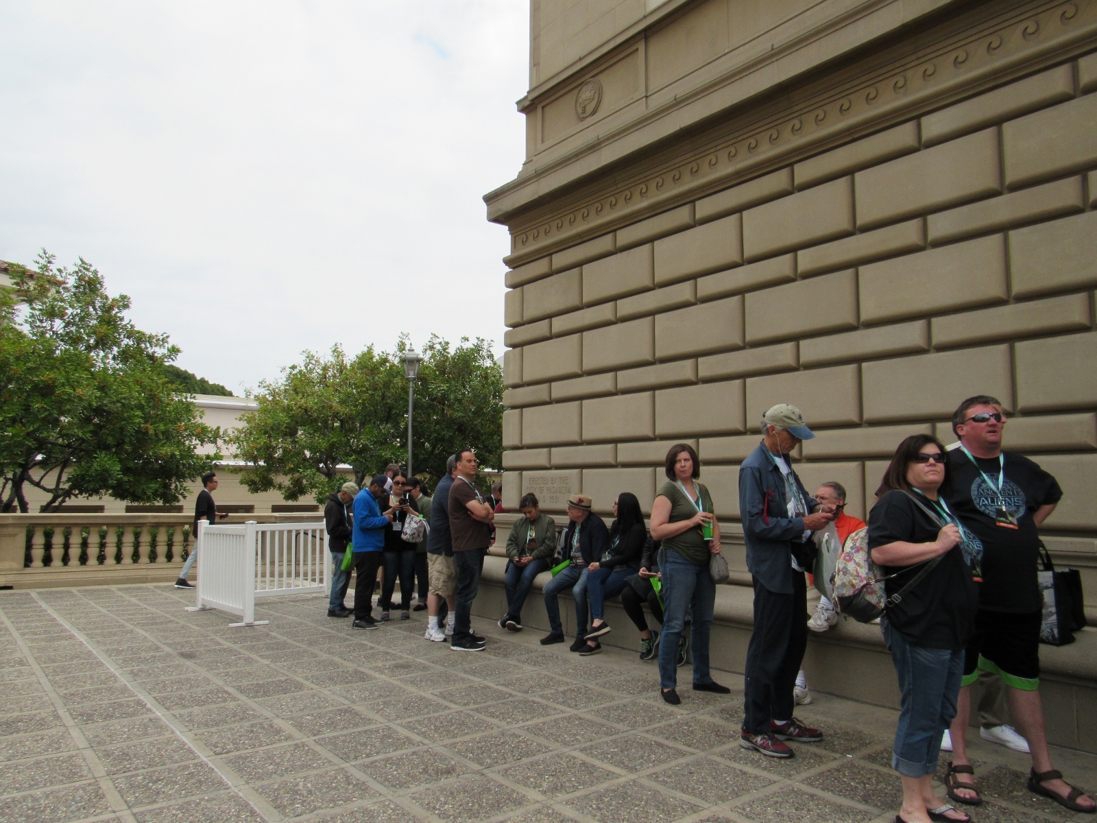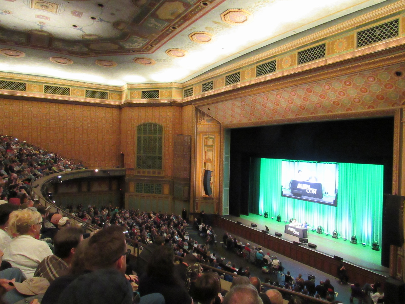 After we picked up our Press passes, we went to get in line at the Civic Auditorium, where the 25 Years of The X-Files panel would be taking place. However, there was a last minute room change. The Ancient Aliens: Metaphysics and Prophecy panel would now be taking place in the Civic Auditorium, while the X-Files panel had been moved to the smaller Orion room. This seemed like an odd choice to me, but as it turned out, apparently the Ancient Aliens related panels had had a much bigger draw than the sci-fi/celebrity themed panels had, so the convention changed plans accordingly. This information was posted on the doors of and near the affected rooms, and the electronic schedule was updated accordingly. I applaud the convention organizers for recognizing this and taking swift action to accommodate the needs of their attendees. Indeed, by the time the X-Files panel started, the smaller Orion room ended up not filling up all the way, to my surprise.