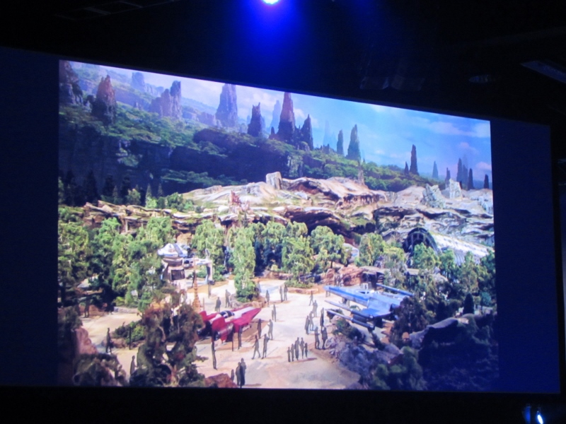 The first big topic of conversation was Star Wars Land, which was announced at the last D23 Expo in 2015. Bob briefly went over the two rides that would be in Star Wars Land, one of which you would get to fly the Millennium Falcon, and work as a team. We were also shown a video of the model for Star Wars Land. Bob then revealed the official name for Star Wars Land, which is Star Wars: Galaxy’s Edge. Imagineer Scott Trowbridge came out on stage to tell us a little more about Star Wars: Galaxy Edge. He told us that it would feature both new and old characters, such as Hondo, Chewy, BB-8, and Kylo Ren. Scott explained that it would be a “living place” where your choices matter. For example, your performance on the Millennium Falcon ride might end up earning you extra galactic credits, or land you on a bounty list! He talked about the Cantina and said that there would be unique drink concoctions there. Additionally, Rex, the pilot on Star Tours before the recent update, will be a DJ at the Cantina! After Scott finished up, Bob came back onstage and revealed that the Star Wars Lands in Anaheim and Orlando would be opening at slightly different times, but that the first one will open right here at Disneyland.