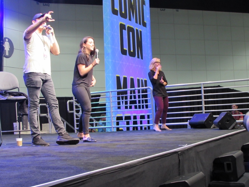 They also talked about what it was like to do their superhero team-up against AIDA, and even showed us a live action performance of what a team-up is like. Apparently they blast air at Chloe while she just stands there. Meanwhile, Gabe’s chain is really only about a foot long, and they CGI the rest of it. Gabe said that he calls it his “lightsaber paring knife” because of how short it is.