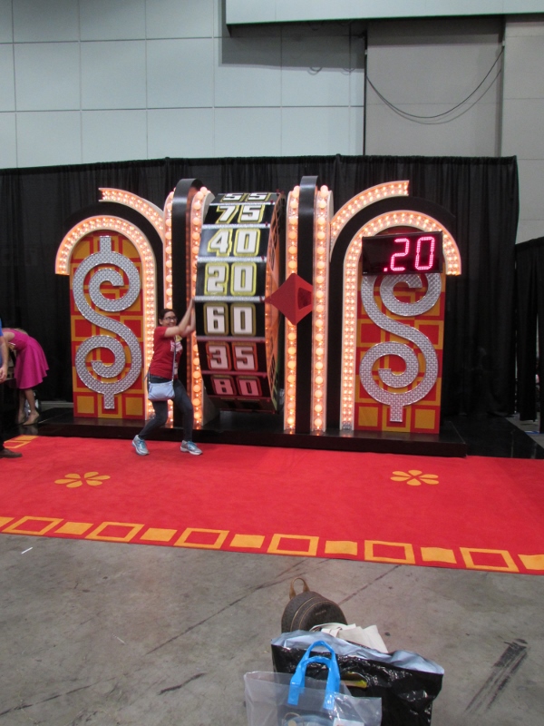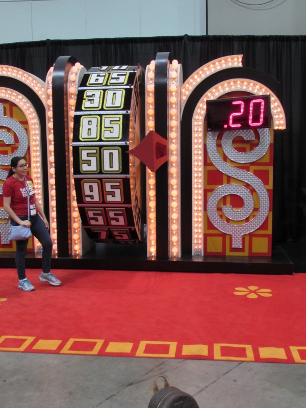 One thing Violet could not miss was the Price is Right booth. First, they gave her a price tag name tag, just like the ones they wear on the show. Then she got a photo op on the Showcase Showdown set with two models from the show, James and Amber. Finally, she got to spin the wheel! The first spin was 20 cents, then the next spin was 50 cents, for a total of 70 cents. No dollar this time! Oh well.