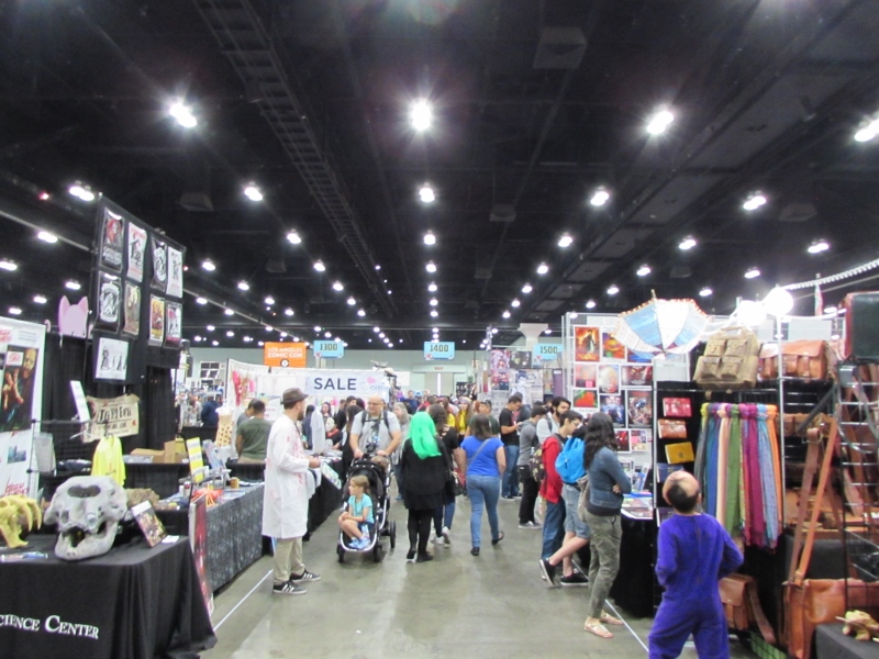 We arrived at LACC a little bit past 9am, and found a pretty good parking spot that would allow for our dressing. I basically just needed to apply accessories for my costume—put on my “boots”, belts, hat, wrist bracers, gloves and a couple other parts. Violet, on the other hand, had to essentially change in the parking lot. Luckily, we came up with a system—she was able to slide on her Wonder Woman skirt, then while wearing one of my button-up shirts, slide the chest plate on underneath, while I fastened it in the back. Then it was a matter of putting her shoes on, shin guards, bracers, tiara, belt and other accessories. While it sounds easy when I write it, it took about 45 minutes for us to be fully operational, and ready to head to the Convention Center. We finally were able to make our way to the entrance. On the way, a Captain America cosplayer was getting ready, while staring down Violet. Eventually he asked Violet what her costume was made of, and seemed to like it. Apparently, he had been commissioned to make a Wonder Woman cosplay and was asking all the Wonder Woman cosplayers what material their costumes were made of.
