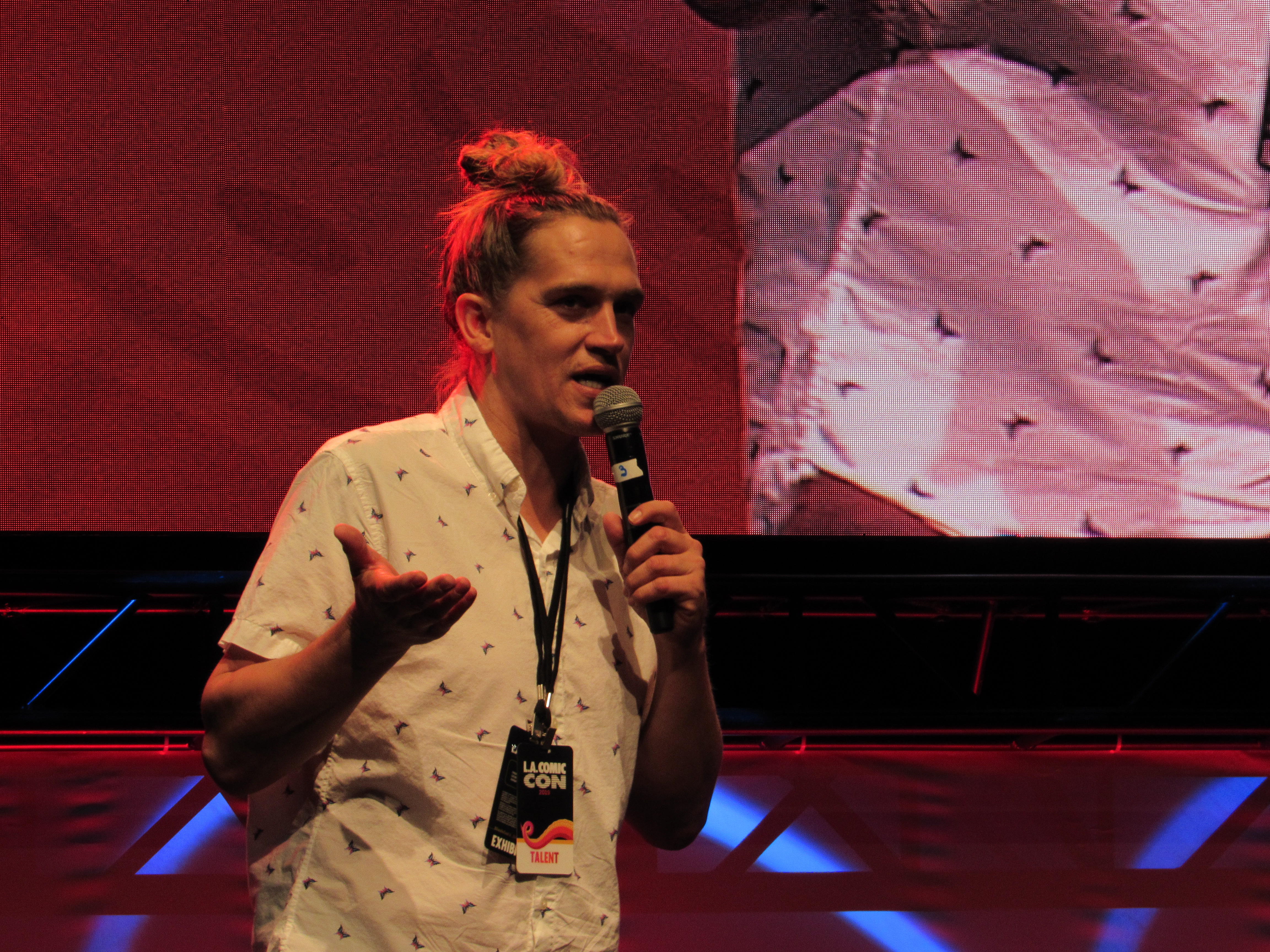 Kevin made an exciting announcement: that the two would be putting their hands in the cement outside of the Chinese Theater in Hollywood that Monday! Apparently, their handprints would be next to Stan Lee’s handprints. He then pointed out that when you put both your hands down, there is a bit of a space in between them, so he had suggested that Jason have his 4-year old daughter, Logan, place her hand in the space. However, “the boss” (Jason’s wife) said no, because she thought Logan would be too overwhelmed.