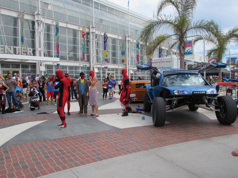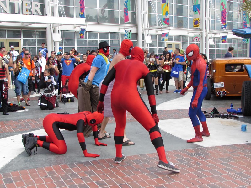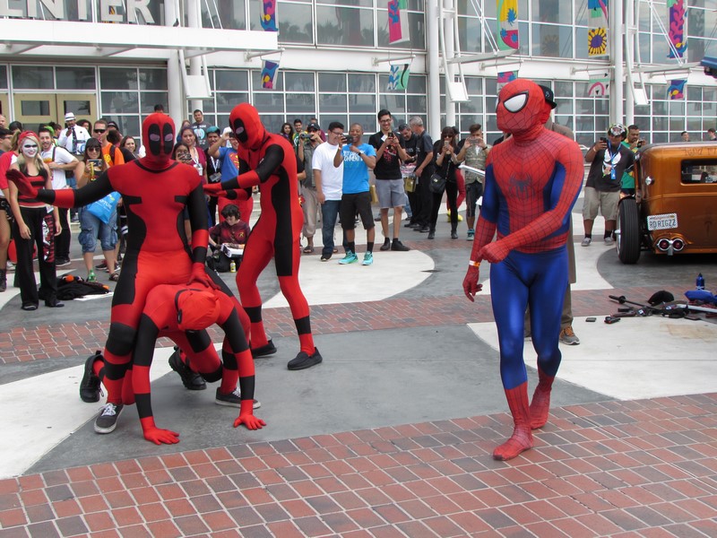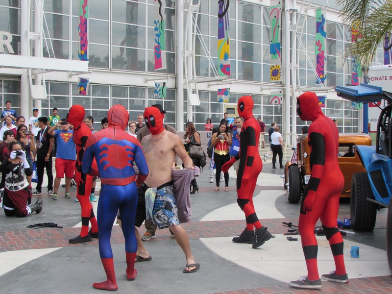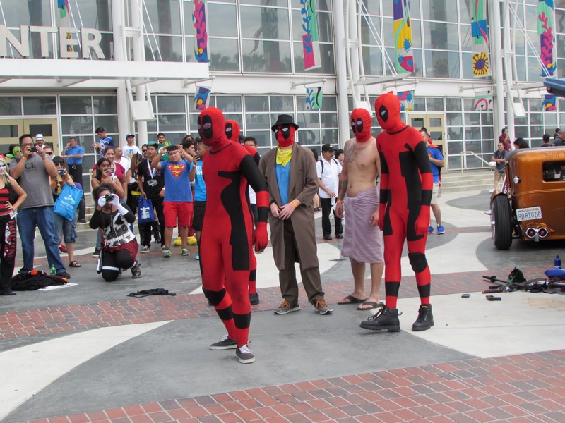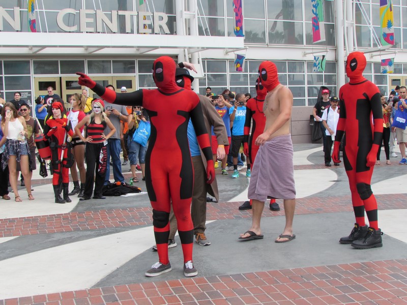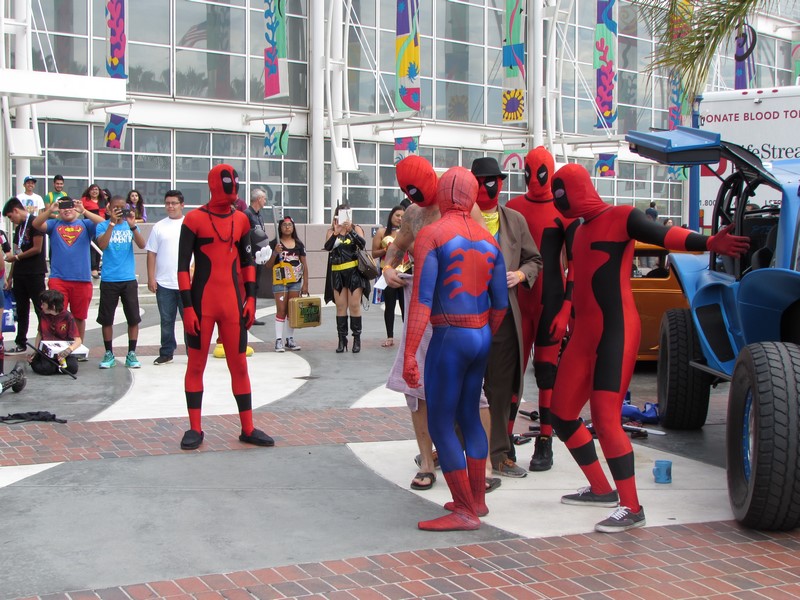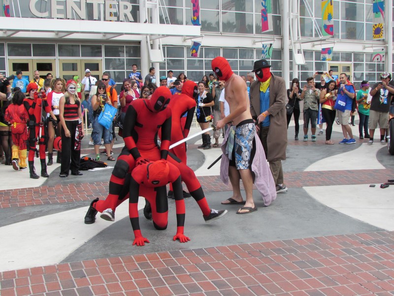 By the time we finished lunch and made our way back over to the convention center, it was about 2:40pm. Upon walking up the stairs, we noticed there was a Deadpool dance party going on. A group of about 5 people in Deadpool cosplay had a crowd of people watching them dance. From time to time, they would pull other cosplayers into the circle to dance. It was pretty funny. I quickly realized that since I was in costume, they might pull me into the circle, so I backed away! Soon, many more interesting Marvel cosplayers walked by on their way to the Marvel cosplay photo shoot, so they had better victims — er, volunteers — to choose from.