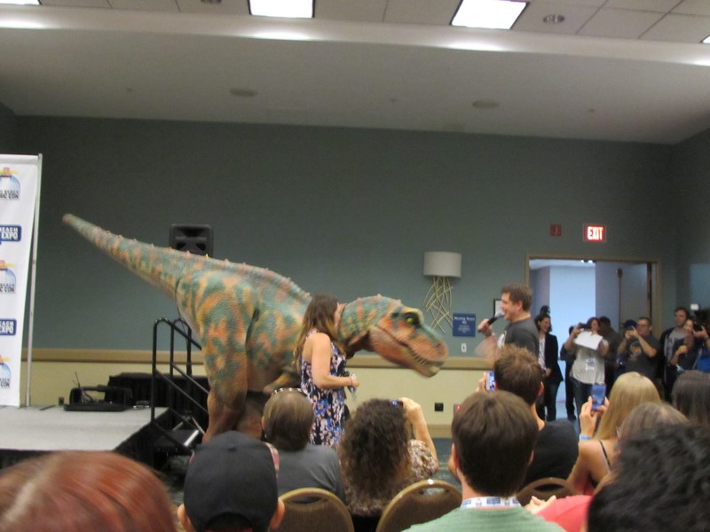 So after a little set up, the John Barrowman panel got under way. It started out prehistoric though, as John Barrowman delayed the panel a couple seconds to take a picture with a dinosaur. This was a pretty awesome dinosaur though, as someone was inside walking it, and it looked so real, it was a little creepy! John Barrowman invited the dinosaur into the panel, and Barrowman hammed it up with the dinosaur, causing a flurry of cameras capturing photos of John being “maimed” by a fake dinosaur.