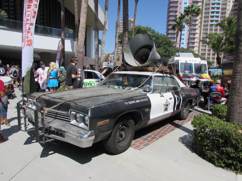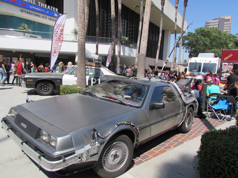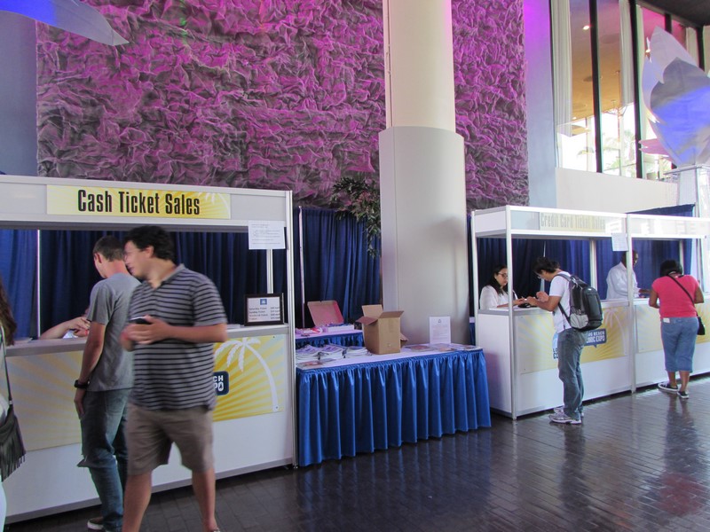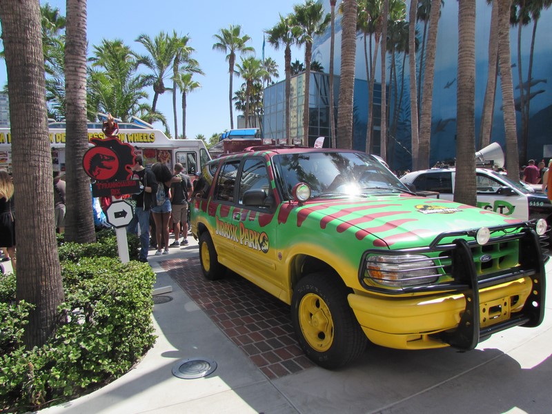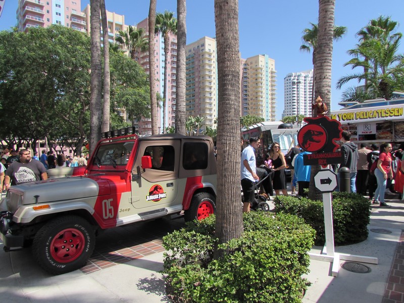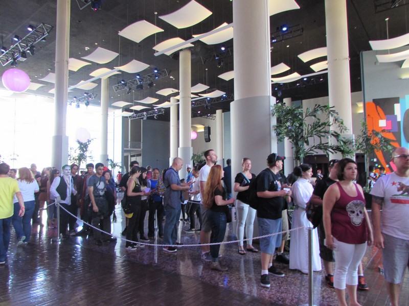 As we approached the entrance, we noticed a very long line snaking pretty far back. This line turned out to be the line to pick up tickets purchased online. The courtyard out front had several iconic vehicles on display, such as Jurassic Park vehicles, the Blues Brothers car, and a Delorean. There were also a few food trucks parked there as well. As Press, we were able to walk through the front doors without waiting in the long line, and were directed down the hall to the Press check-in desk. As we walked in, we noticed there were booths at which you could purchase tickets on site, one booth for cash, the other for credit/debit — neither of which had long lines, maybe only one or two people waiting. When we got to Press registration, there were about 5 or 6 people in line in front of us, so check in went quickly and smoothly for us. We were given clip on Press badges to wear. It turned out that only Press, Professionals, and Exhibitors were given badges, while attendees were given wristbands.