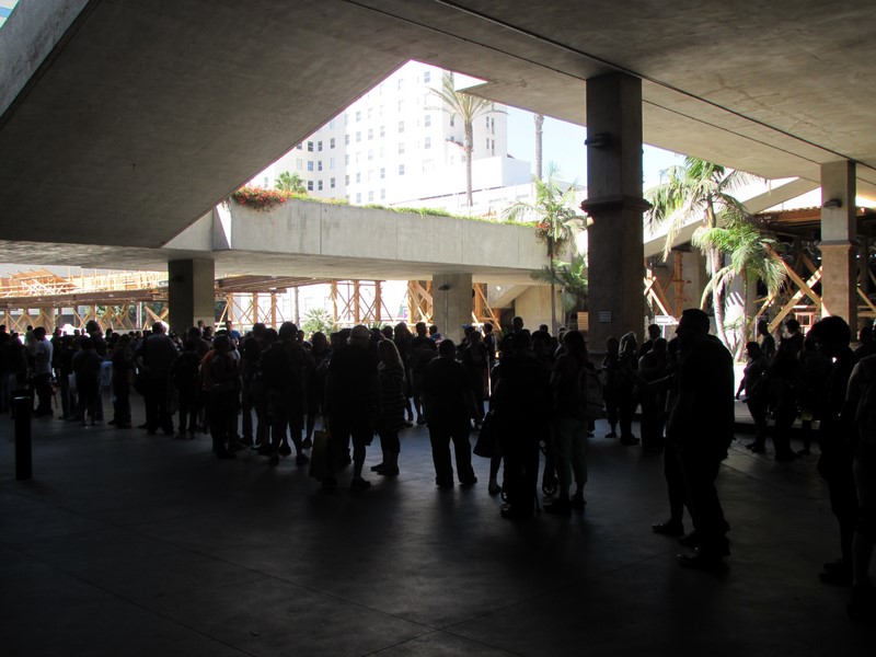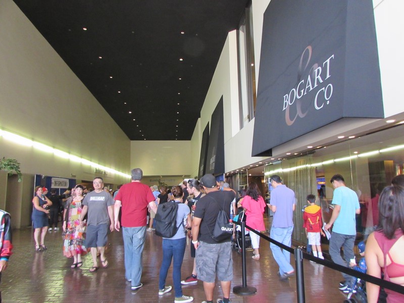 This announcement was also posted at all of the ticket pick-up booths and on the doors of Ballroom A/B. This significantly changed our plans for the day. We had to make a Sophie’s Choice. If they were going to be clearing the room after the Con Man panel, I didn’t want to risk not getting in for the Firefly panel. So we decided to concentrate our efforts on the Firefly panel. According to the new policy, the line for the Firefly panel would not be allowed to form until an hour before the panel, so that would be 2:30pm. We finished eating our food around 2:15pm, while sitting near the Con Man line, which was in a roped off area outside of Ballroom A/B. This line extended outside, and snaked back and forth a couple of times. We tried to look around for someone in charge of the line management to ask about the Firefly line, but if there was any such person, it wasn’t obvious who they were. We then ventured outside to see if there was some sort of “unofficial” line anywhere, but it was all one long line. Other people came outside and someone asked a couple of men who had recently gotten in line if they were in line for Firefly, but the men replied that they were in line for Con Man.