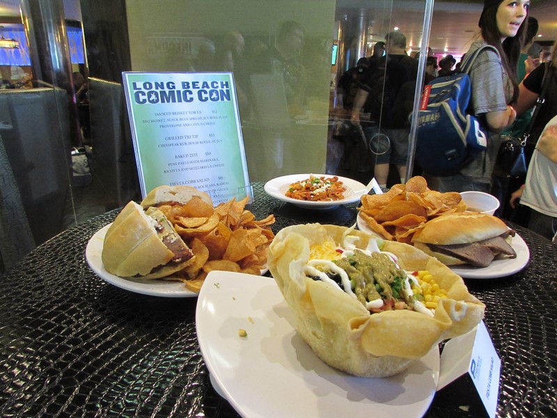 As I mentioned earlier, there were a few food trucks parked in the courtyard out front. There were also a couple parked along a side entrance. All options seemed to have ridiculously long lines. So we ended up deciding on getting in line for the restaurant inside the convention center, since there were only 4 food options, and seemed like it was on sort of an assembly line, so logically that would be the quickest, right? And at least we would be inside instead of standing in the sun outside. Well, it felt like the slowest moving line ever. By the time we reached the front and got our food, it was almost 2:00pm, so we ordered it to go so that we could take it downstairs and keep an eye on the line for the Firefly panel.