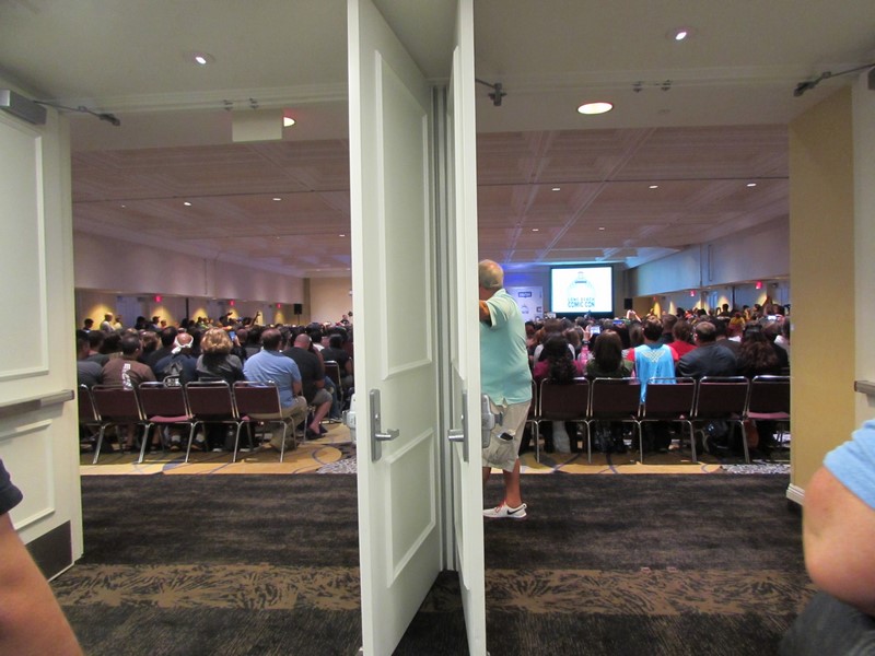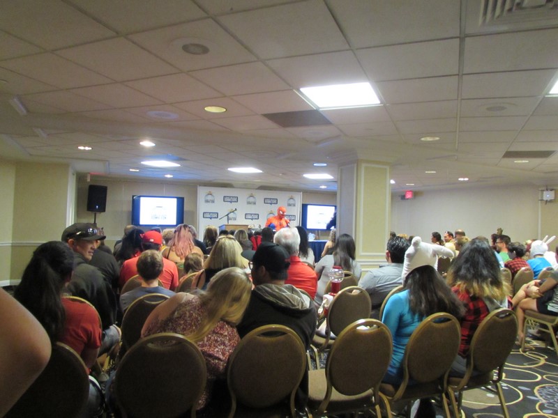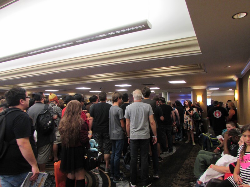 After watching the line grow, and seeing no one around giving any sort of directions about the line, we decided to go ahead and join the line, thinking that they would eventually have to cap the room, and guessing that the line would then become the Firefly line. The line continued to move for a few minutes, and sure enough, it stopped for awhile, which we assumed must have meant that the room was at capacity. Then around 3:10pm, the line started moving again, which we thought was odd, considering that the Con Man panel was supposed to be 2:30pm-3:30pm, so it was still going on, and it’s not like they could have miraculously found more seats. But then upon going through the doors back into the