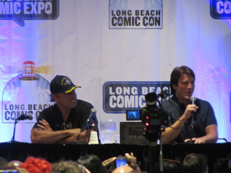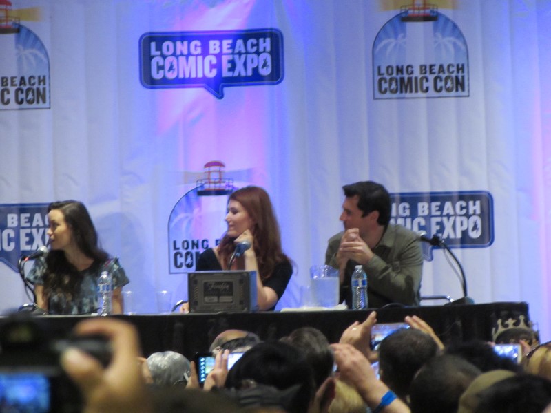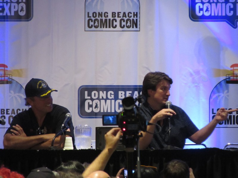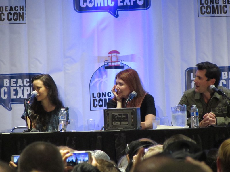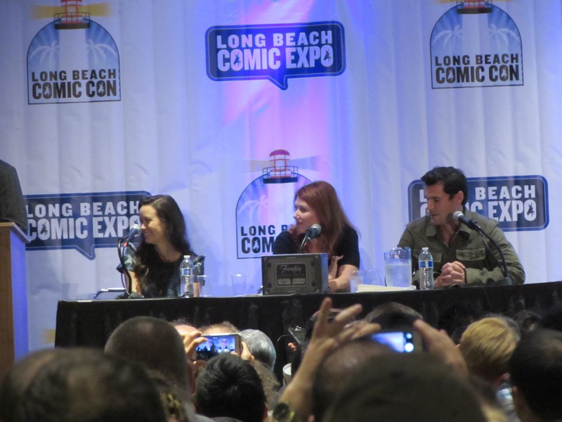 The subject of Jayne’s character came up, and Nathan Fillion expressed his disbelief about the fact that even though it was evident that Jayne would screw you any chance he got, millions of people love him anyway. In response, Adam Baldwin talked about how he was afraid that Joss Whedon would kill Jayne off, so he decided to make him lovable. Fillion also mentioned that he used to give Summer Glau a hard time on set, so he wanted to check in with her to find out if it helped prepare her for “the real world” as he intended. Glau confirmed that it did, and told Fillion, “I can’t thank you enough.” Jewel Staite was telling a story about her and Sean Maher being out to dinner the night before, but I couldn’t hear the details. The moderator soon opened it up to audience questions — which I could not hear at all. Apparently one of the audience questions was about fan fiction, and it was revealed that the audience member had written some fan fiction about Jayne and Kaylee, to which Staite seemed exasperated to find out that this young woman was responsible for that!