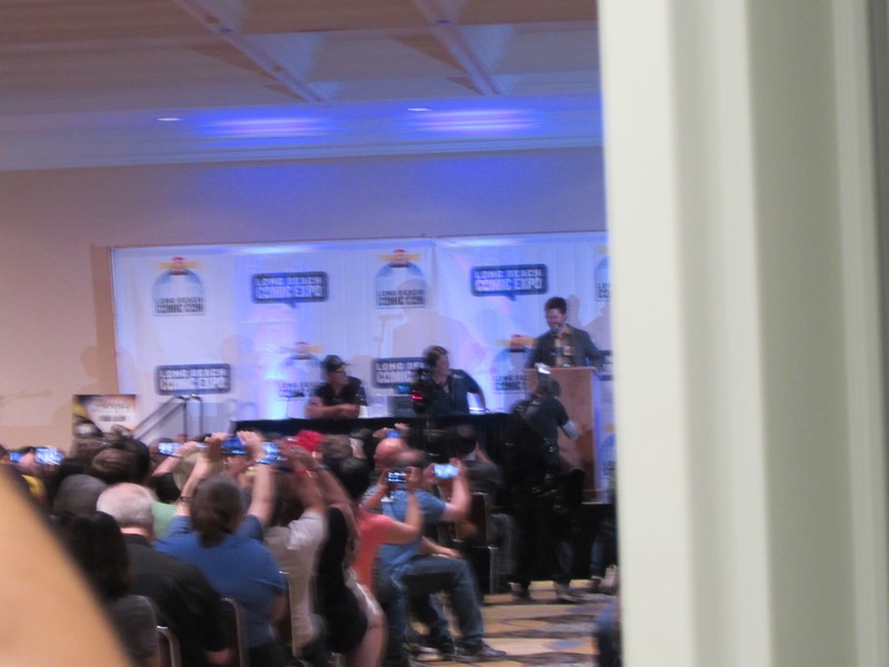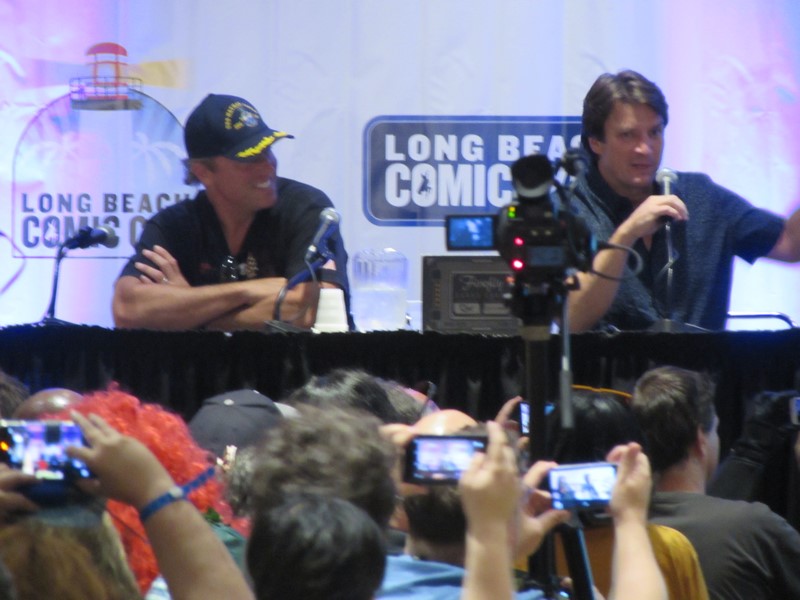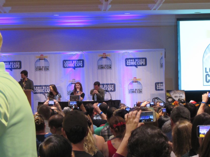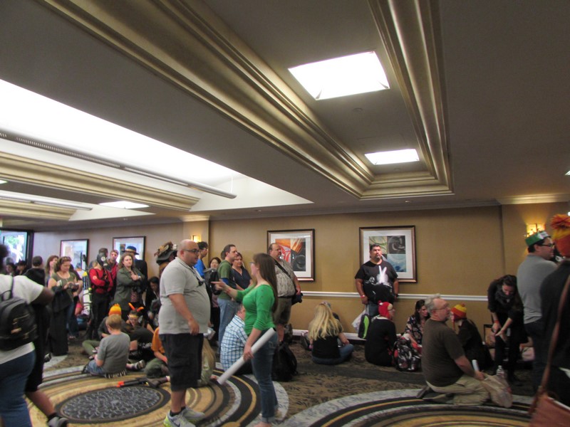 building, we were informed that LBCC would NOT be clearing the room after Con Man after all! Instead, they had left the doors to the room open, and were allowing attendees to stand in the lobby and watch and listen in. There was already a huge crowd, and we couldn’t see or hear anything, so we opted to sit down against the wall and at least wait until 3:30pm, just in case they decided to clear the room after all. I overheard a girl in front of me saying how she had paid $35 for a ticket and driven “all the way out to Long Beach” (not sure where from) just for the Firefly panel, and that she had talked to someone with LBCC earlier in the day about lining up for Firefly, who had informed her that the line for Firefly would not be allowed to form until 2:30pm, and that when she specifically asked this person, “So that means I have to choose between Con Man and Firefly?” that person had confirmed that that was the case. As mentioned above, this had been our understanding of the policy as well.