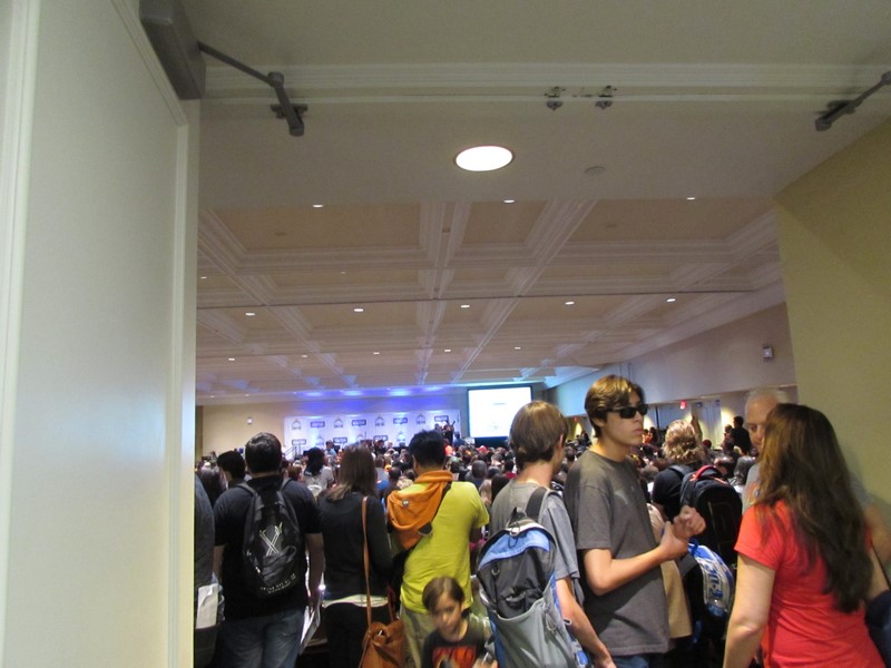 3:30pm rolled around, and the Con Man panel concluded. The room was not cleared. I saw only a very small handful of people leave the room, while the crowd waiting outside in the lobby pushed forward into the room, hoping to find seats. I’m guessing only a very few were lucky. This at least let me get to the front of the crowd standing outside. However, we were told that there had to be a certain amount of space outside the doors of the room, and that the crowd standing outside would have to move back to where the pillars were. So we followed the directions and did so. Of course, then other people came and stood in front of us in this wide open space, and we got pushed back further. Meanwhile, people kept coming up and asking about the room being cleared, and the volunteer manning the doors had to keep giving the bad news, and telling people that she was just a volunteer and didn’t have anymore information.