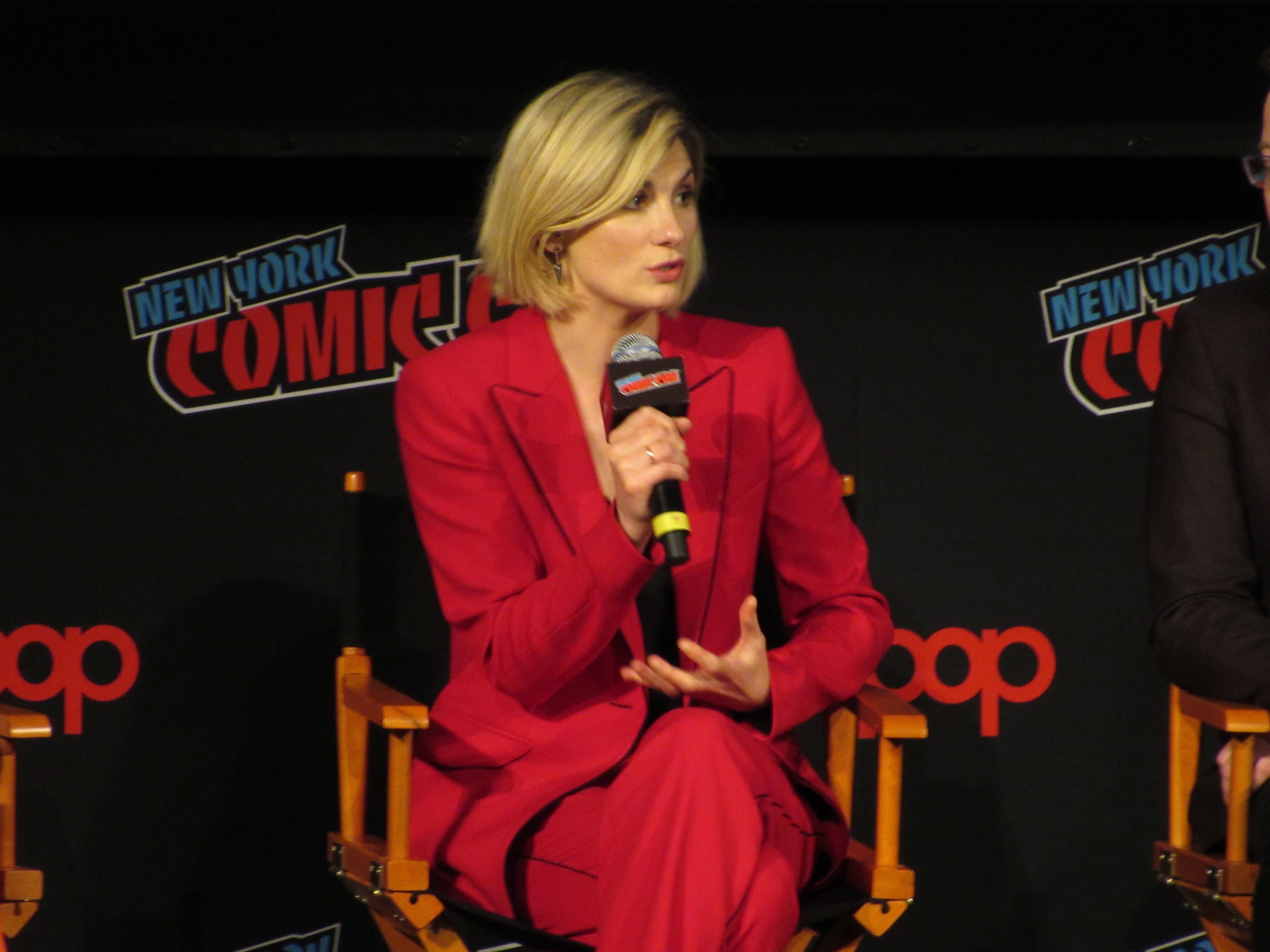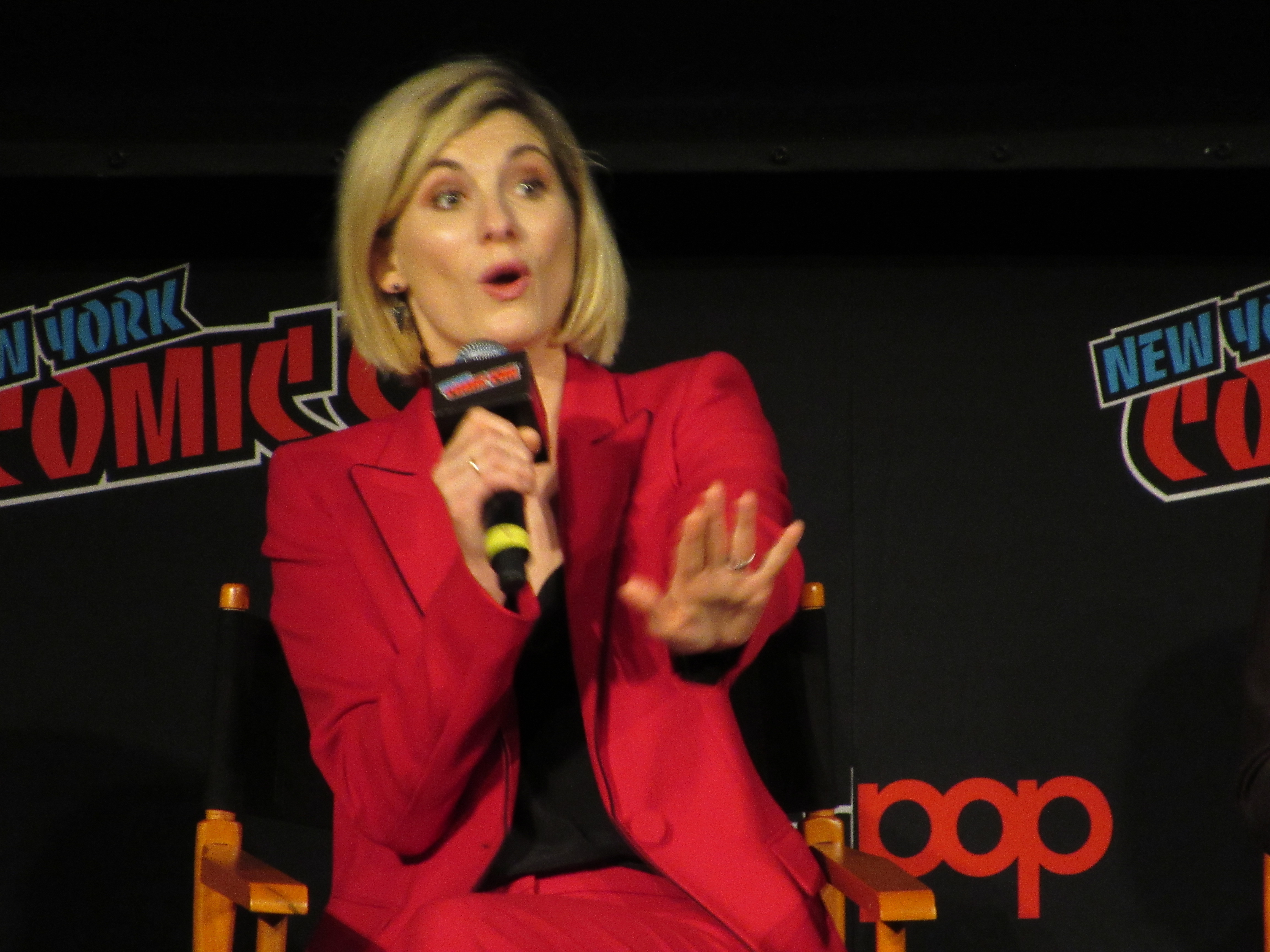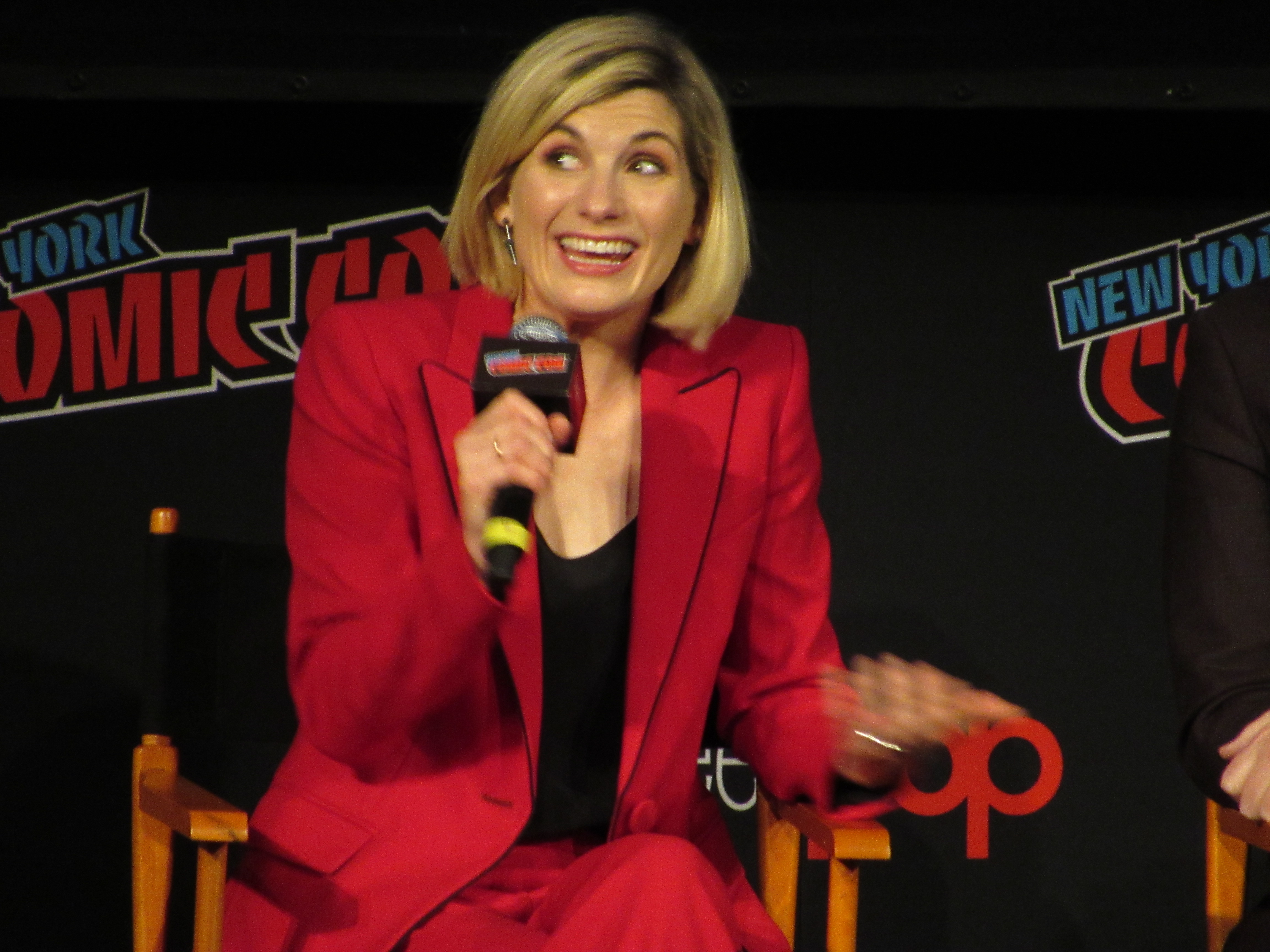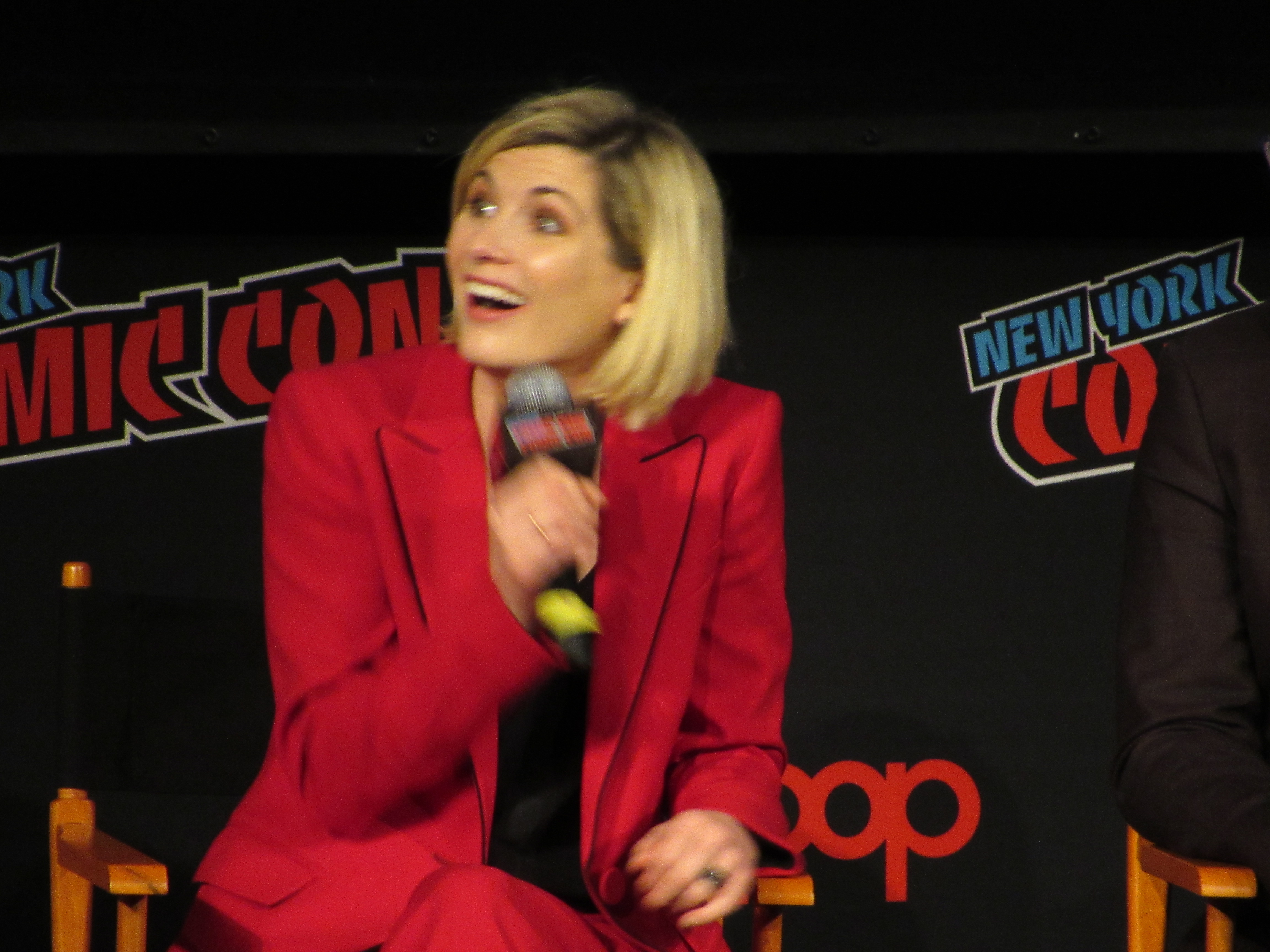Switching gears to talk about the stunts, the moderator brought up the crane jump. Whittaker revealed that this was done on Day 2, and she was given the option to either do it herself or have a stunt person do it. It was very high, but Whittaker wanted to look brave in front of everyone, so she did the stunt herself! She admitted that there were times throughout the season that there were stunts she wasn’t properly trained for that she couldn’t do, but that in this case it was safe. Plus, she felt like it needed her “clumsiness” to have the authenticity that it should for a new Doctor in a new body.