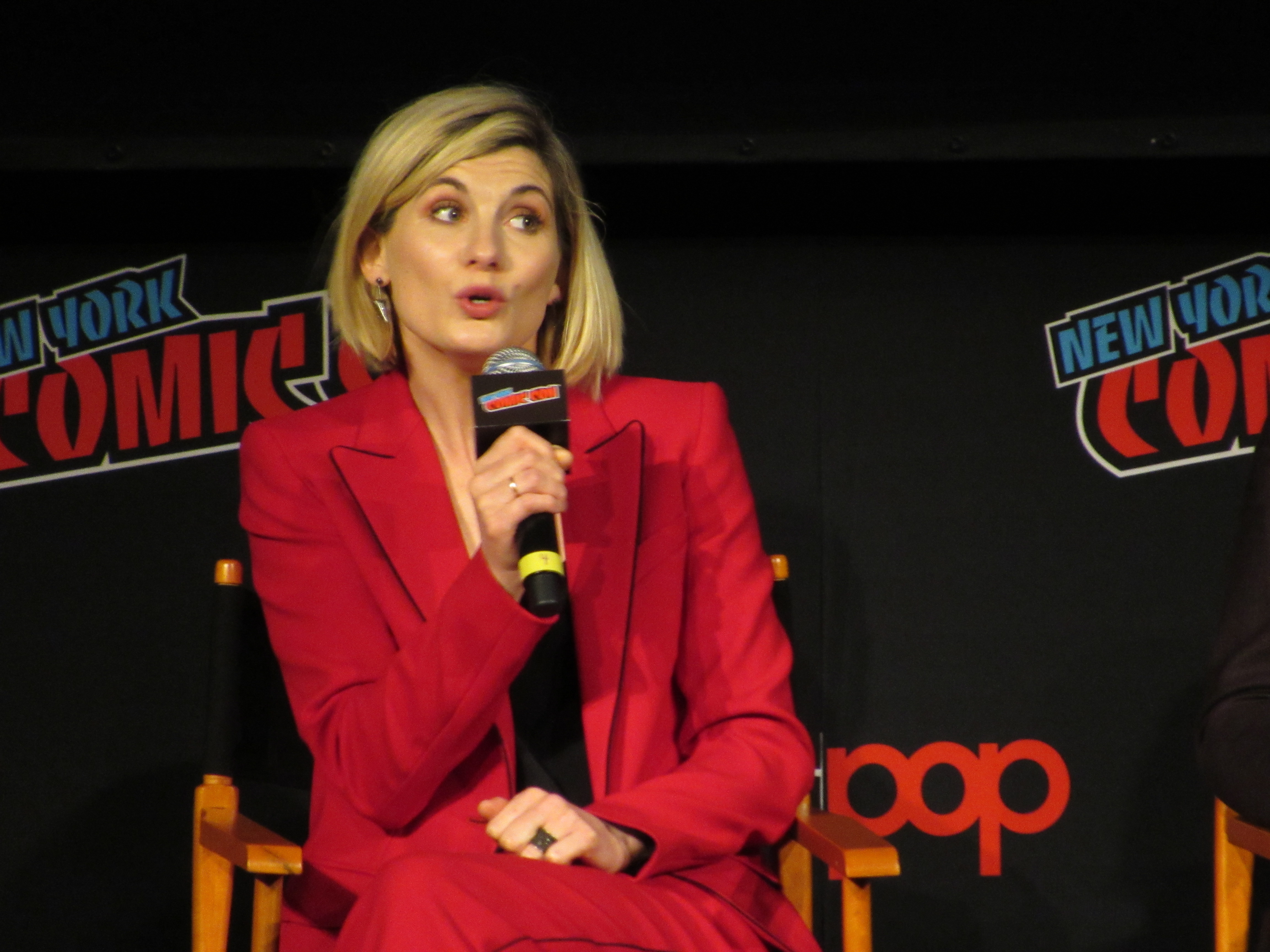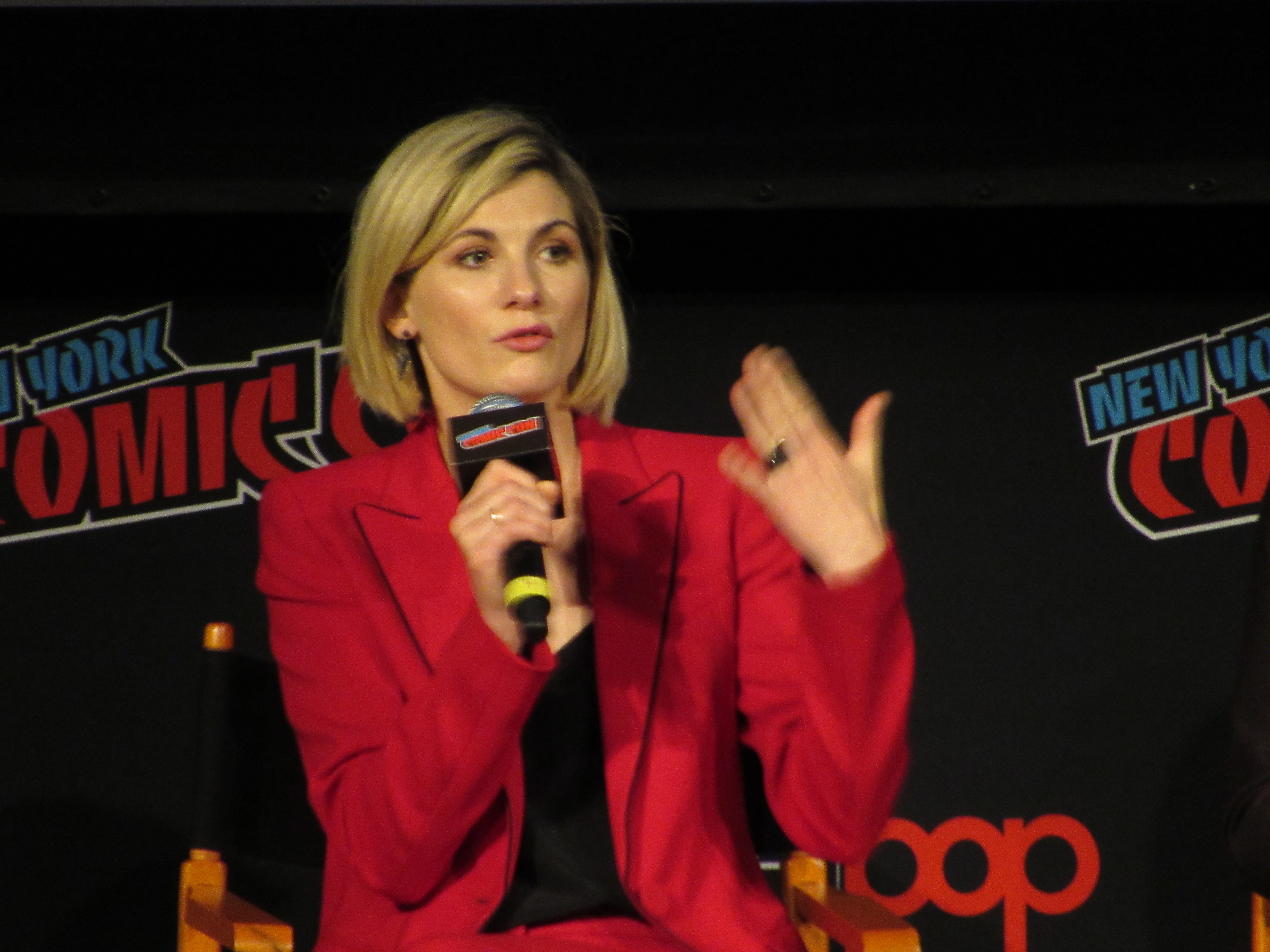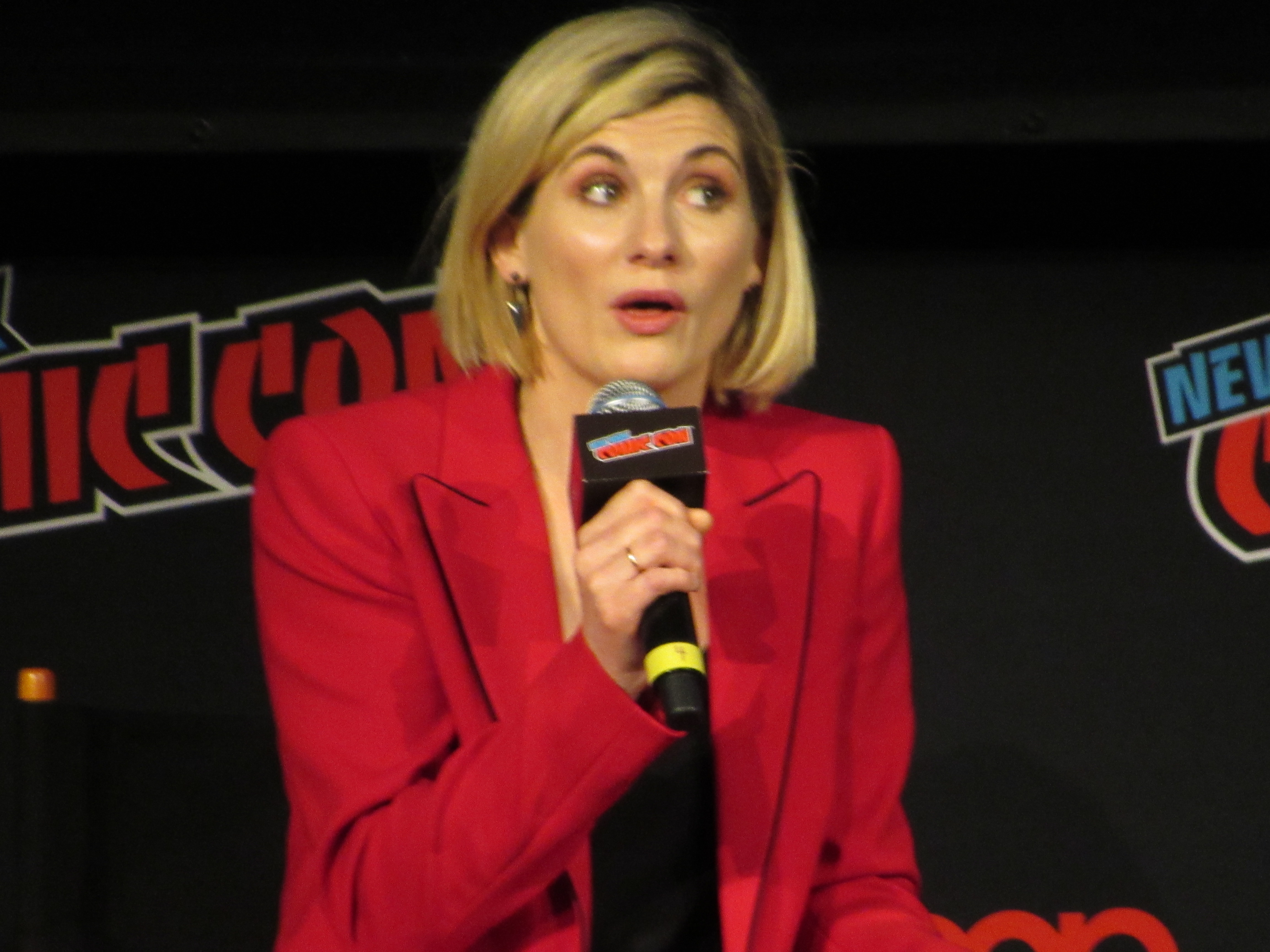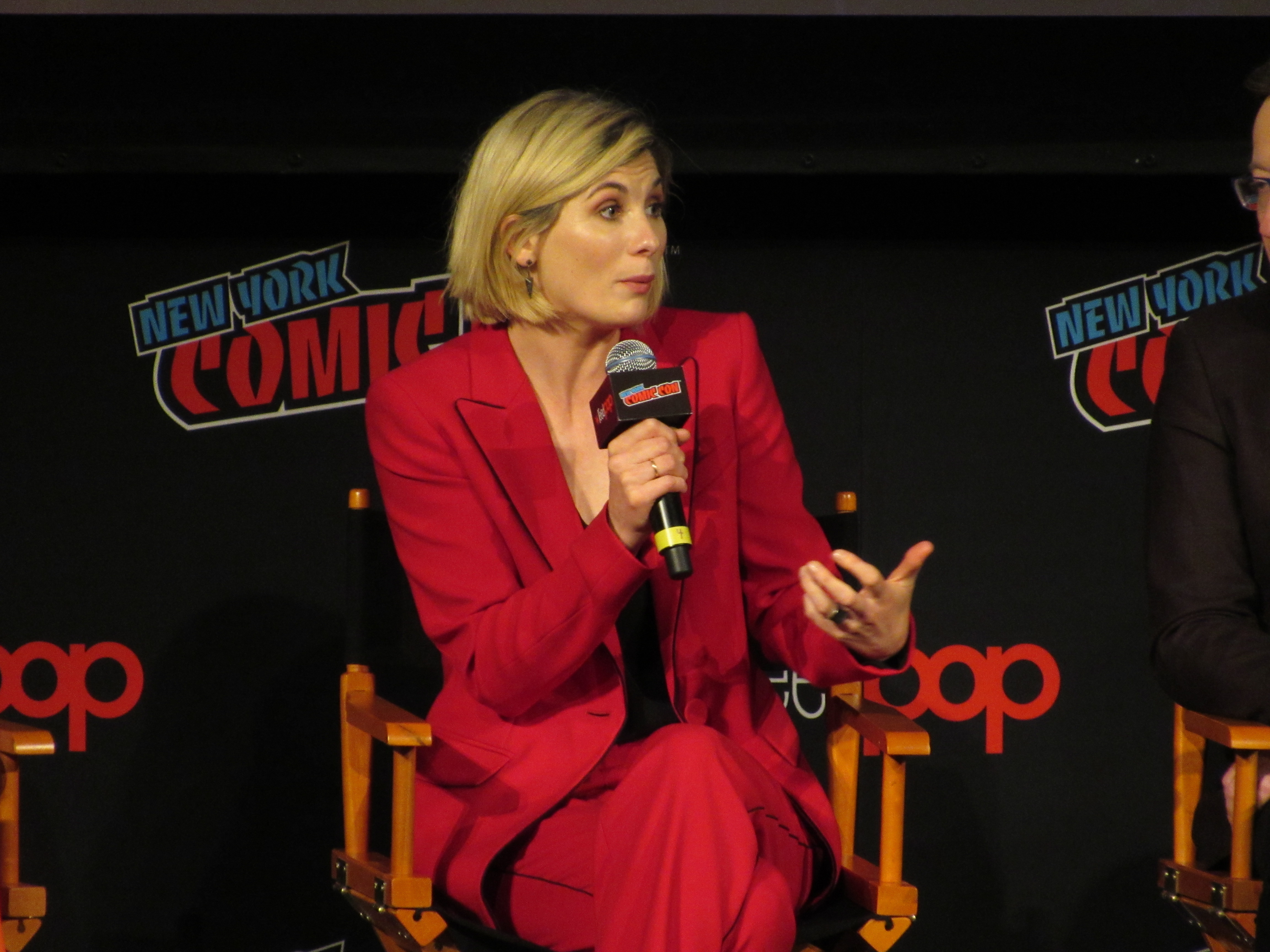 Switching gears to talk about the stunts, the moderator brought up the crane jump. Whittaker revealed that this was done on Day 2, and she was given the option to either do it herself or have a stunt person do it. It was very high, but Whittaker wanted to look brave in front of everyone, so she did the stunt herself! She admitted that there were times throughout the season that there were stunts she wasn’t properly trained for that she couldn’t do, but that in this case it was safe. Plus, she felt like it needed her “clumsiness” to have the authenticity that it should for a new Doctor in a new body.
