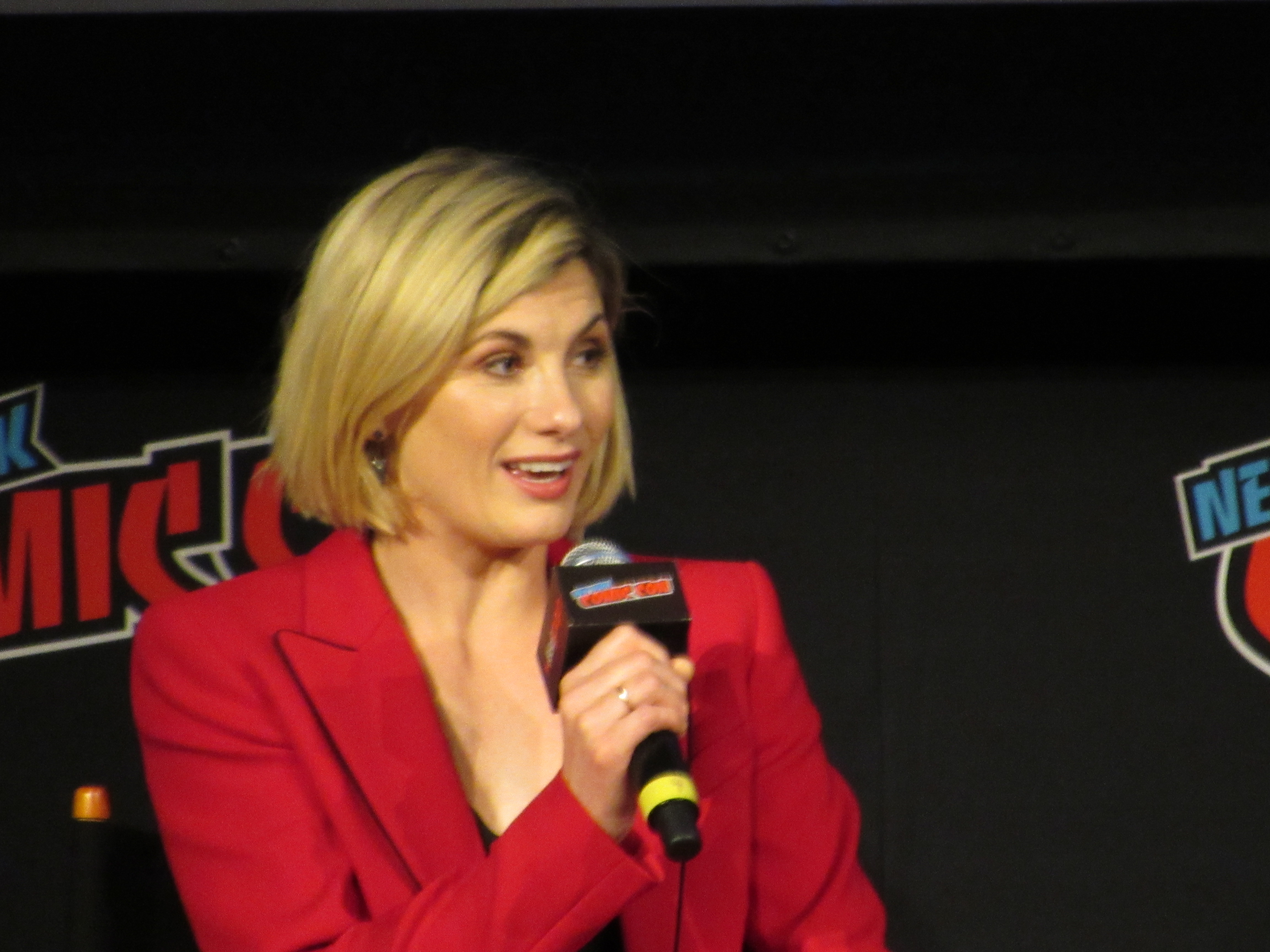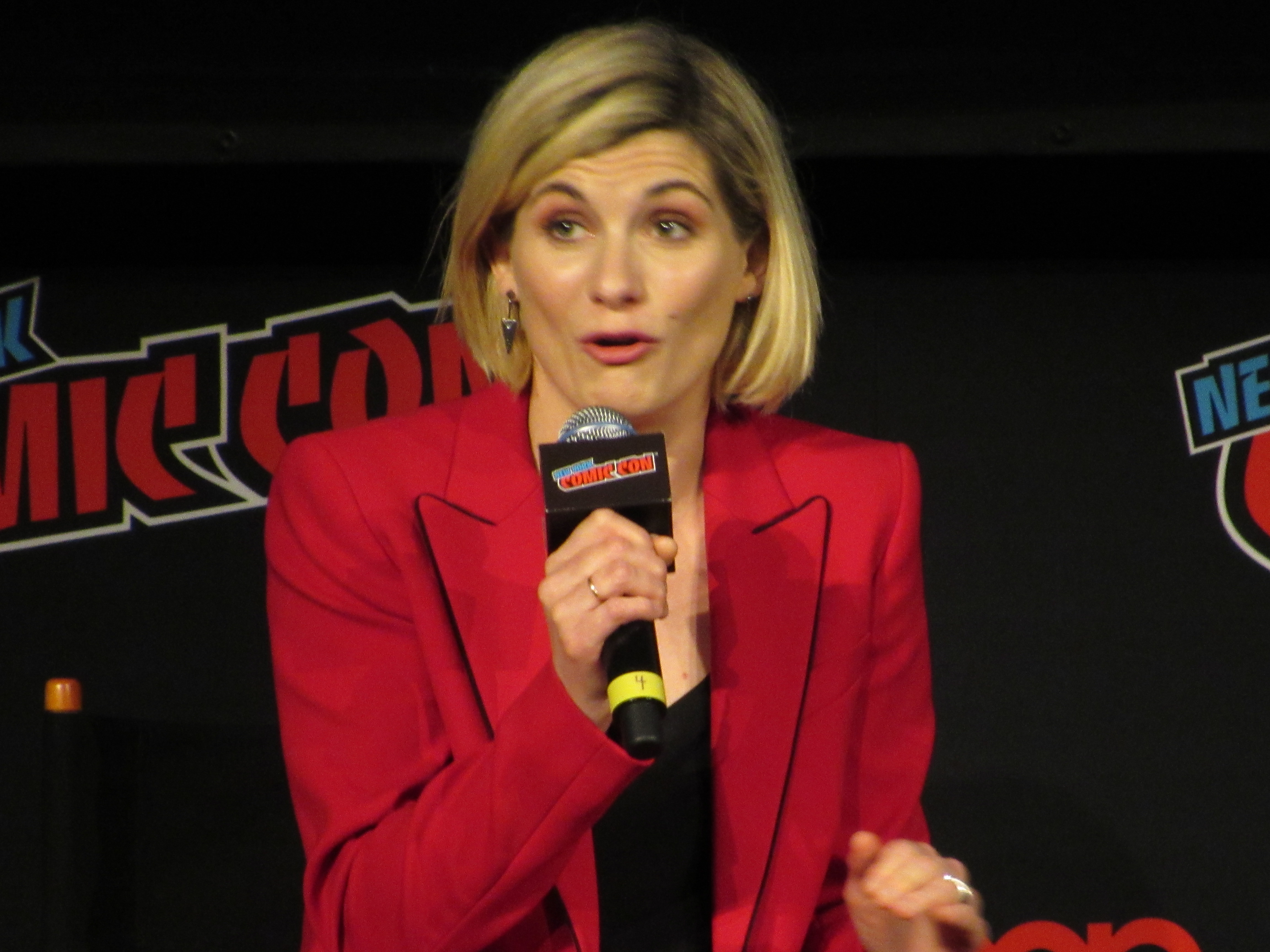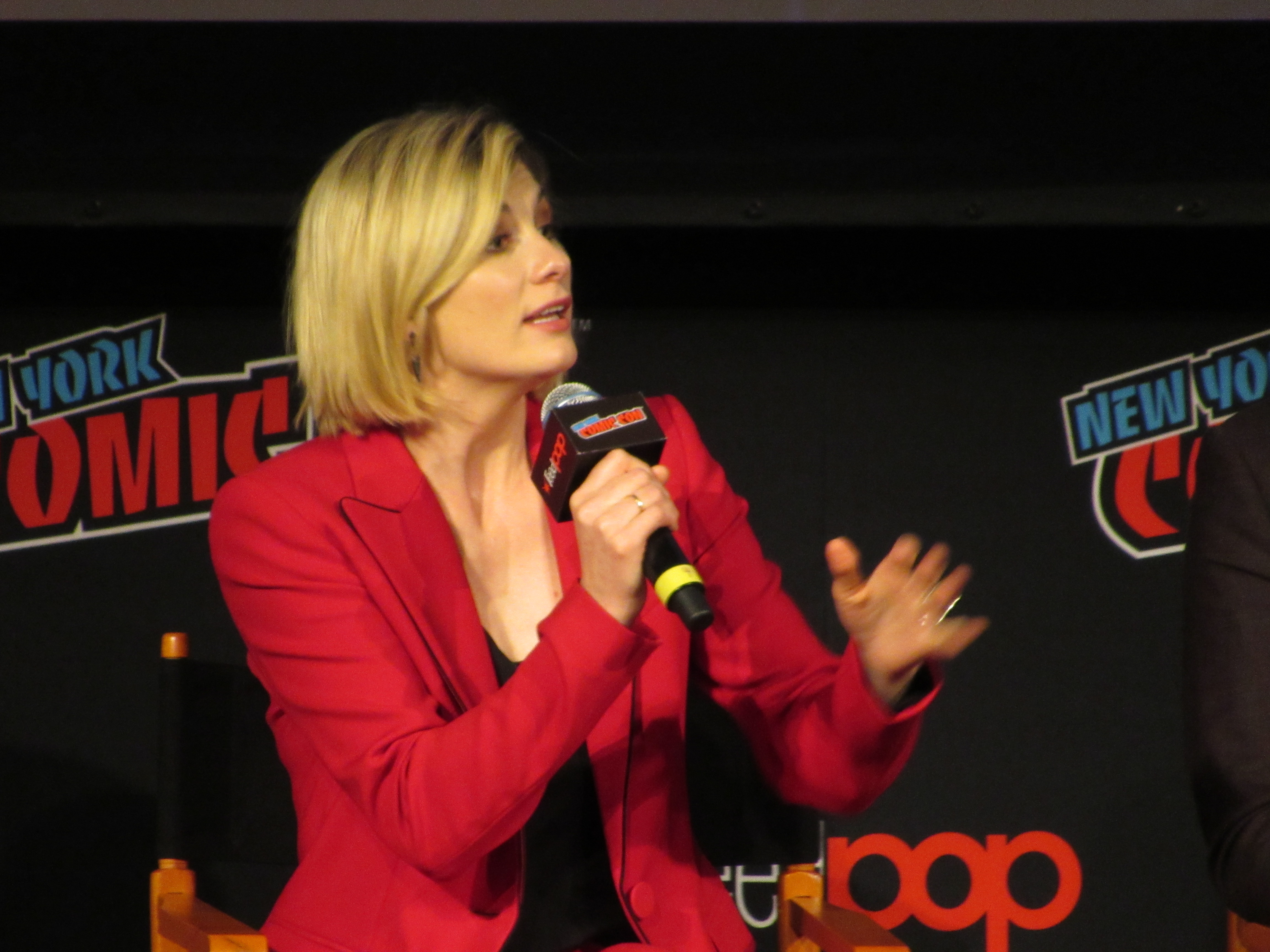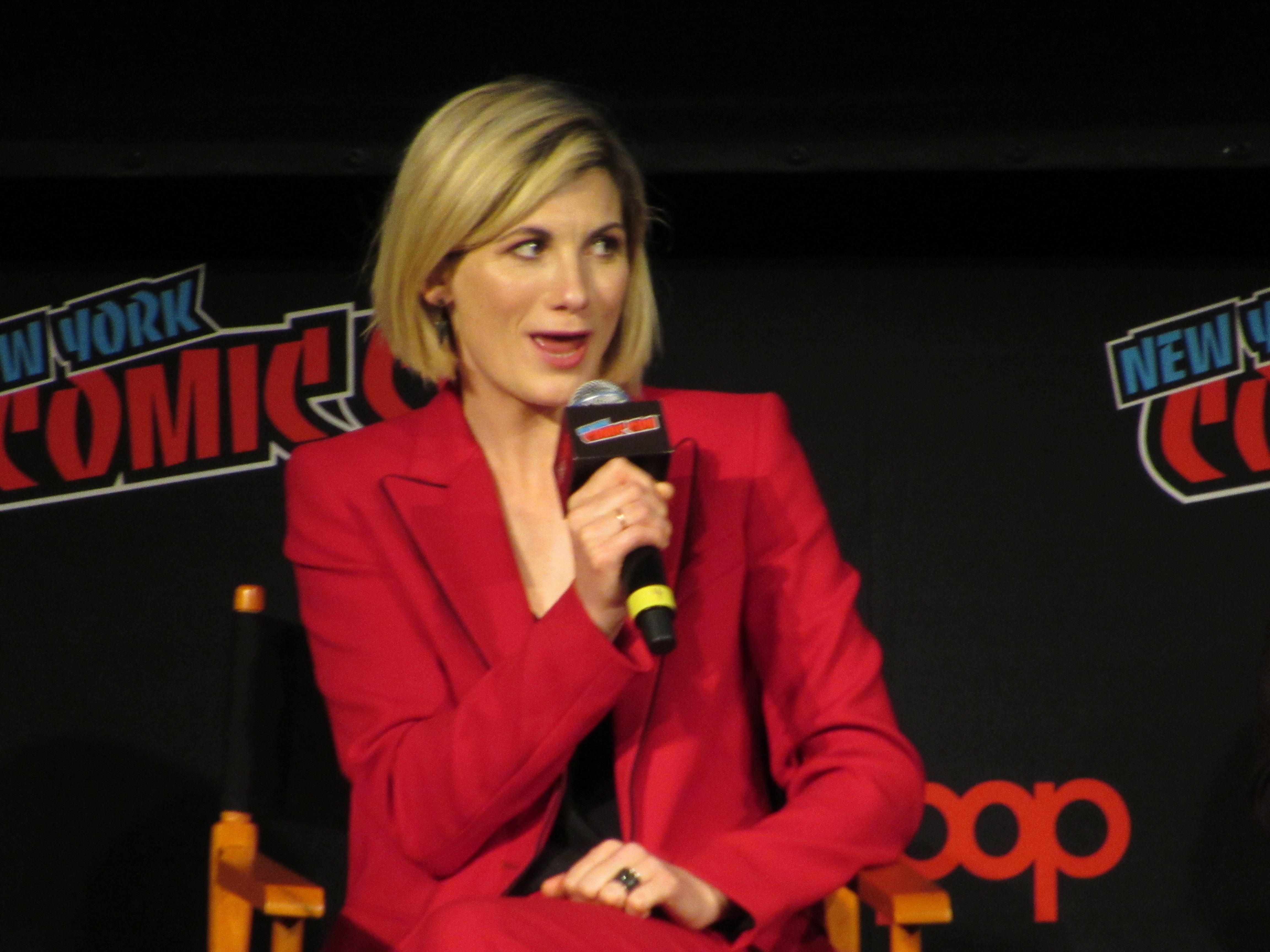 Switching gears to talk about the stunts, the moderator brought up the crane jump. Whittaker revealed that this was done on Day 2, and she was given the option to either do it herself or have a stunt person do it. It was very high, but Whittaker wanted to look brave in front of everyone, so she did the stunt herself! She admitted that there were times throughout the season that there were stunts she wasn’t properly trained for that she couldn’t do, but that in this case it was safe. Plus, she felt like it needed her “clumsiness” to have the authenticity that it should for a new Doctor in a new body.