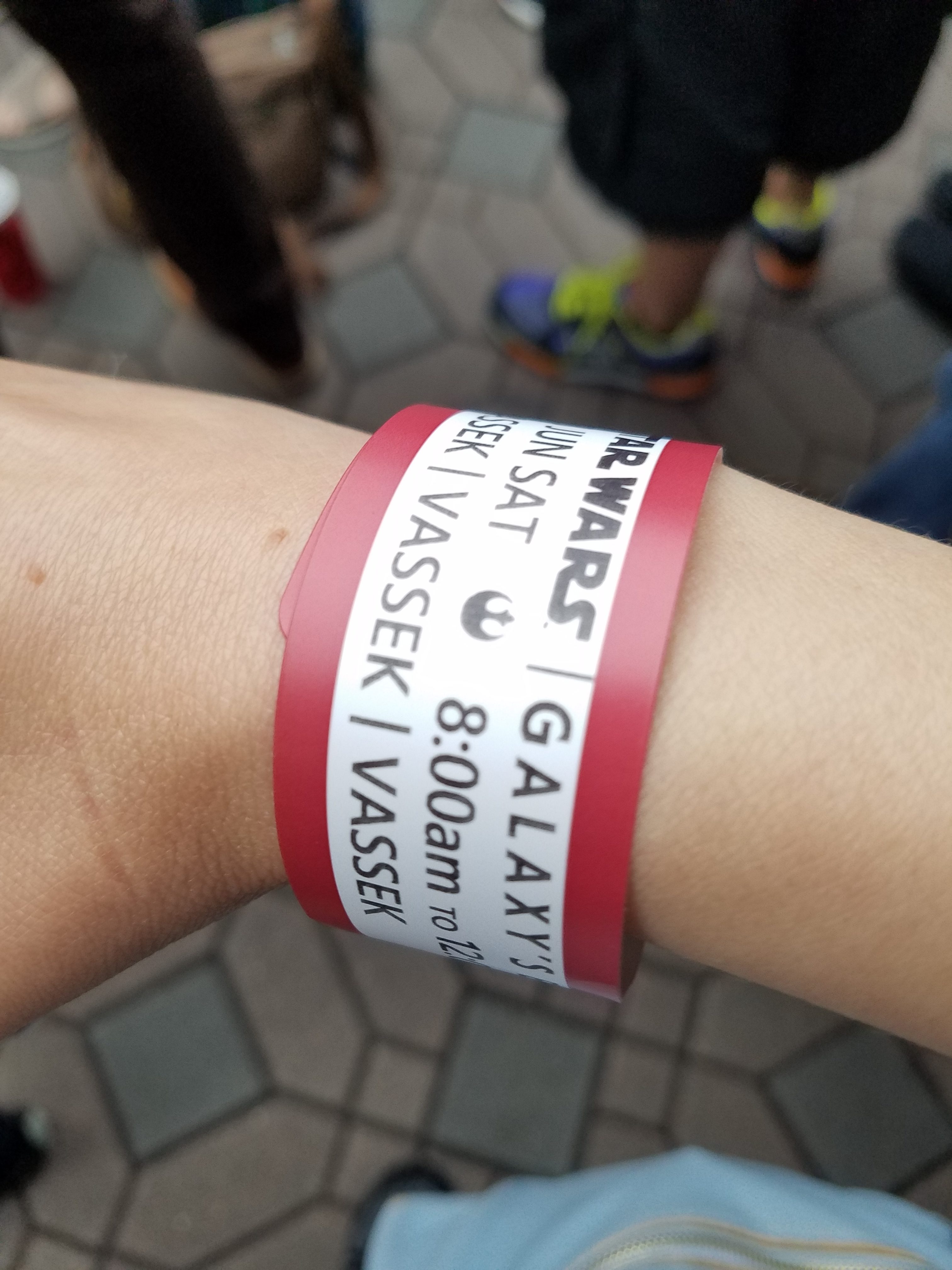 Along the way, we were told to hold up our wrists so that they could see our wristbands. Just before going under the final bridge before Star Wars Land, there were several Cast Members scanning the QR code. Diana got through this checkpoint much quicker than the rest of us. I motioned for her to go ahead and go on, but she waited for us instead. By the time the rest of us got through about 30-45 seconds later, the crowd waiting up ahead had doubled the size it was when Diana had gotten through. Foiled again!