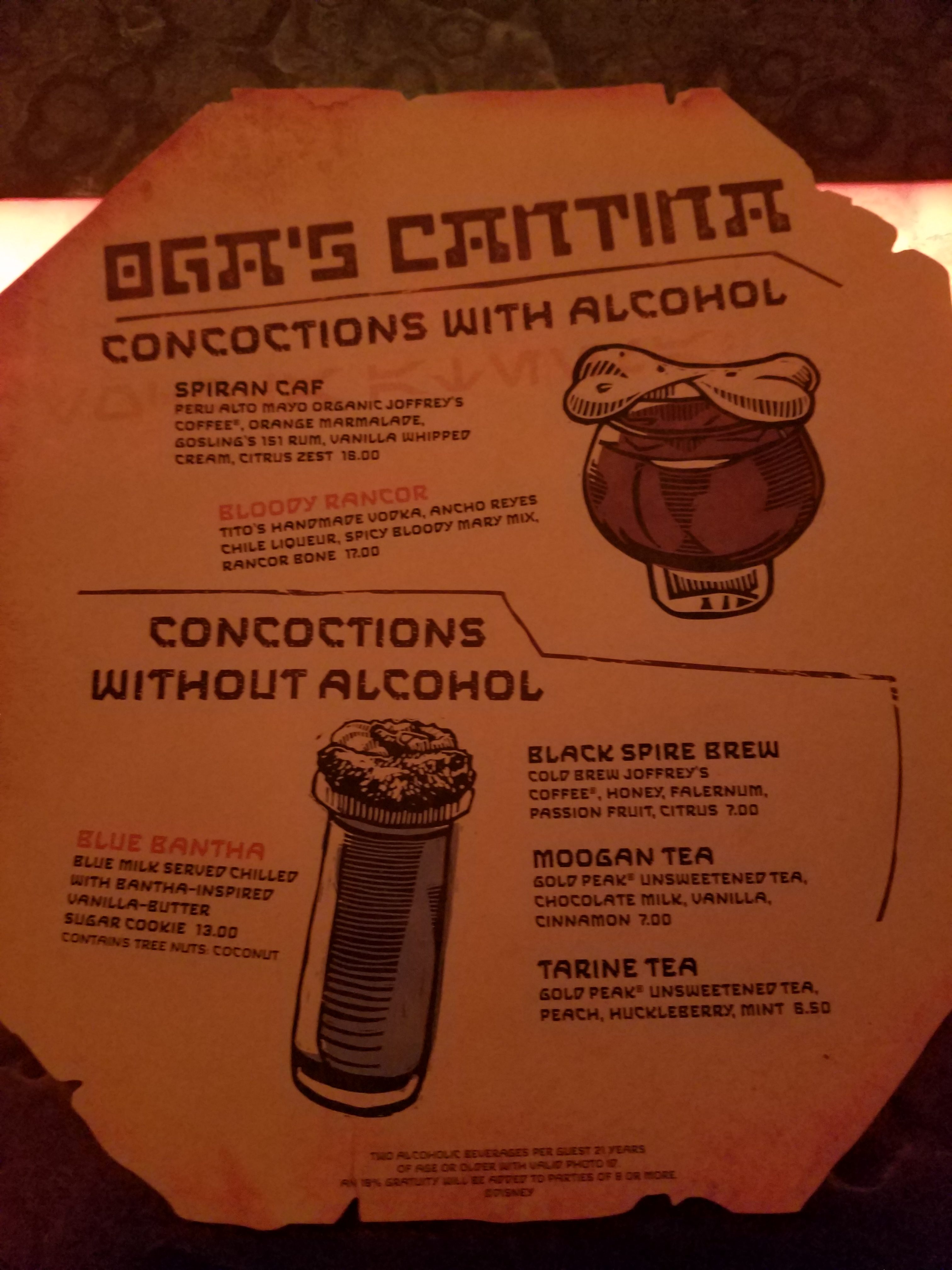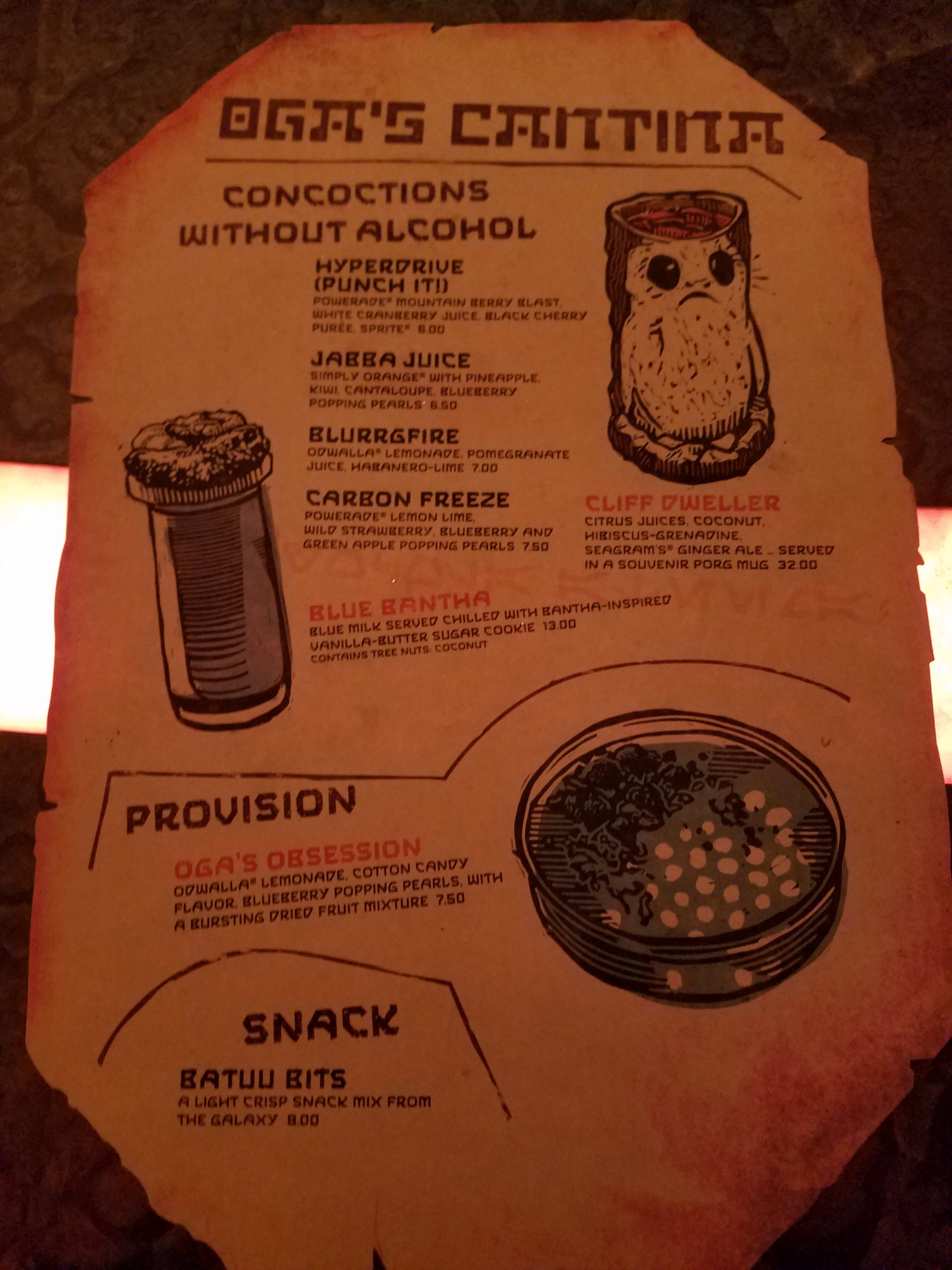 - Savi’s Workshop OR Oga’s Cantina. Check in and get in line early prior to your time slot start time if you want to do either of these. You’ll probably only be able to do one, not both.