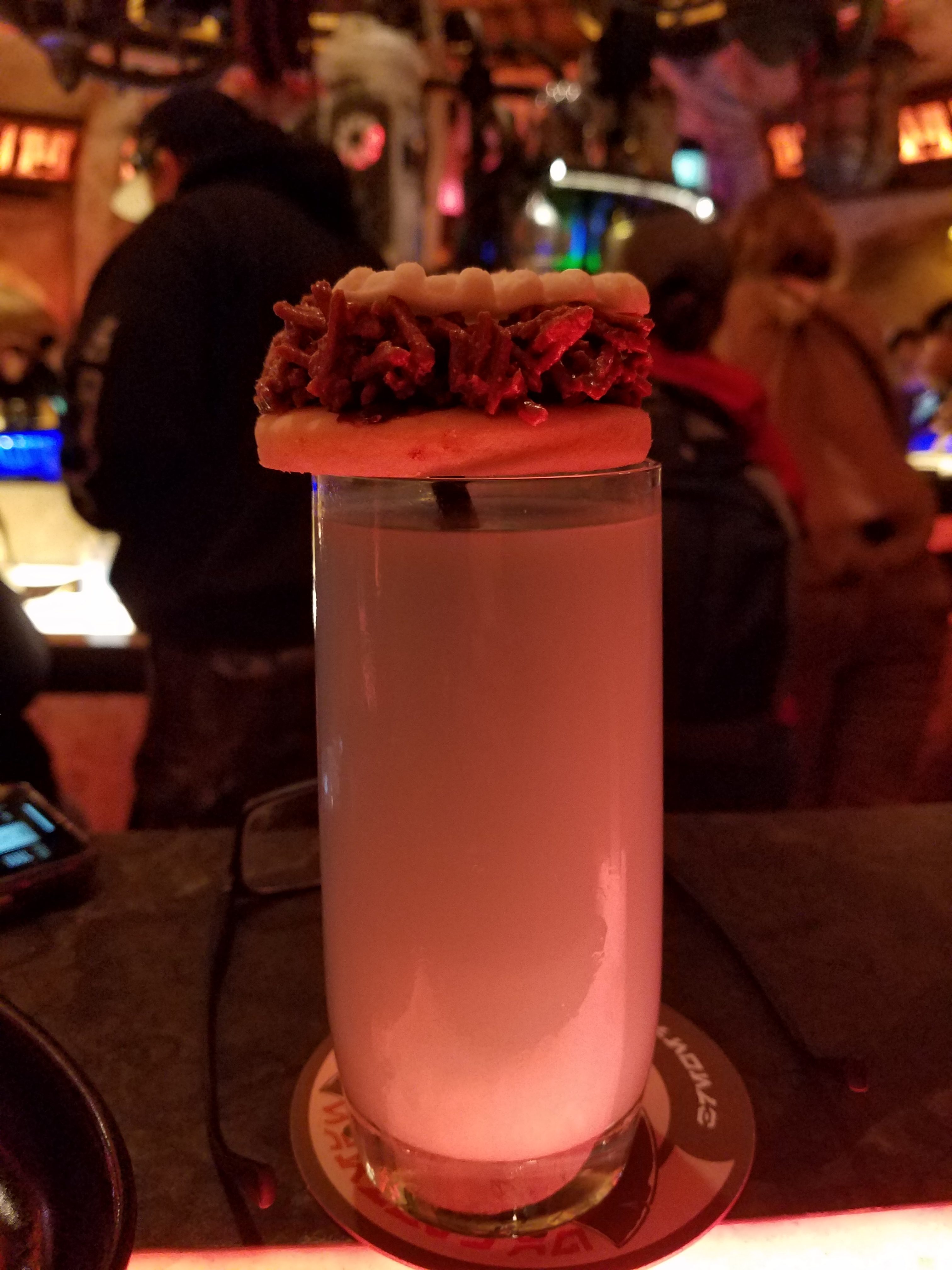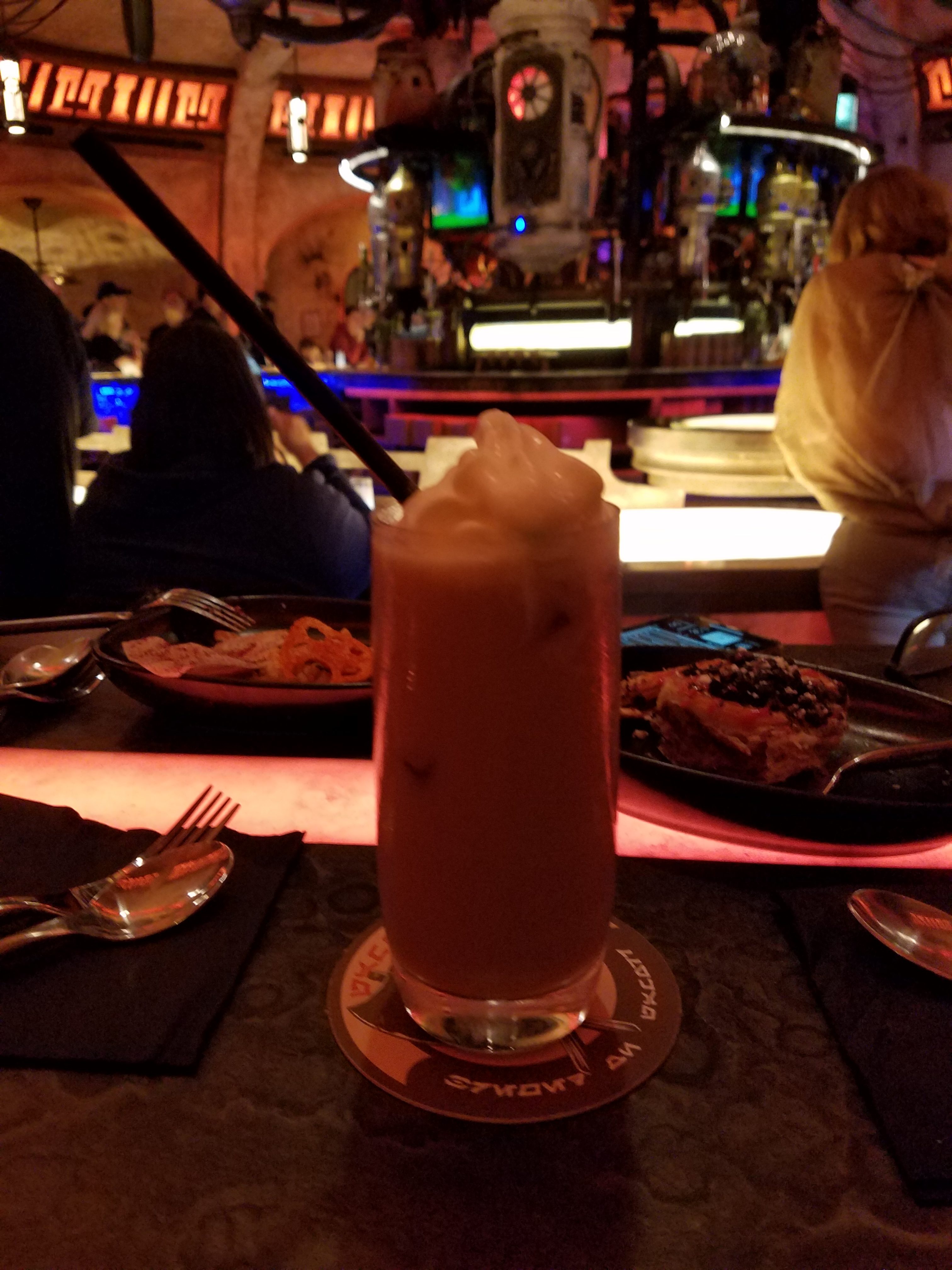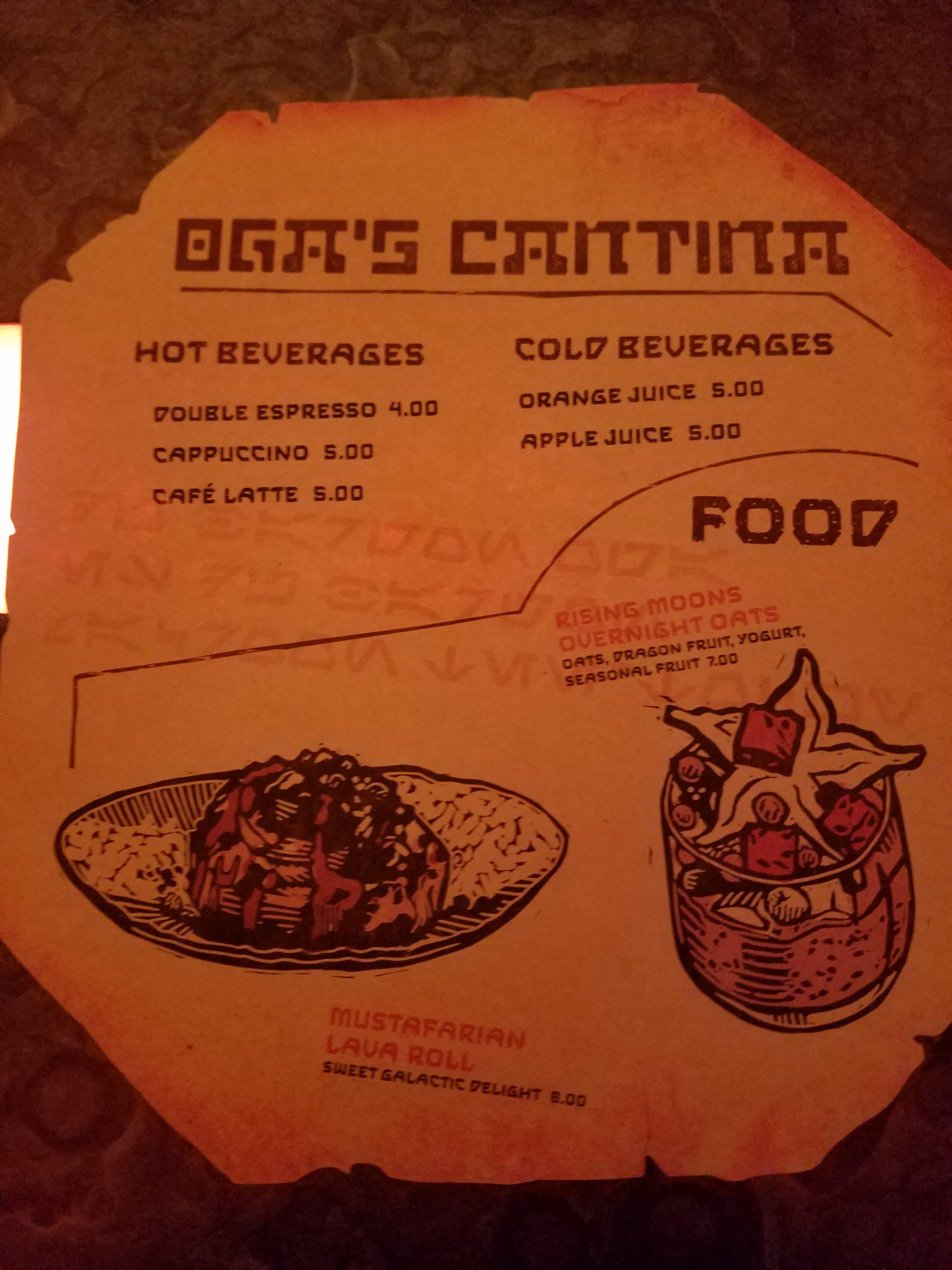 As for food, we tried the Batuu Bits, Rising Moons Overnight Oats, and Mustafarian Lava Roll. We all agreed that the Lava Roll was the best of the three. The Batuu Bits was an odd assortment of what seemed like freeze-dried items, or “Astronaut food.” It was a mix of sweet, spicy, and salty. Some of it was okay, but some of it was just plain gross. Would not get this again. The Oats were pretty good, a mixture of fruit and yogurt, while the Lava Roll was like a cinnamon roll, except with raspberry icing and Oreo cookie bits.