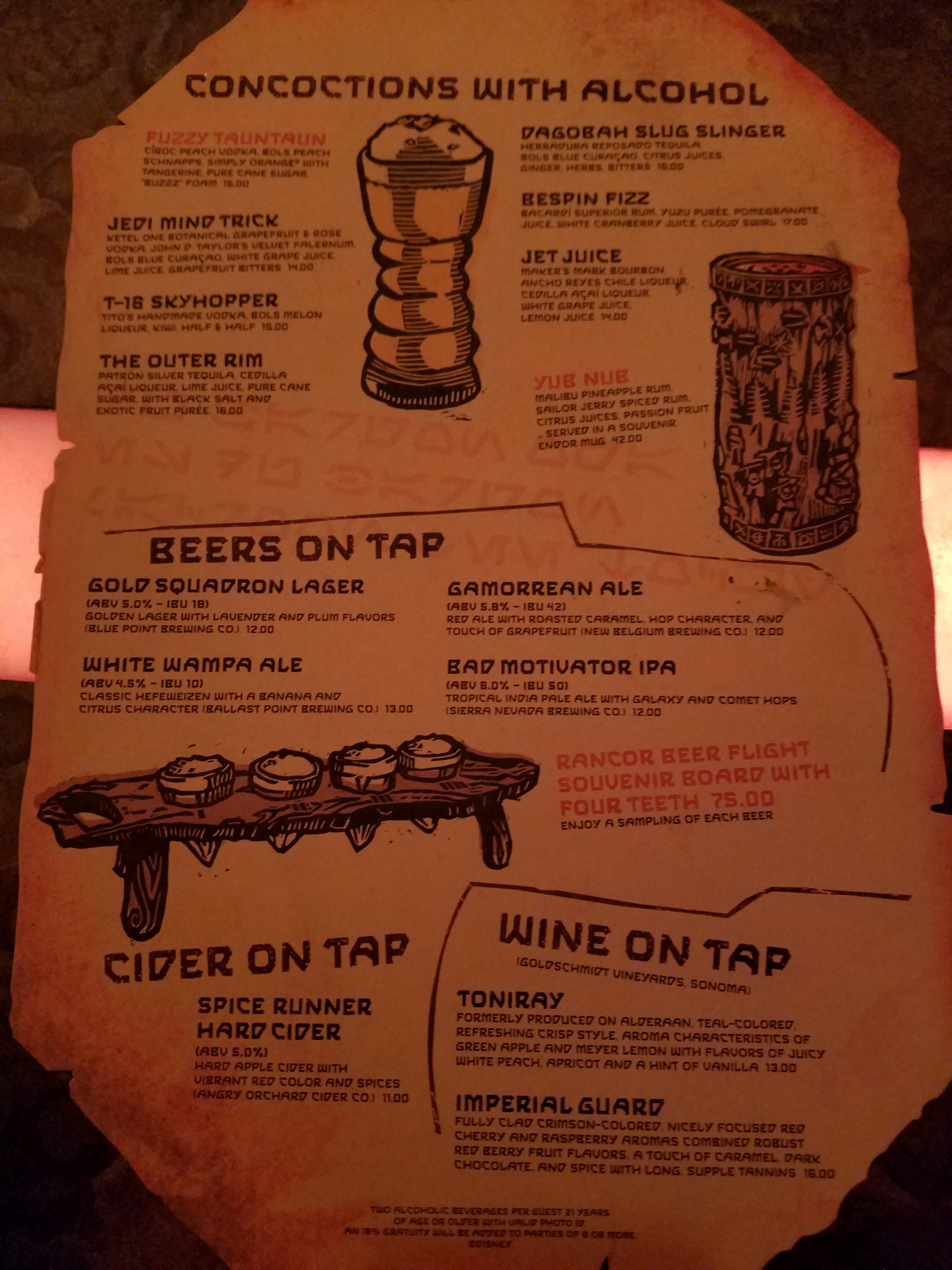 At this point, we were all pretty hungry, considering we hadn’t had anything to eat besides the little bit of food we had shared at Oga’s Cantina earlier. So we headed over to Docking Bay 7, which is a counter serve restaurant. This means that you place your order, pick it up at the counter, then go find a place to sit down and eat. Yes, you can place a mobile order, but the line was pretty short, and we didn’t know what we wanted to order yet anyway, so it helped to be able to see the menu and gave us a couple minutes to decide.
