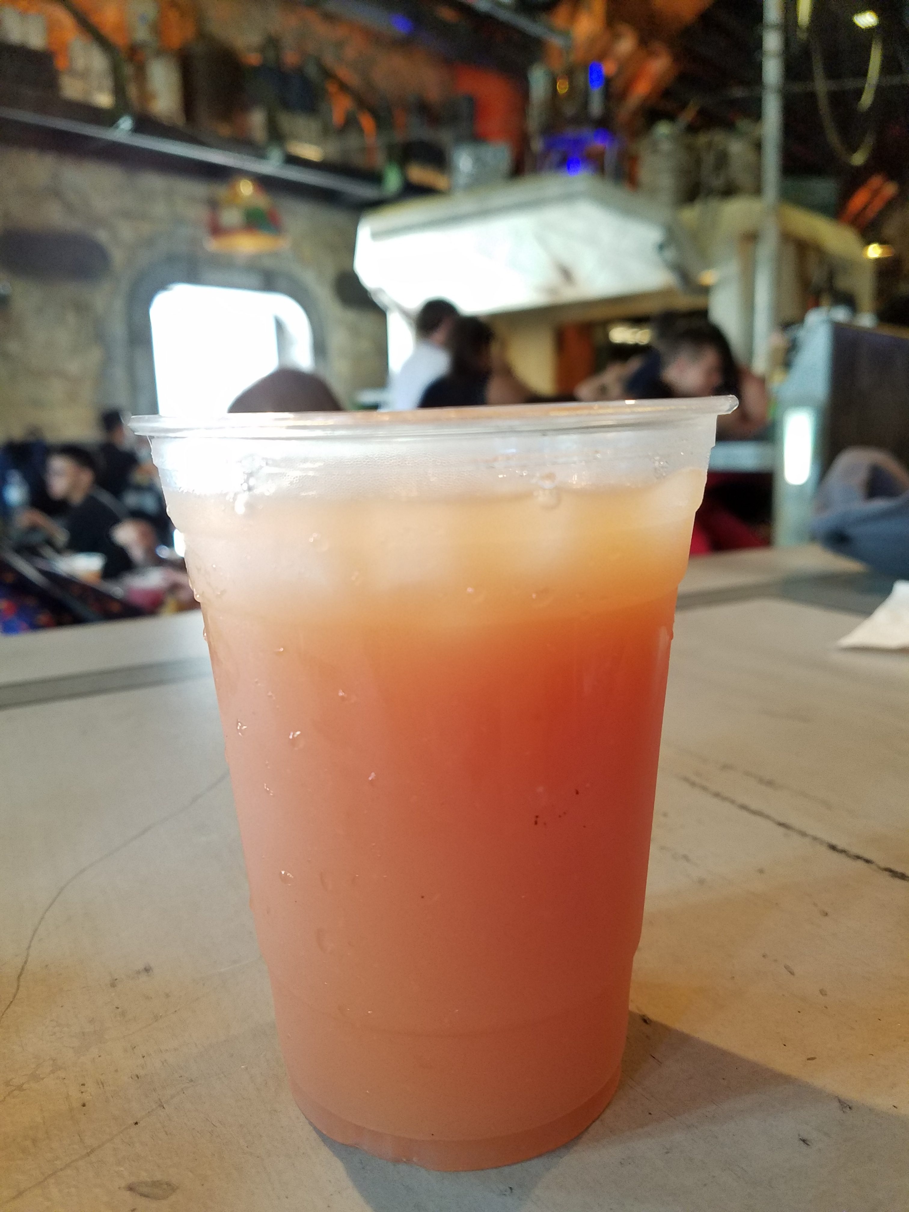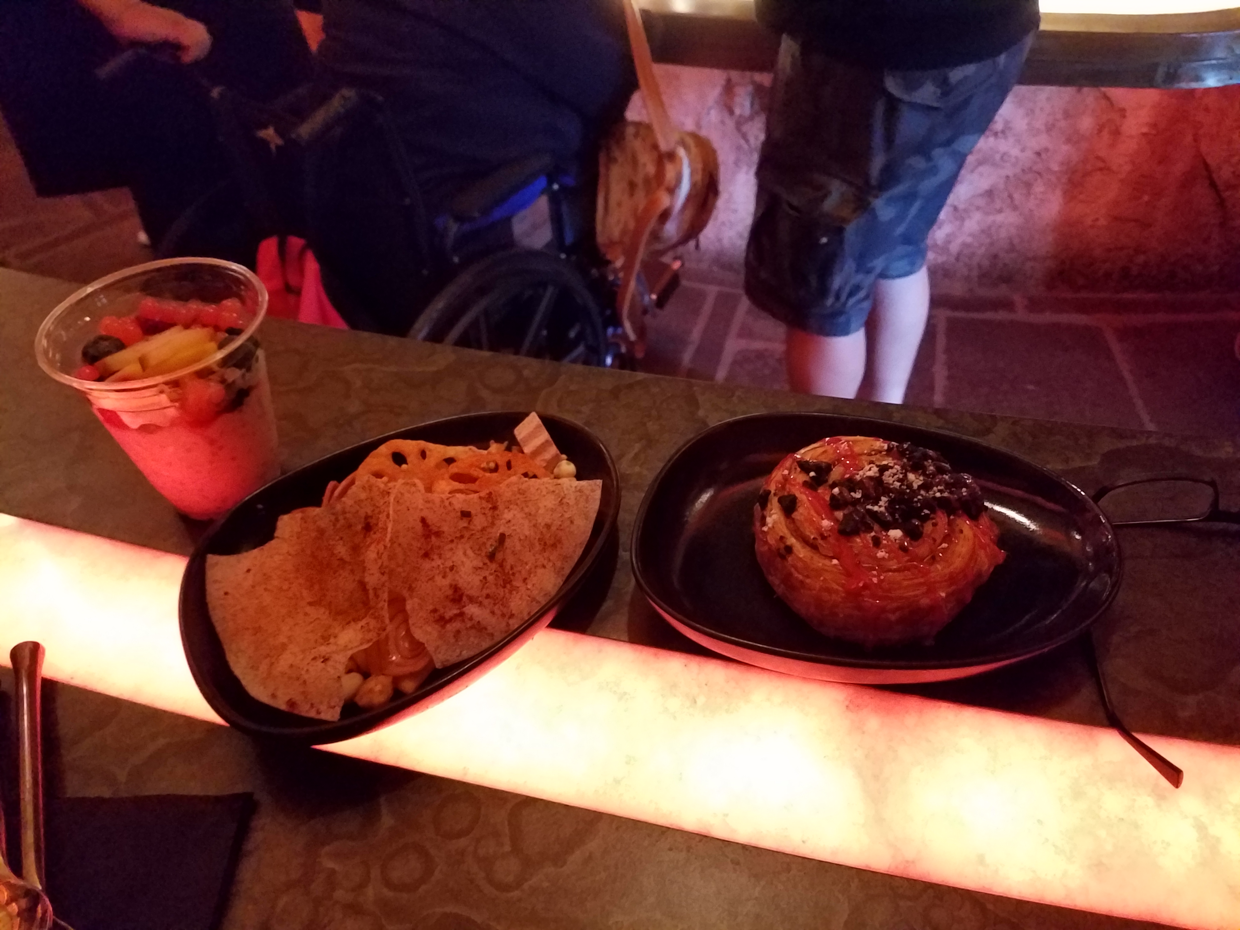 We each got a drink (all non-alcoholic), and ordered a few of the food items to share. The food was brought out first, within just a couple of minutes, followed by the drinks just a couple of minutes later, along with the check. I was surprised as how quick the service was, based on all the complaints I’d read about how slow they were at the Cantina. Maybe because it was first thing in the morning and they hadn’t gotten a chance to get backed up yet. We were probably only there for about 30 minutes tops. They do try to make use of all available space. About a minute before we left, two people were “seated” at the end of the table we were occupying.