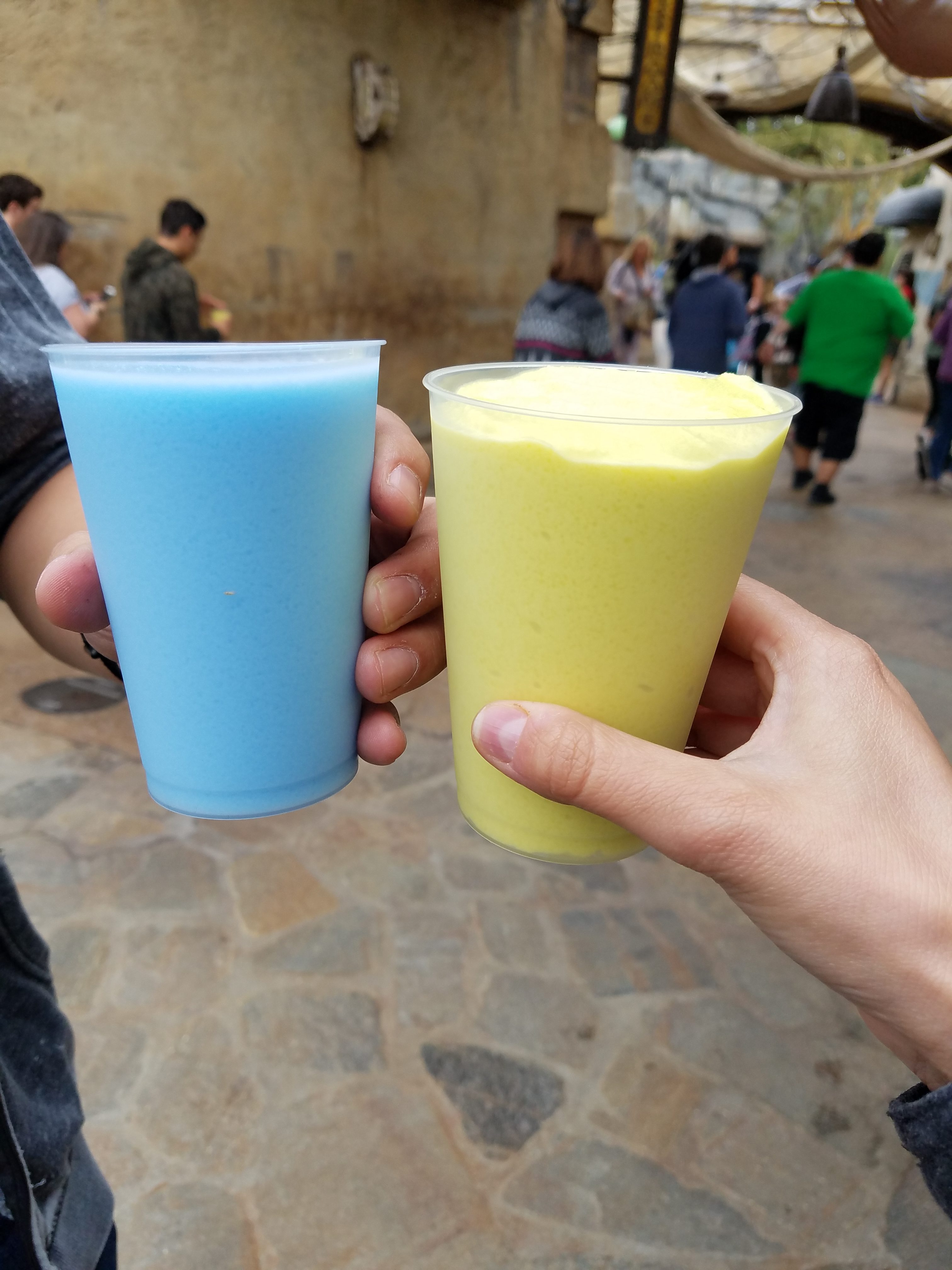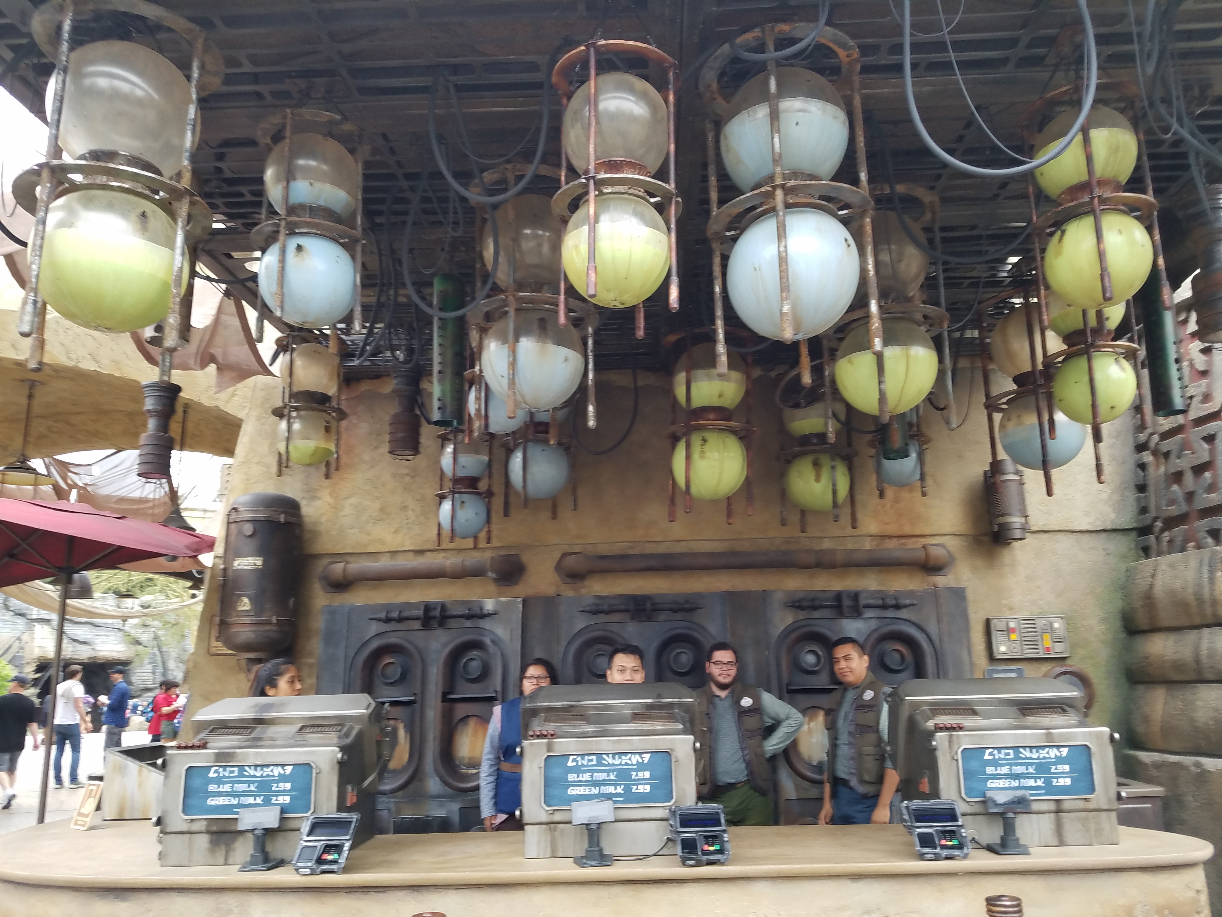 As mentioned above, the Blue Milk from the Milk Stand is different from the Blue Milk at Oga’s Cantina. The Milk Stand’s Blue Milk has more of a slushy consistency, while the Blue Bantha from Oga’s Cantina is just liquid. Oddly, no straws were provided at the Milk Stand for the Blue Milk and Green Milk, although we had been given straws in our drinks at Oga’s. This made the “milks” difficult to drink. Especially the Green Milk, as it was more frozen than the Blue Milk.