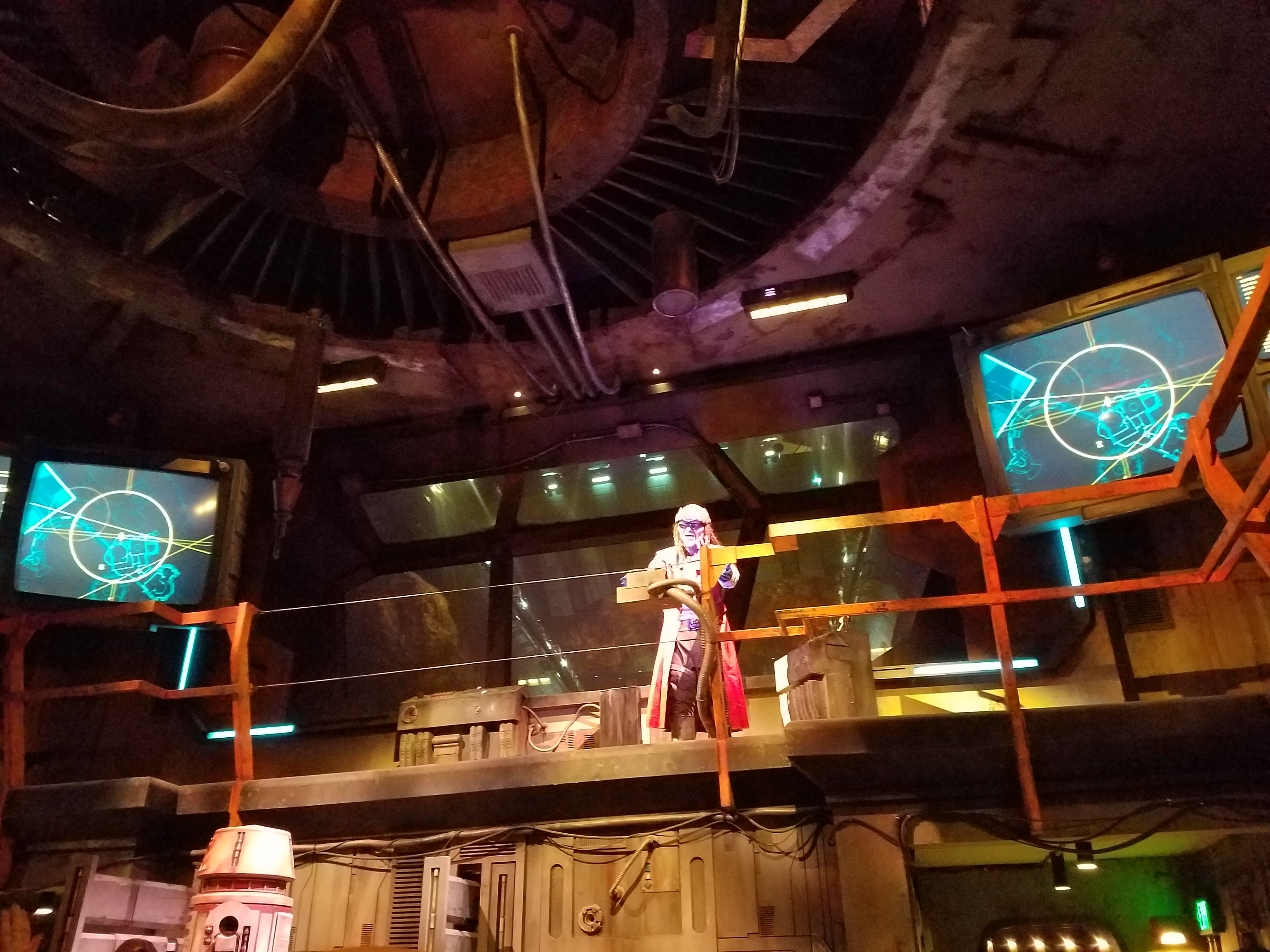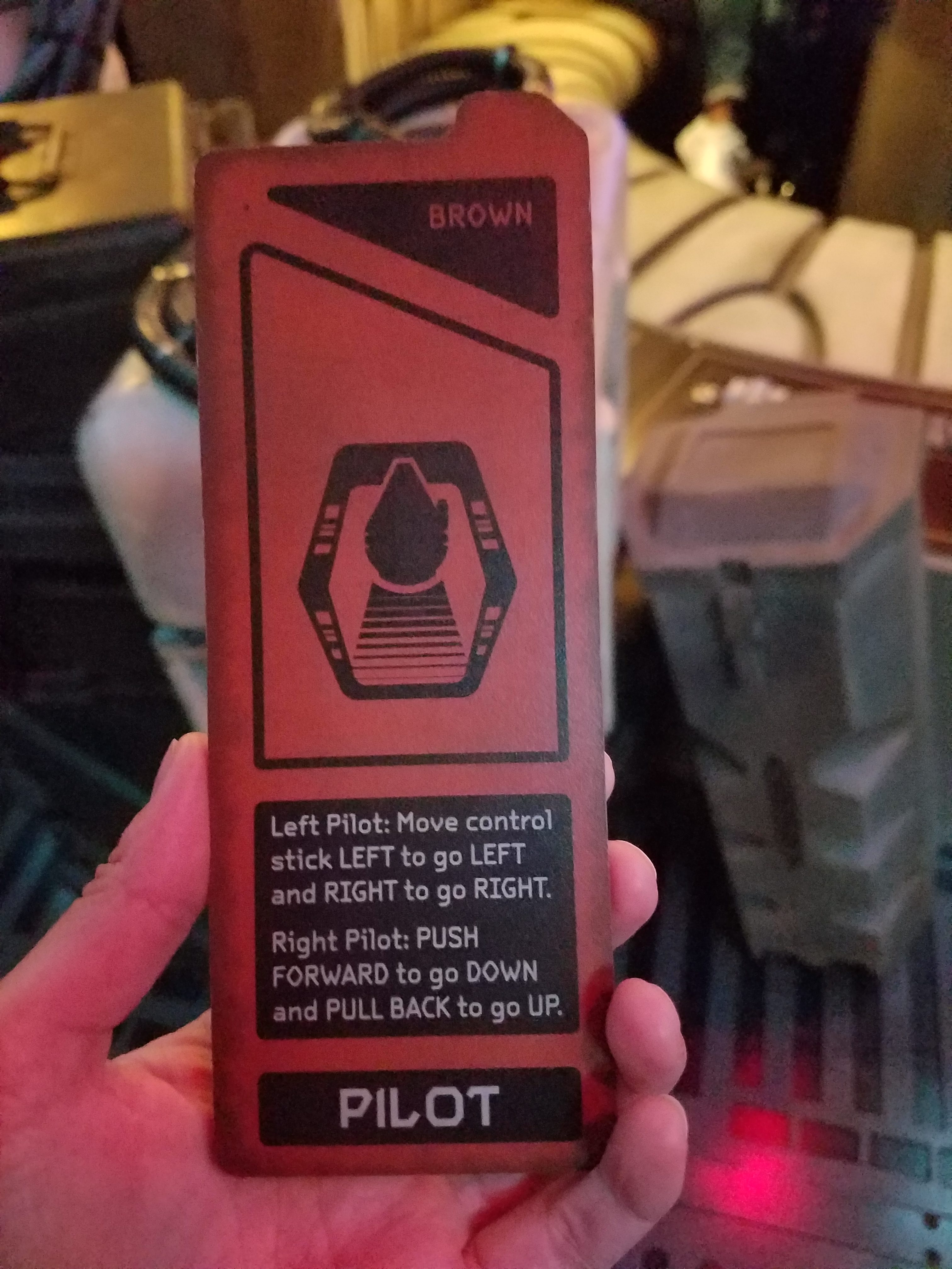 Once you get through the general queue, you go into a holding area, after which you are let into another holding area, where the animatronic Hondo talks to you. After he finishes his spiel, you go down a small hallway, at the end of which you are given one of three job assignments: Pilot, Gunner, or Engineer, of which there are two each. I had read that these would be given out randomly. However, there were two men in front of us who had apparently already been on the ride who knew that the jobs were given out in order — 2 Pilots, 2 Gunners, 2 Engineers — as they strategically let people in front of them so that they would both be given the Pilot position. That made Corgi and Diana Gunners, while Josh and I were Engineers.