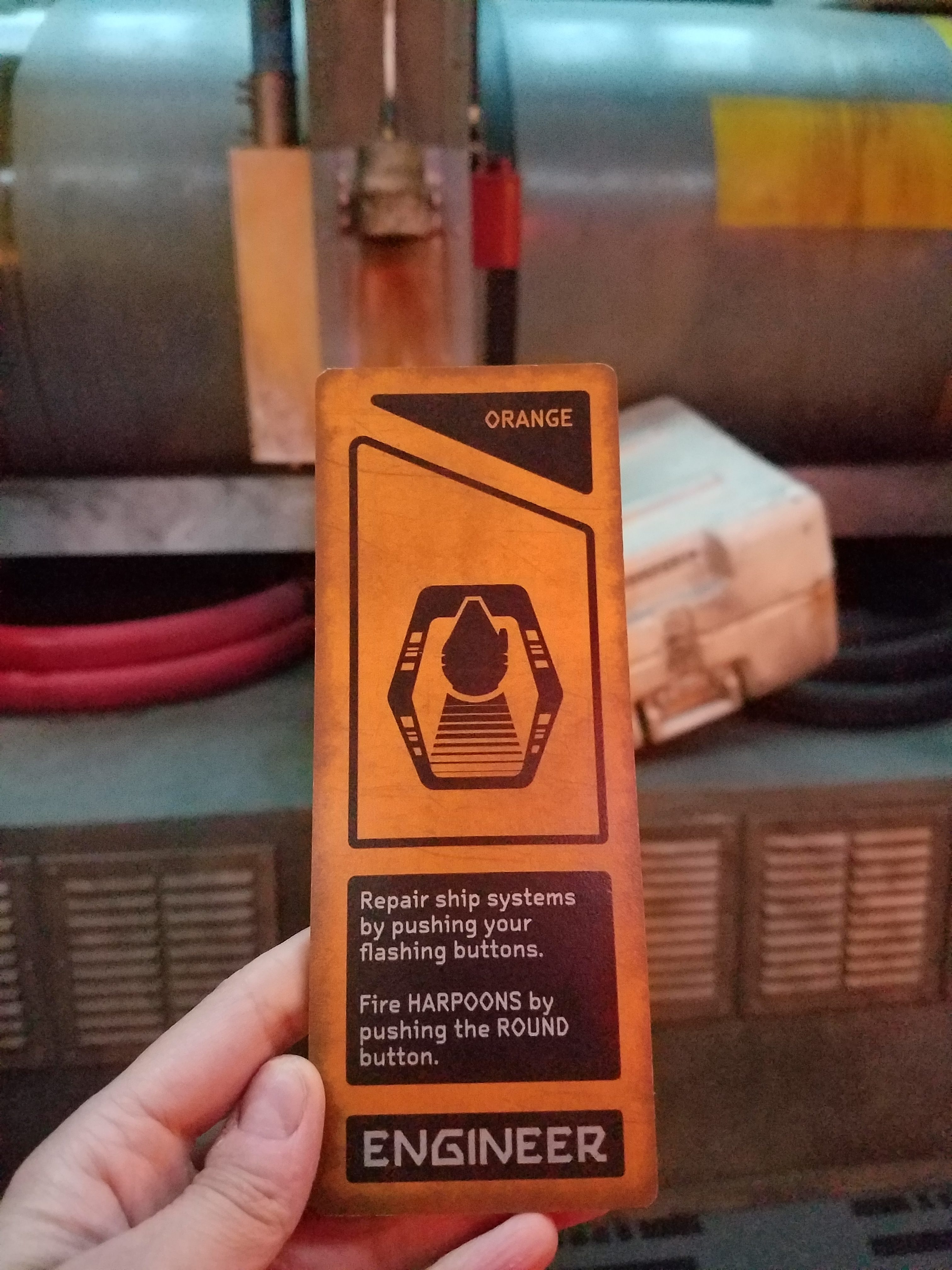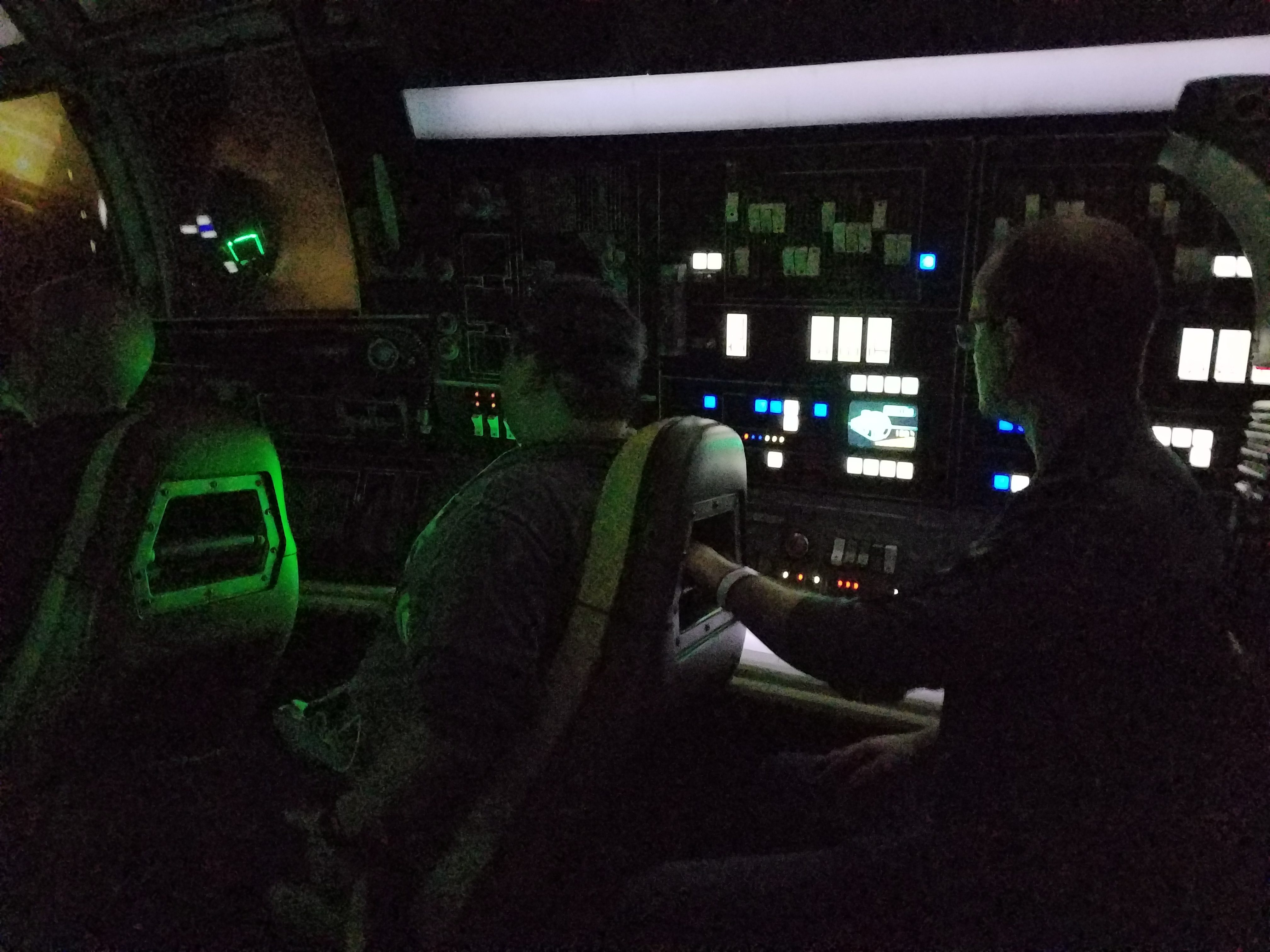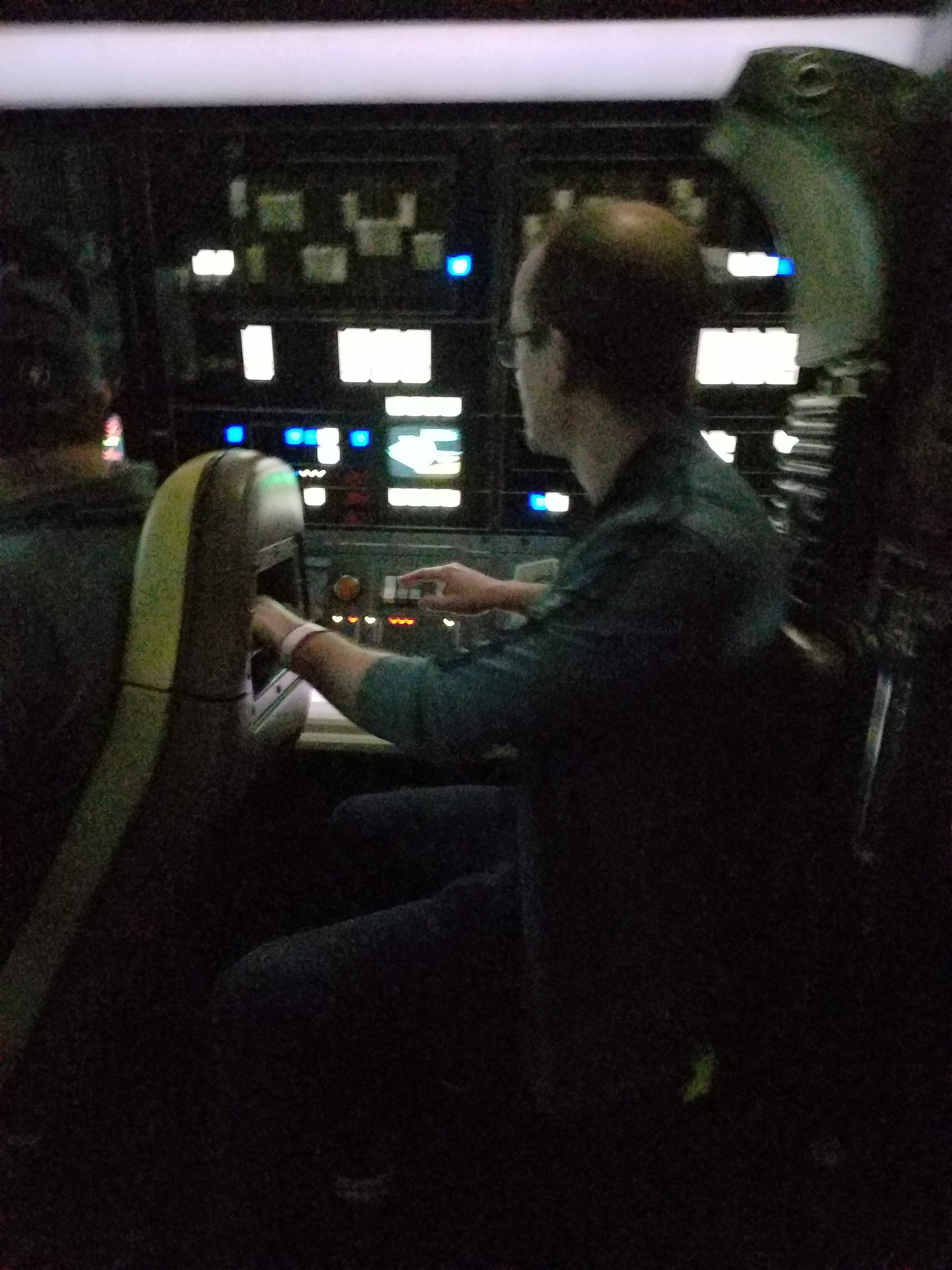 Once we got to the job assignments for the ride, they were again handed out in the same order. However, there were only 5 people in our group rather than 6. Since Josh and I were standing at the front of the next group, we were given the Pilot jobs, while Corgi and one other person were Gunners, and the fifth person was an Engineer. So we only had one Engineer. But Corgi had already been a Gunner, so Josh offered to switch with him.