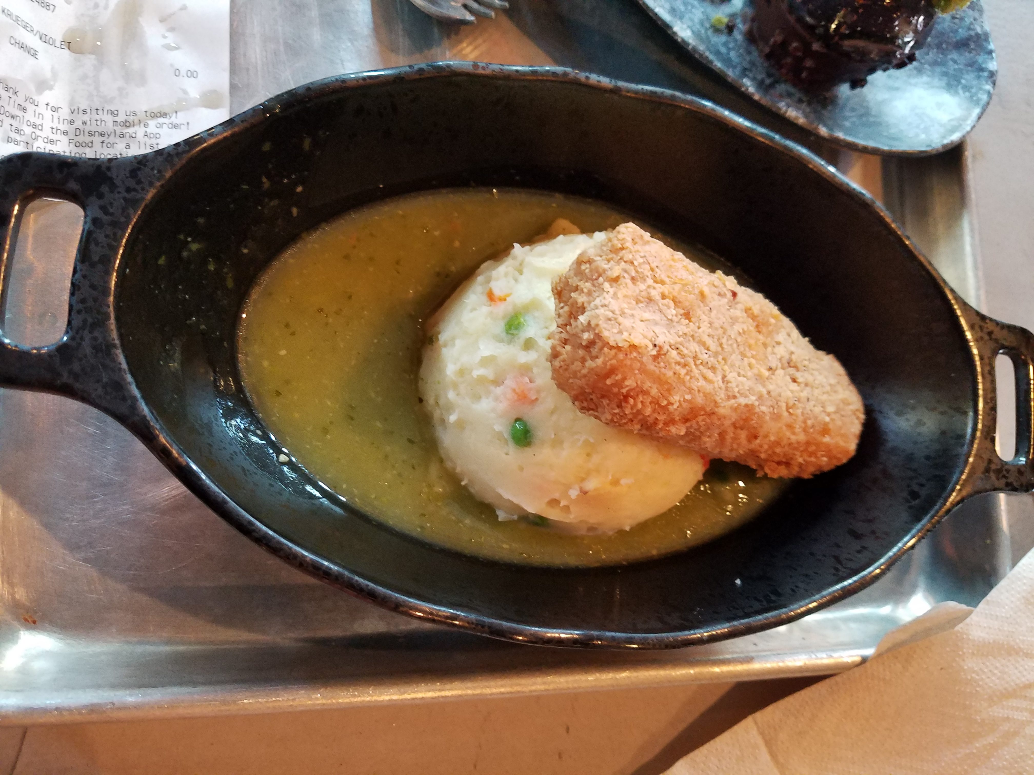 Josh and I ordered the Fried Endorian Tip Yip, a Batuu-bon, Moof Juice, and a Coke. We both really liked the Fried Endorian Tip Yip, which was crispy chicken that came with roasted vegetable potato mash in an herb gravy. There was some sort of seasoning to it that we couldn’t quite identify. The Batuu-bon was a delicious treat made of chocolate cake, white chocolate mousse, and coffee custard, but even though it has coffee in it, and Josh hates coffee, apparently it wasn’t enough to bother him, as both Josh and I liked it! There are plenty more drinks I need to try in Batuu, but so far Moof Juice (made of Simply Fruit Punch®, Simply Orange® with Pineapple and Chipotle-Pineapple) is my favorite! Josh isn’t really into fruity flavored drinks, so he didn’t have any interest in trying it, so he just got a Coke. But even the Coke has a special themed cup that it comes in!
